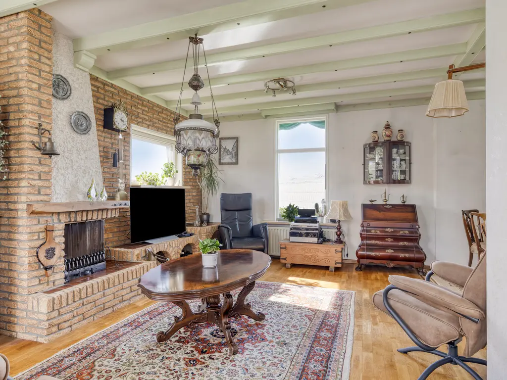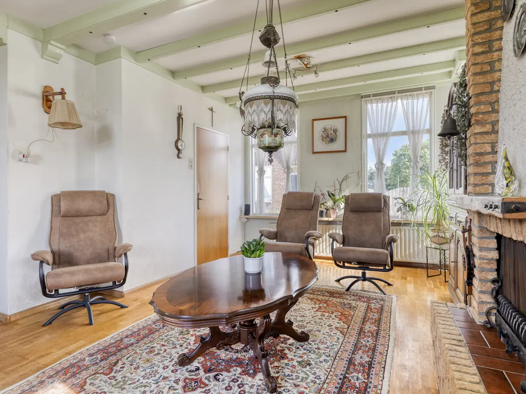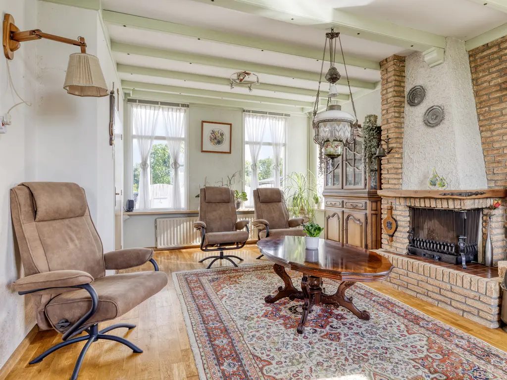 De ruime woonkamer in L-vorm (ca. 28 m2) biedt ruimte en sfeer. Authentieke plafondbalken en de houten open haard zorgen voor een warme uitstraling, terwijl de klassieke parketvloer de karakteristieke stijl van 1923 benadrukt. Dankzij de grote raampartijen is de kamer heerlijk licht. Het slimme L-formaat maakt het bovendien mogelijk om een gezellig eetgedeelte te creëren, ideaal voor lange avonden tafelen met familie en vrienden. Via de woonkamer is het souterrain bereikbaar.