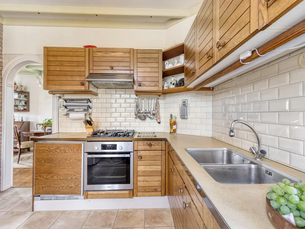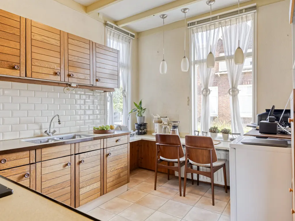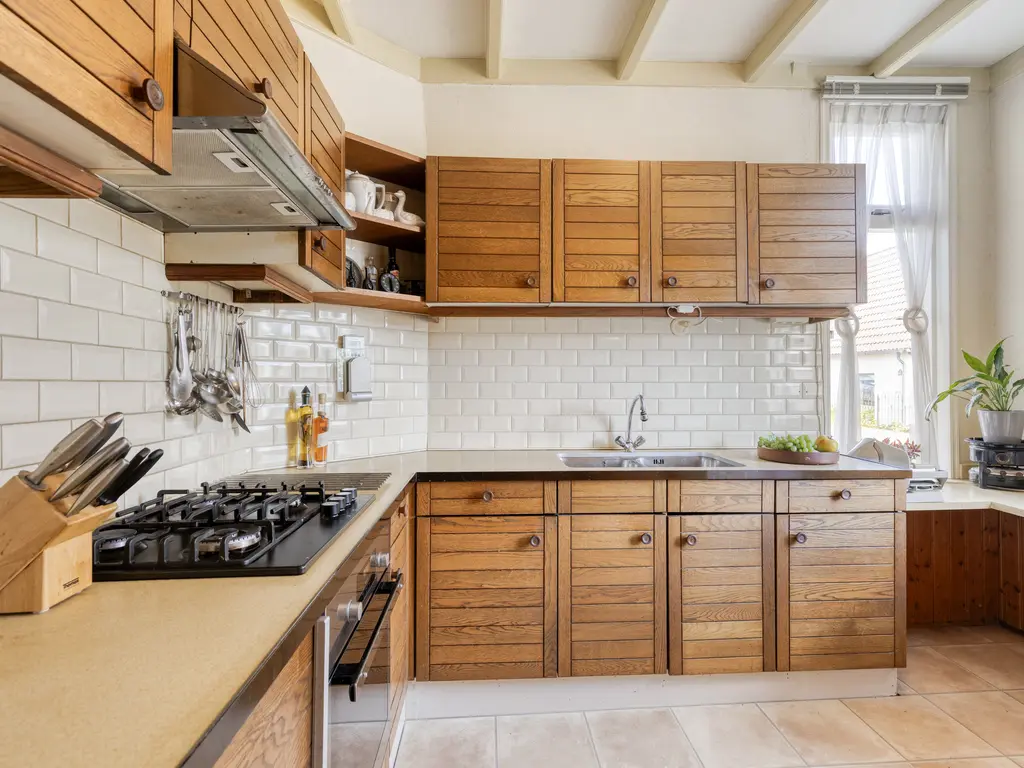 Aan de voorzijde van de woning bevindt zich de keuken (ca. 10 m2), uitgevoerd met een praktische L-vormige opstelling. Hoewel modernisering wenselijk is, is de keuken functioneel en compleet ingericht met onder andere een 4-pits gaskookplaat, oven, koelkast, afzuigsysteem, dubbele spoelbak en een close-in boiler. Dankzij de indeling is er voldoende werk- en bergruimte, en kunt u de keuken geheel naar eigen smaak en stijl vernieuwen.