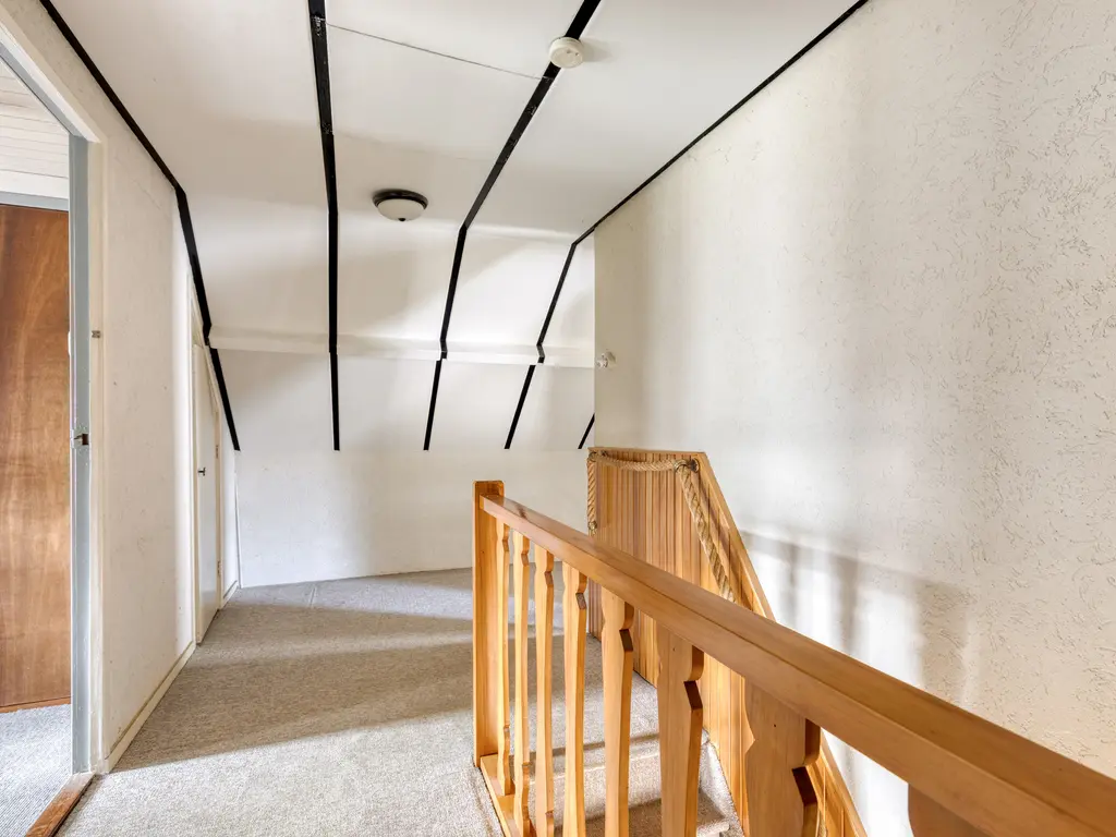 Ruime overloop met een bergkast en toegang tot alle vertrekken. De overloop is afgewerkt met vloerbedekking.