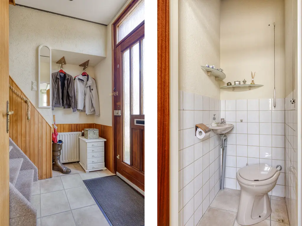 Entree, hal met meterkast, trap naar de 1e verdieping. Toiletruimte voorzien van een duoblok en fonteintje. De toiletruimte is gedeeltelijk betegeld in een lichte kleurstelling.