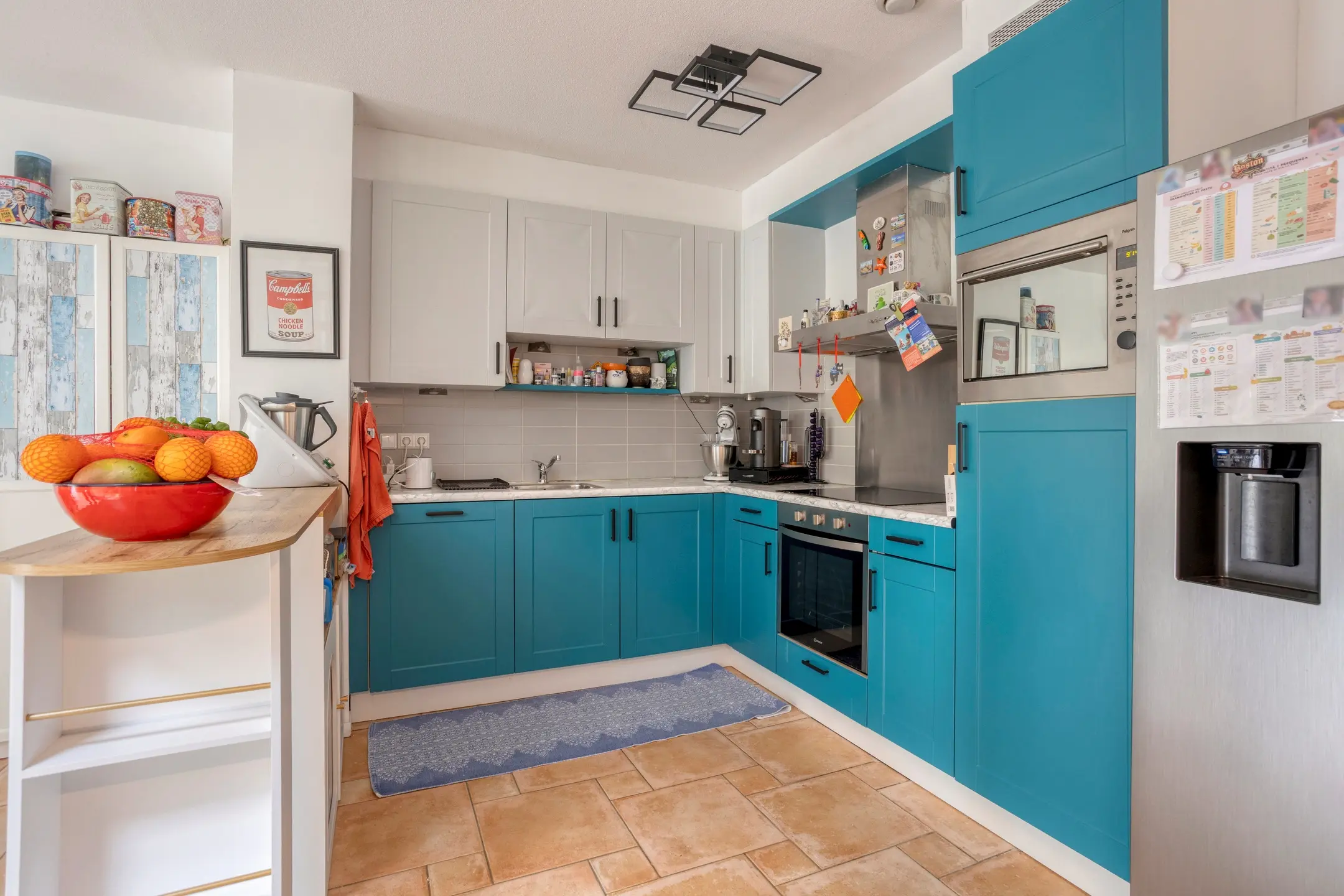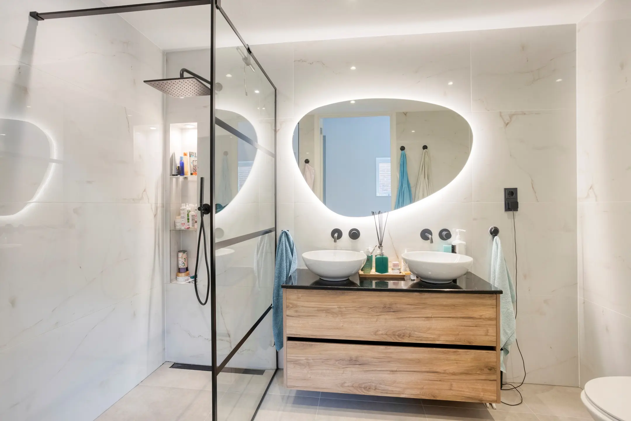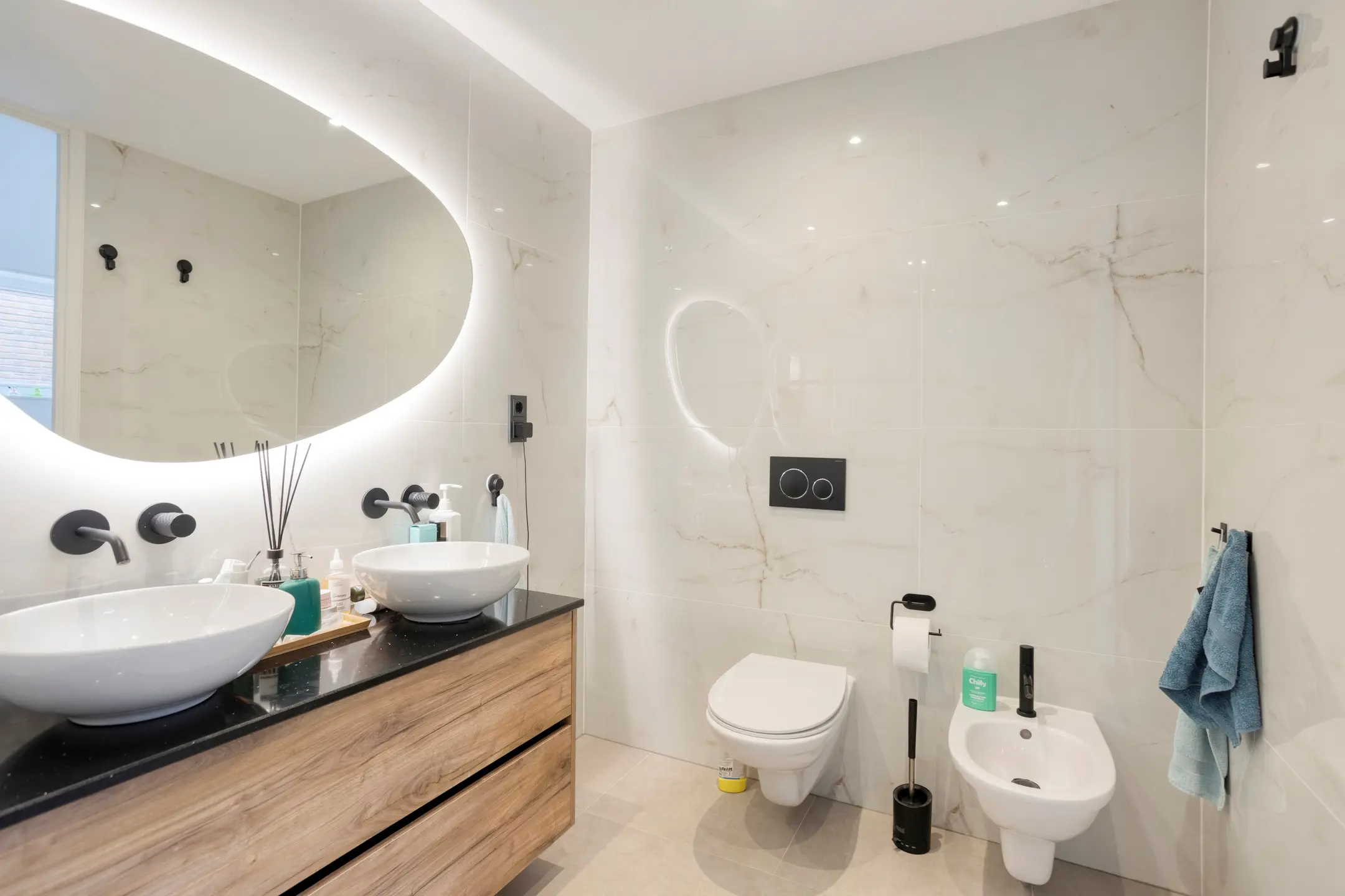 Three bedrooms, including a master bedroom. One of the bedrooms is currently used as a workspace and offers access to the roof terrace. The modern bathroom is fitted with a walk-in shower, double washbasin, bidet, and toilet.