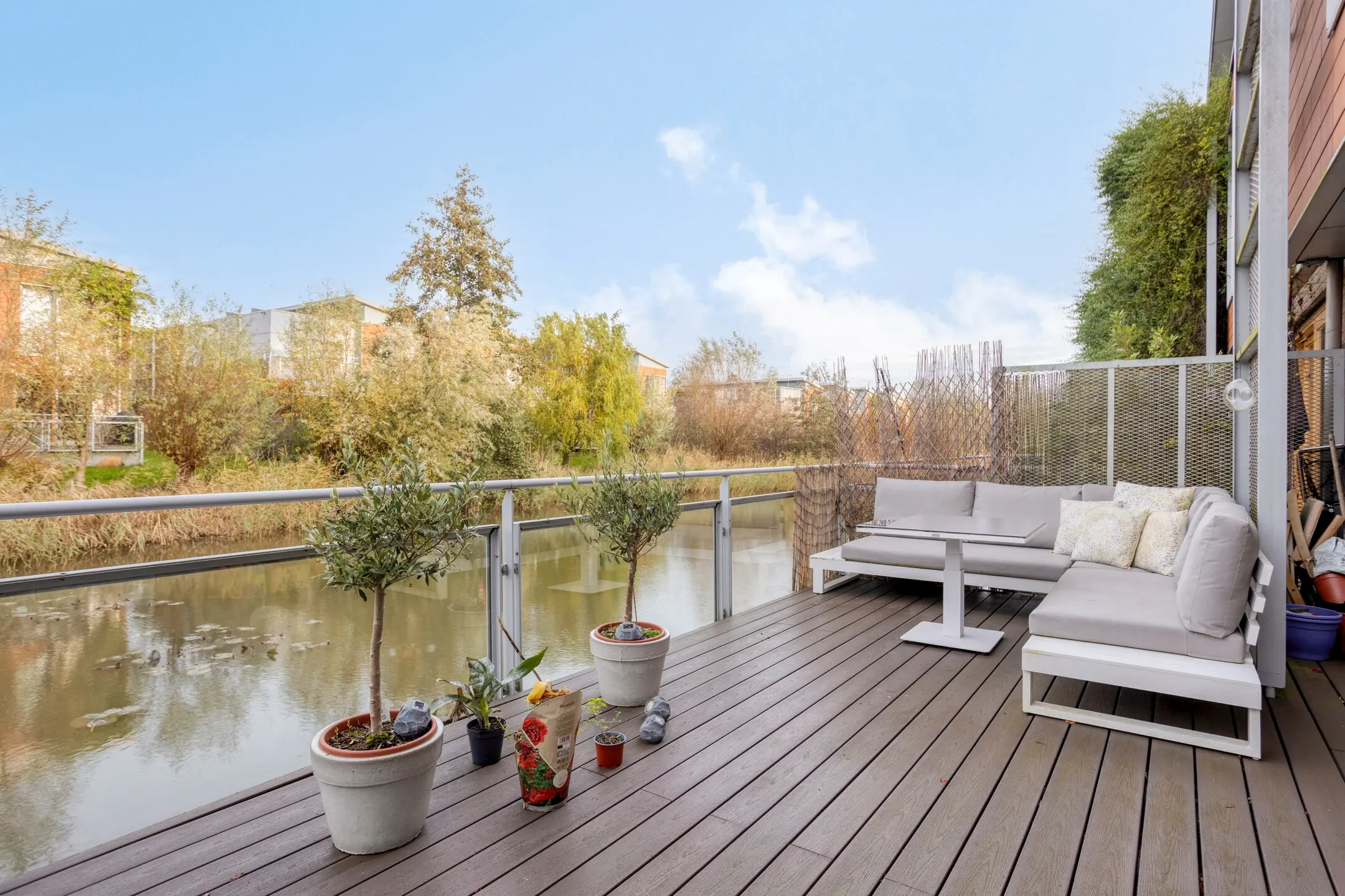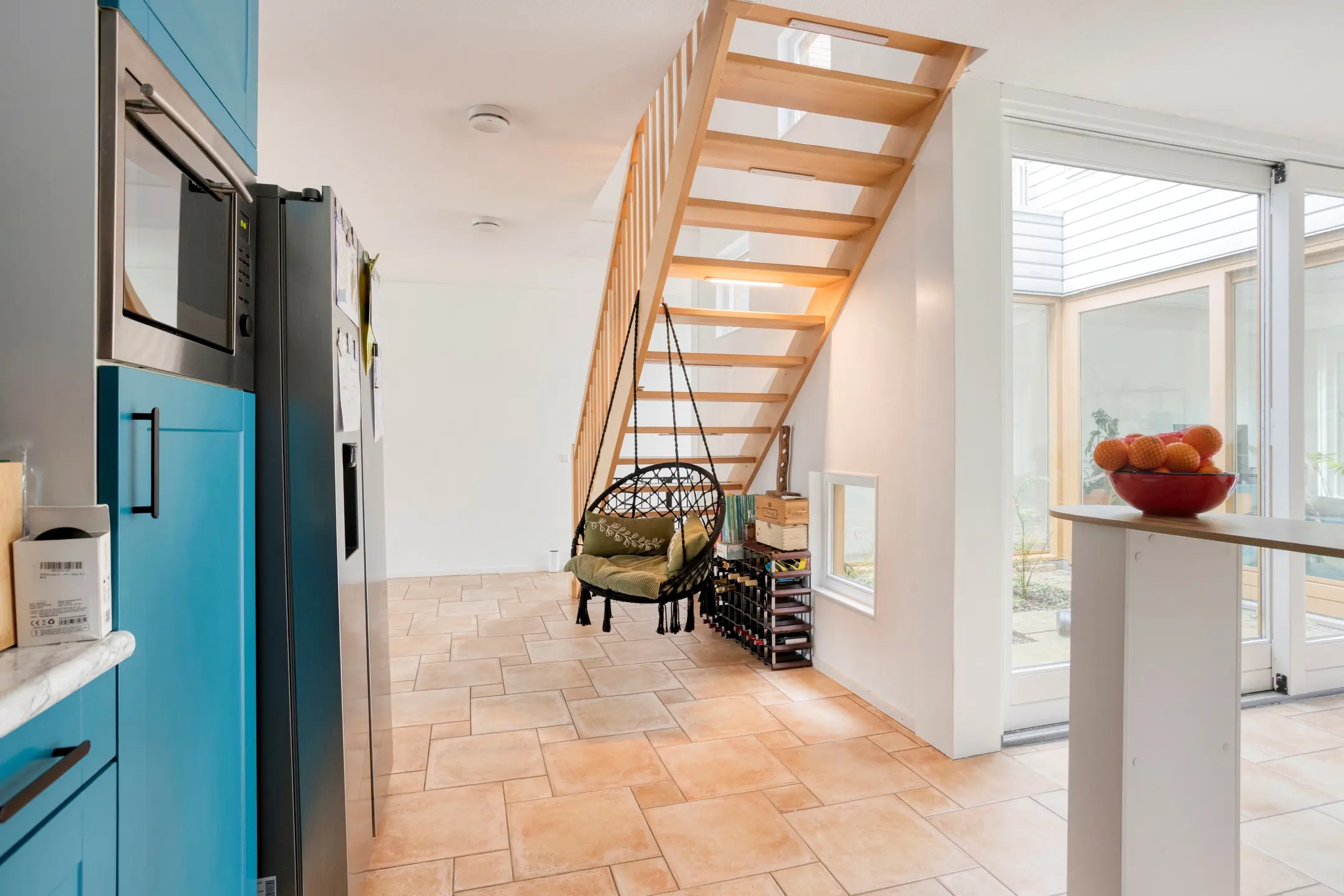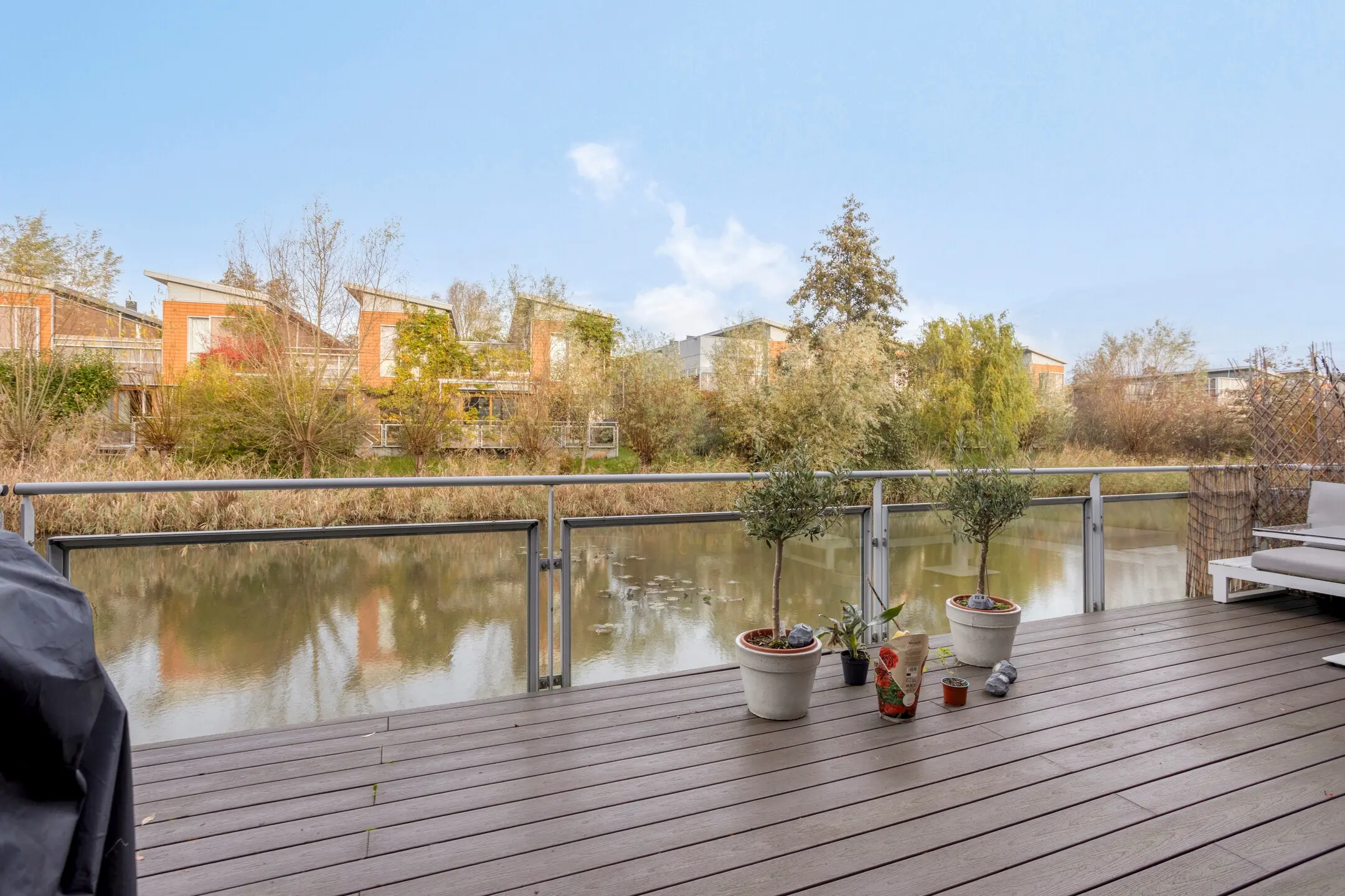 Entrance with hallway and access to the modern toilet and internal storage room. The sunny and atmospheric living room is situated around an inner garden (the patio), which provides plenty of natural light. Modern open kitchen equipped with various built-in appliances including a dishwasher, induction hob, extractor hood, oven, and microwave. In addition, there is a separate fridge with freezer. From the living room, there is access to the well-maintained terrace by the water.