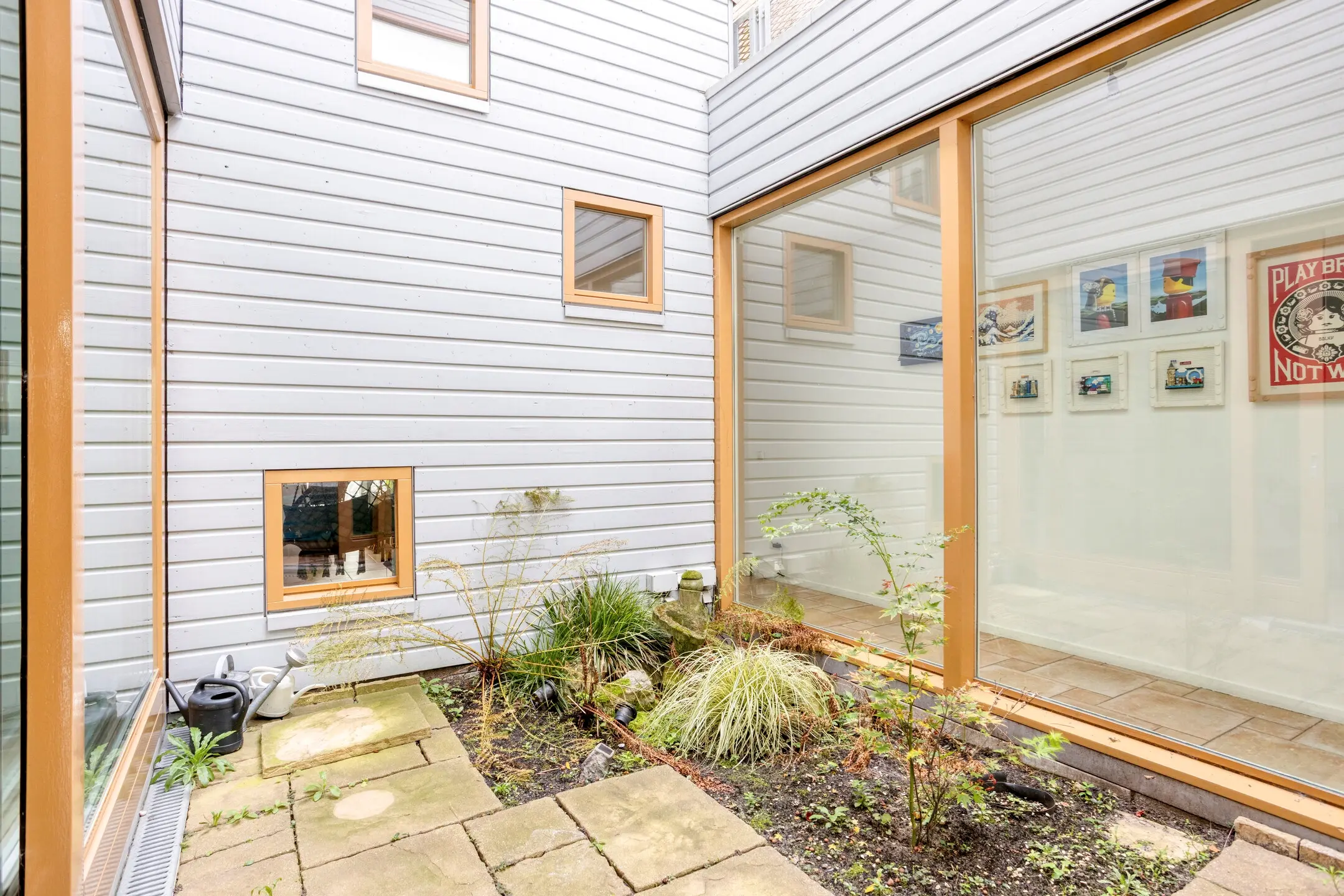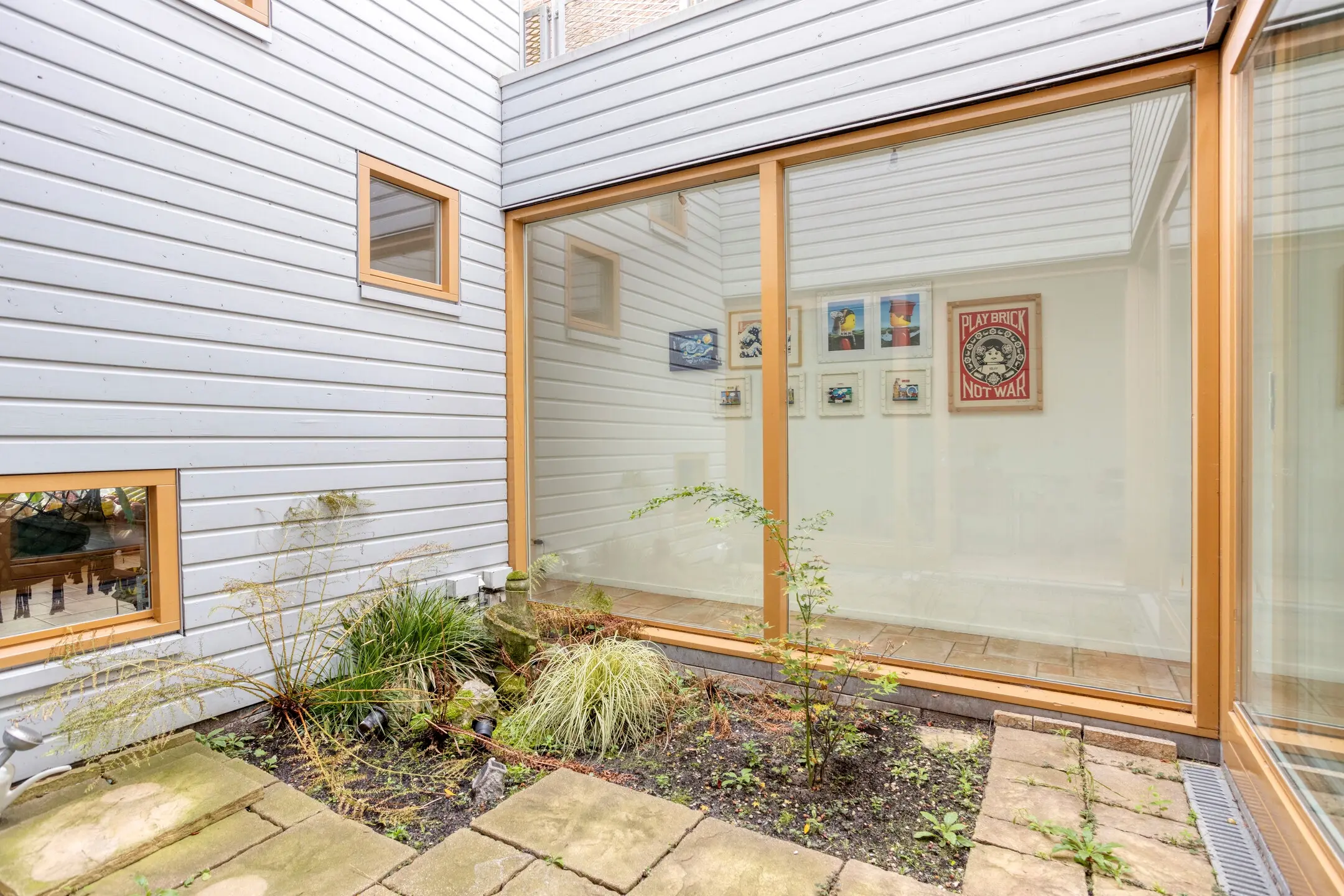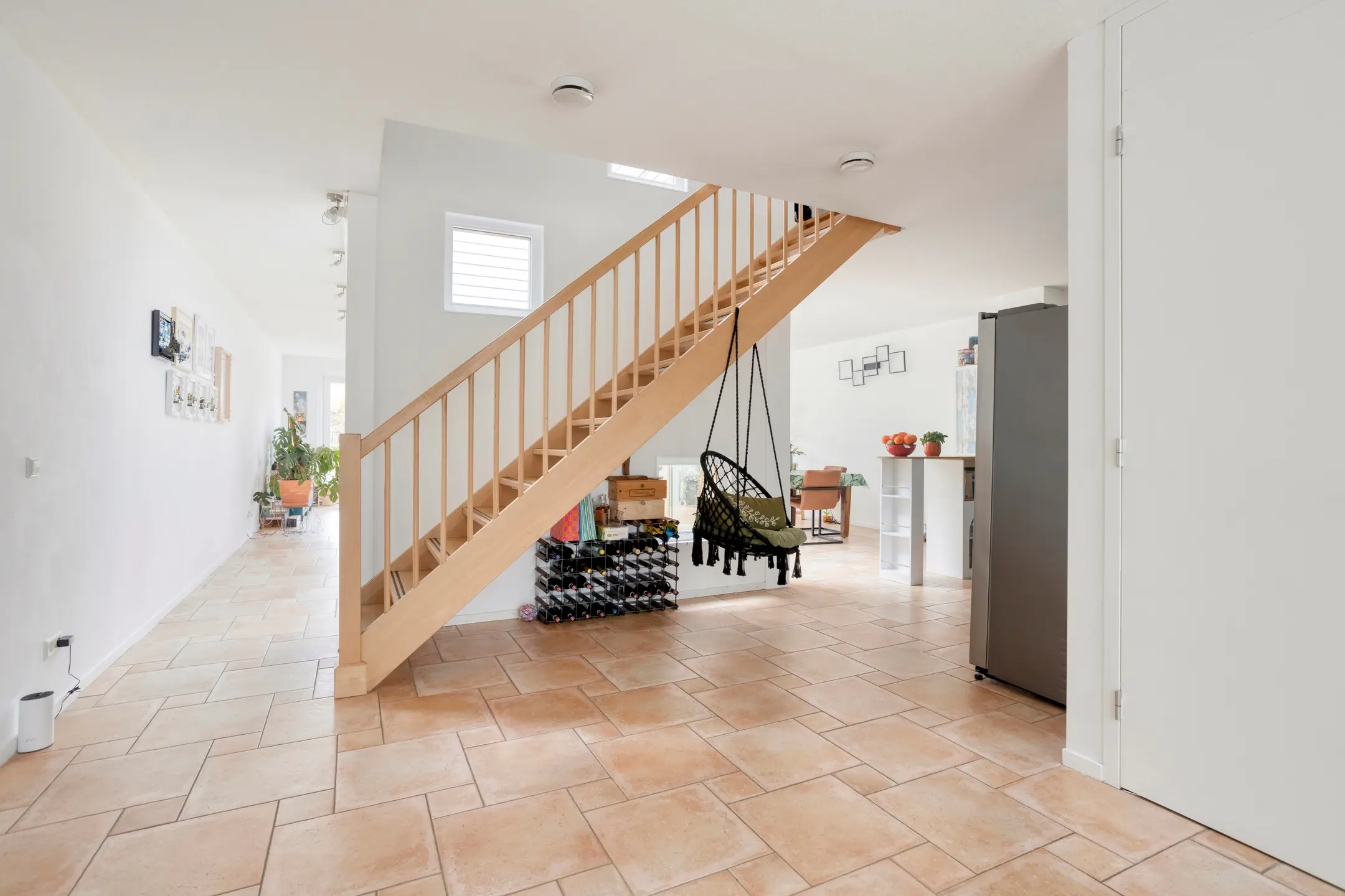Entrance with hallway and access to the modern toilet and internal storage room. The sunny and atmospheric living room is situated around an inner garden (the patio), which provides plenty of natural light. Modern open kitchen equipped with various built-in appliances including a dishwasher, induction hob, extractor hood, oven, and microwave. In addition, there is a separate fridge with freezer. From the living room, there is access to the well-maintained terrace by the water.