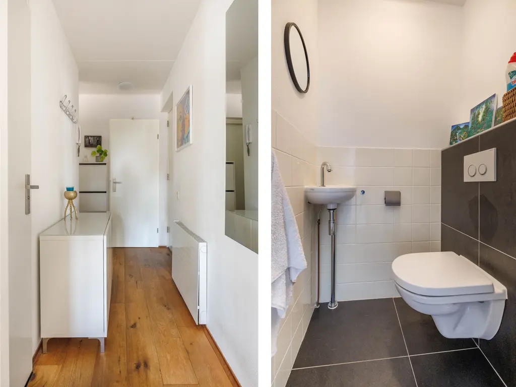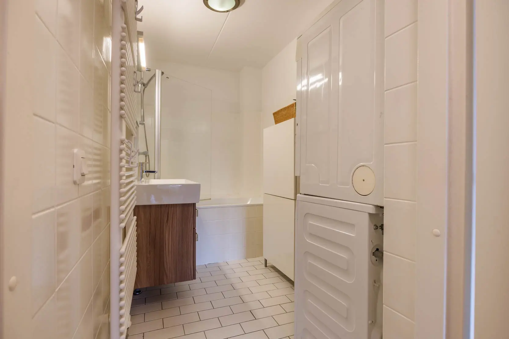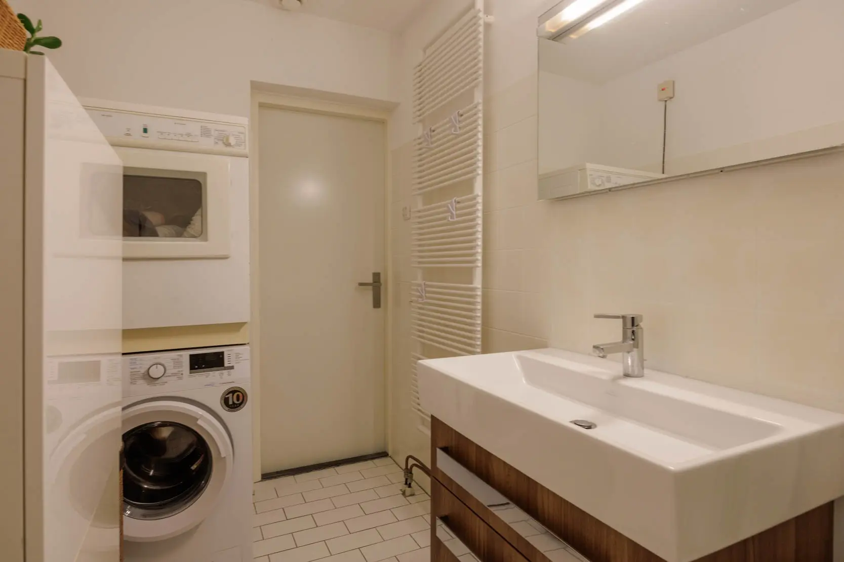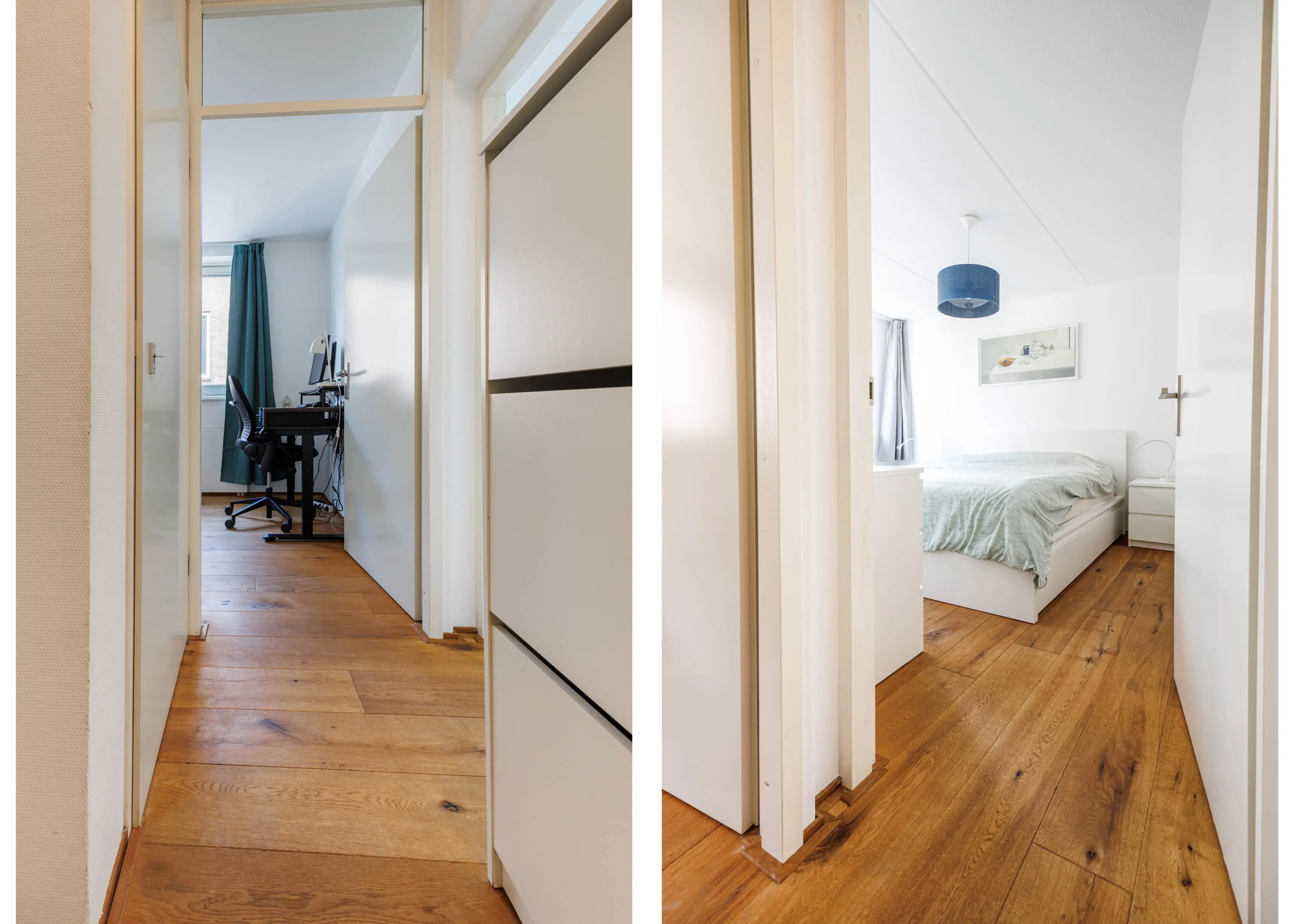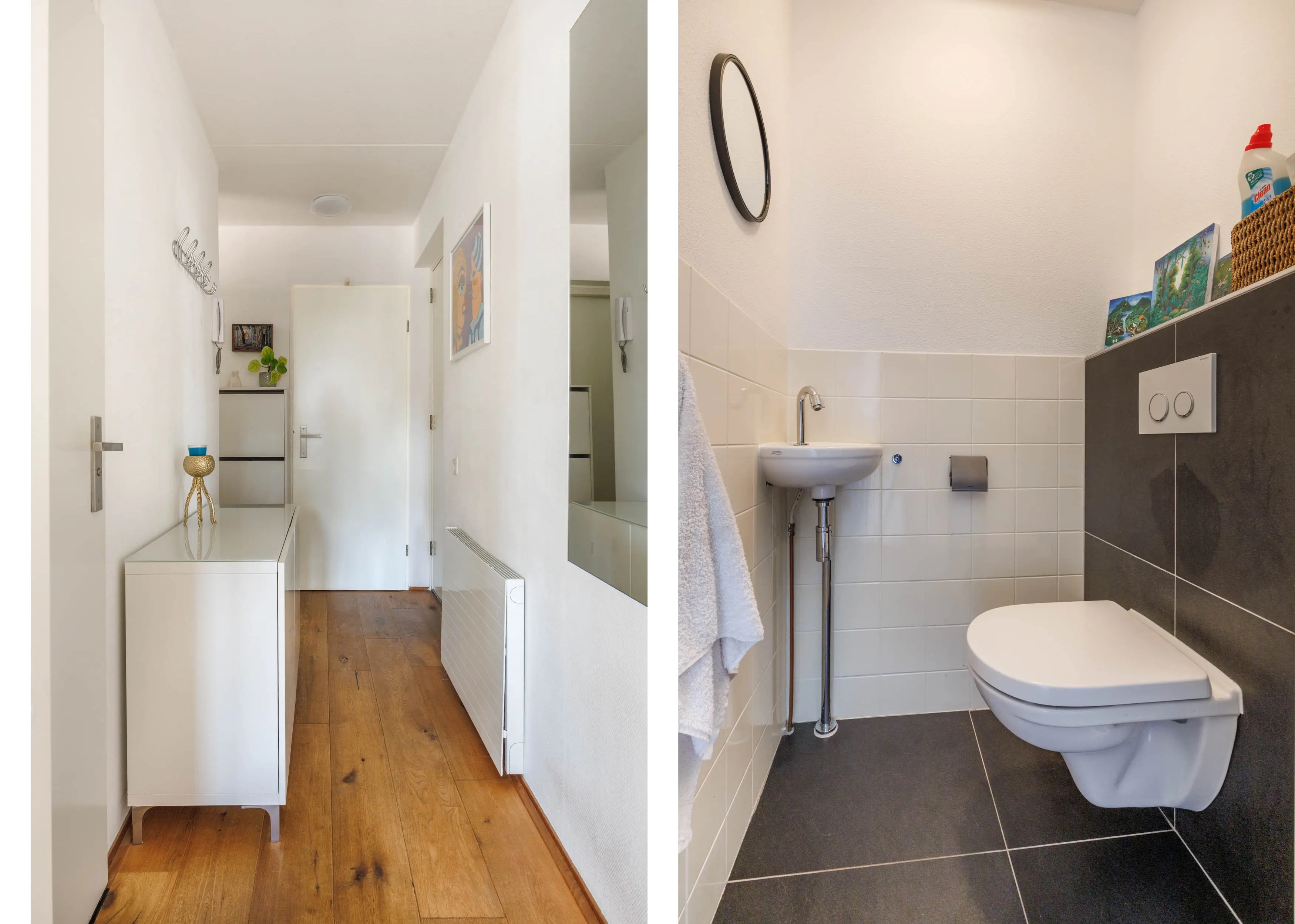 Through the hallway, you reach two comfortable and well-sized bedrooms. The bathroom includes a bathtub/shower combination, washbasin with mirror, mechanical ventilation, design radiator, and connections for a washing machine and dryer. In the hallway, you’ll also find a modern separate toilet with a small sink, the meter cupboard, and the central heating system (neatly enclosed in a cabinet).