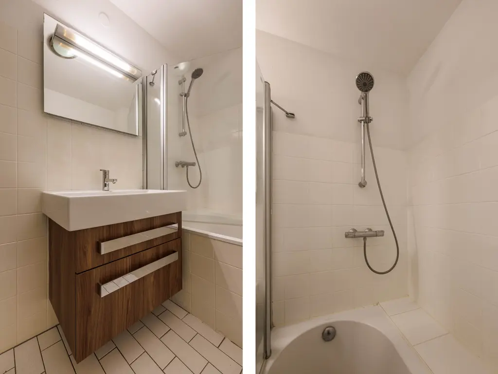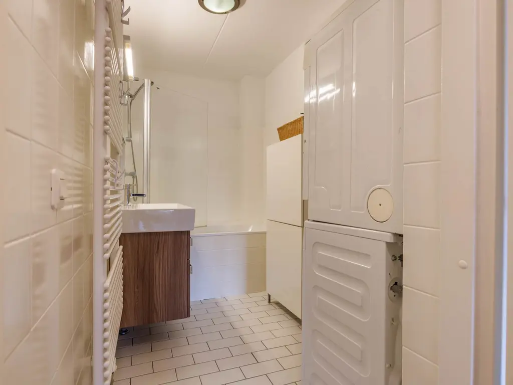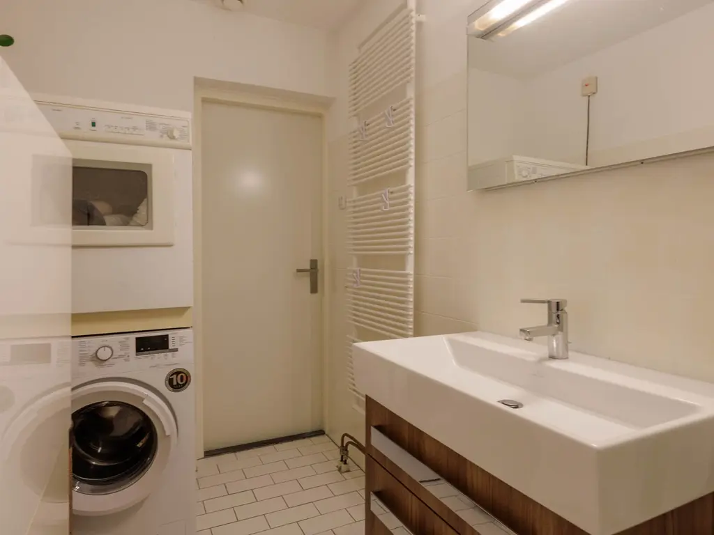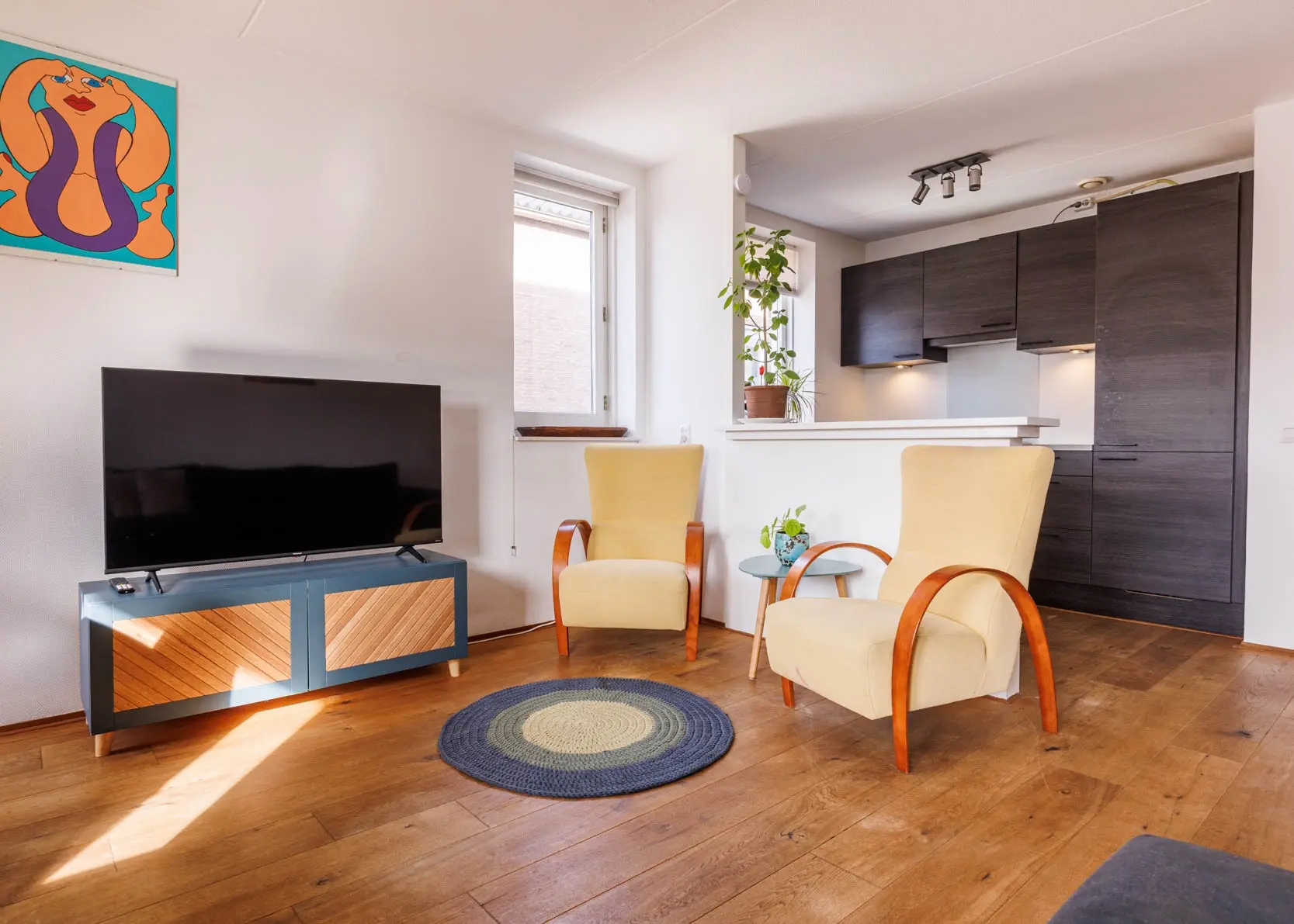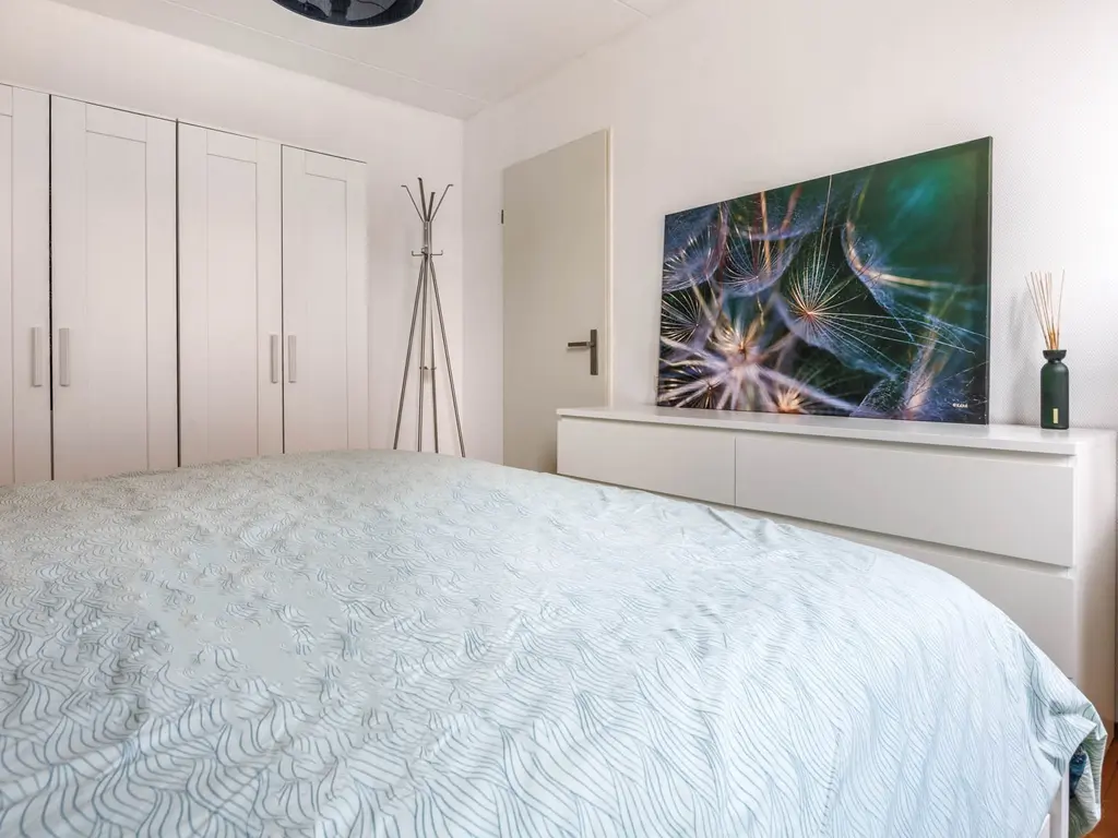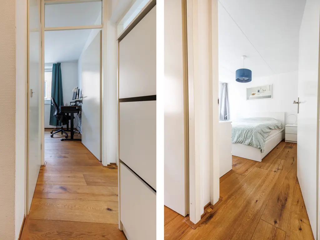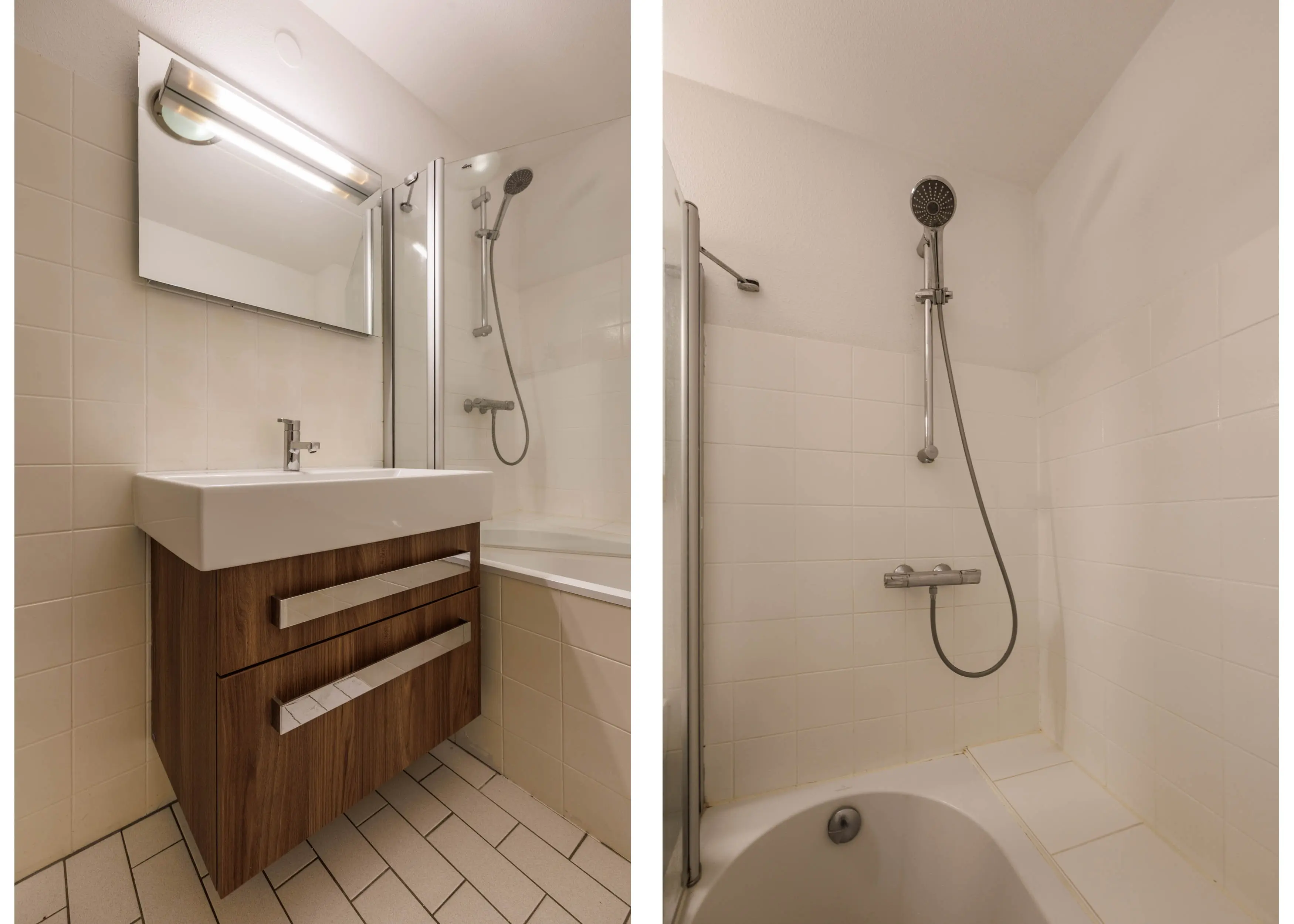 Through the hallway, you reach two comfortable and well-sized bedrooms. The bathroom includes a bathtub/shower combination, washbasin with mirror, mechanical ventilation, design radiator, and connections for a washing machine and dryer. In the hallway, you’ll also find a modern separate toilet with a small sink, the meter cupboard, and the central heating system (neatly enclosed in a cabinet).