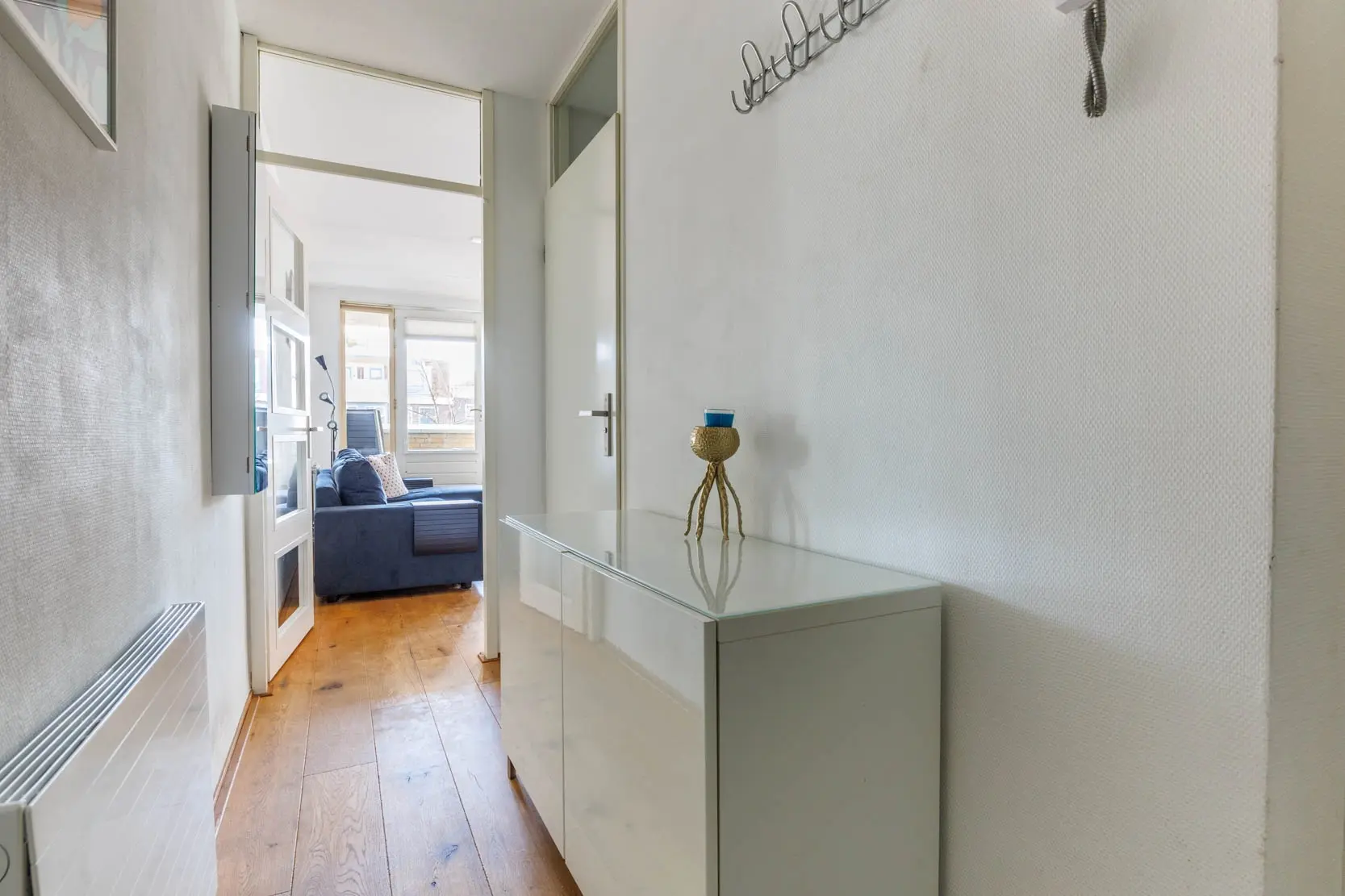 Entree appartement: ruime hal met toegang tot de 2 slaapkamers, de badkamer, het toilet , een vaste kasten en de fijne woonkamer.