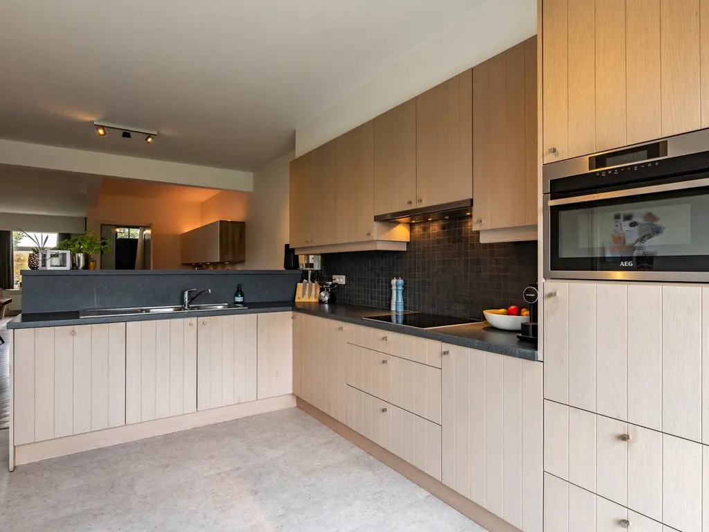De ontbijthoek biedt zicht op de tuin en via de schuifpui stapt u bij mooi weer zo naar buiten.