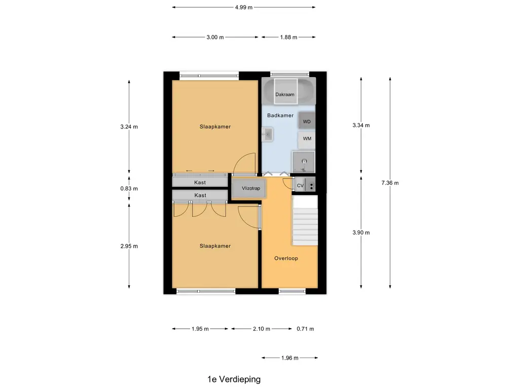 Via de trap in de hal bereikt u de eerste verdieping, waar zich twee slaapkamers en de badkamer bevinden. Boven aan de trap komt u op een overloop met ruimte voor een kleine kast. Dankzij het aanwezige raam valt hier prettig daglicht binnen, wat zorgt voor een lichte en aangename uitstraling.