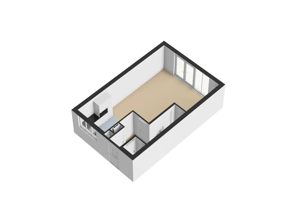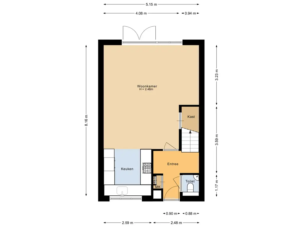 Ruime woonkamer met openslaande deuren naar de achtertuin. Open keuken aan de voorzijde. Entree met toilet, meterkast en trapkast.