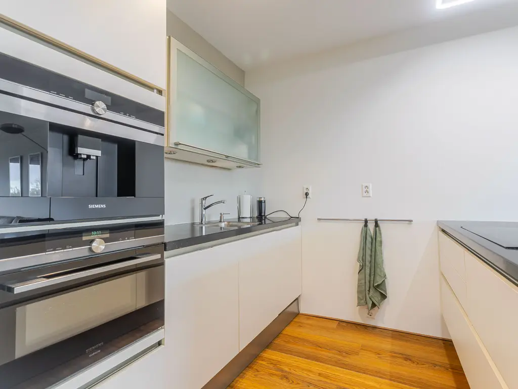 De open Siematic-keuken vormt het hart van de woning en is voorzien van diverse inbouwapparaten en een stijlvol donker werkblad. Hier kun je met gemak en plezier koken voor familie of vrienden. In de woonkamer bevindt zich tevens een praktische wasruimte met aansluiting voor de wasmachine en droger.