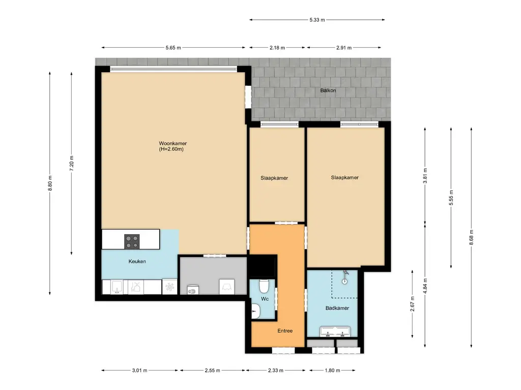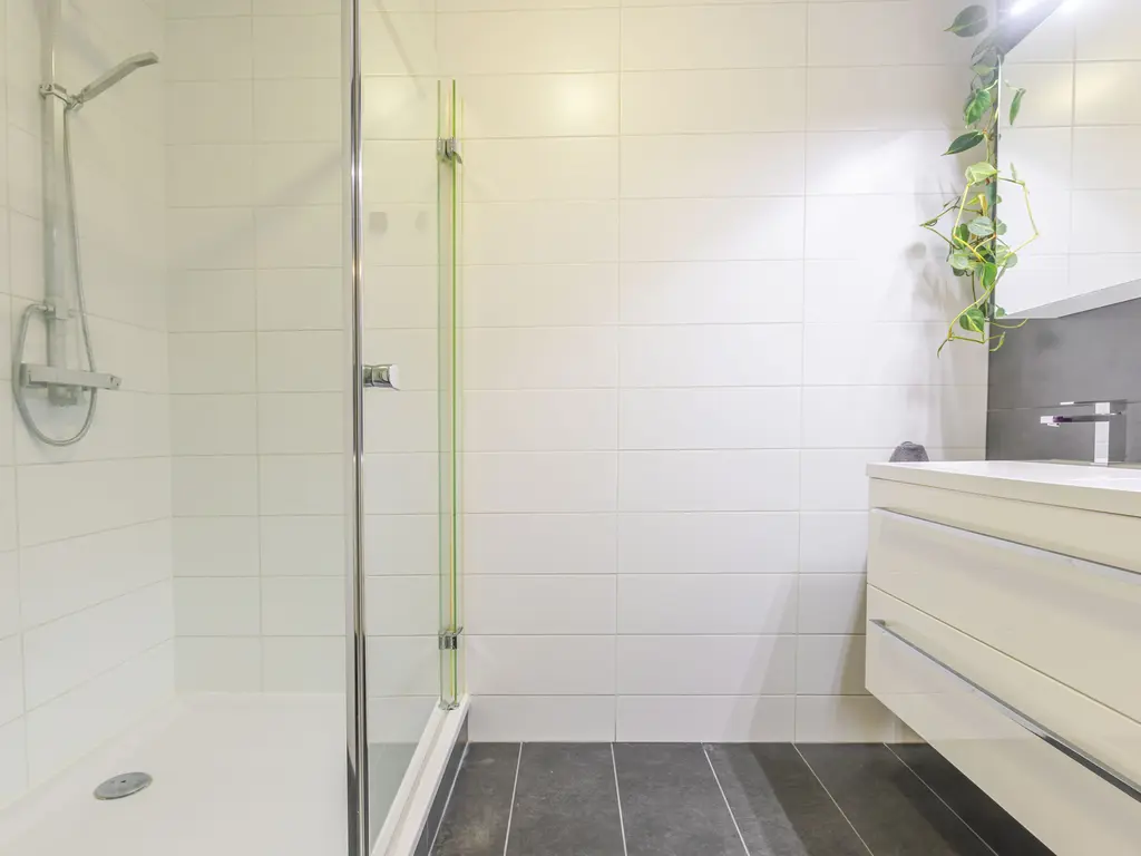 Het appartement beschikt over twee goed bemeten slaapkamers, beide met toegang tot het balkon. De moderne badkamer is uitgerust met een ruime inloopdouche, dubbele wastafel met meubel en een stijlvolle betegeling in wit en antraciet. Daarnaast is er een separaat toilet aanwezig in de hal.