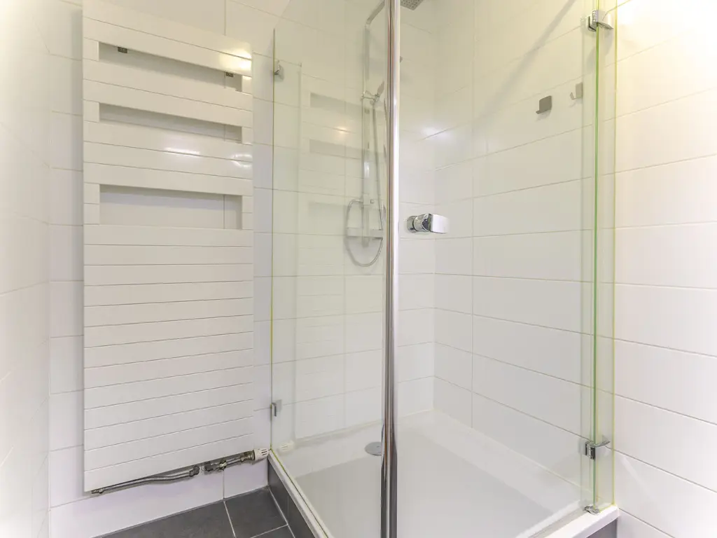 The apartment offers two well-proportioned bedrooms, both with access to the balcony. The modern bathroom is fitted with a spacious walk-in shower, double washbasin with cabinet, and elegant tiling in white and anthracite tones. There is also a separate toilet in the hallway.