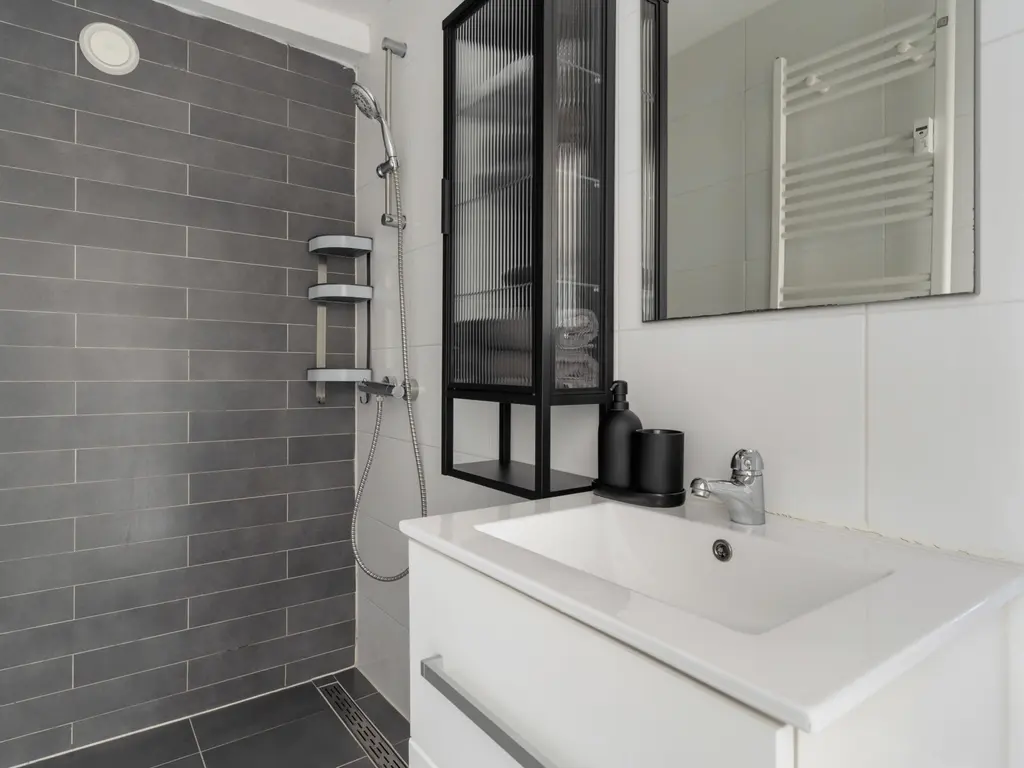 Moderne badkamer met inloopdouche, wastafel(-kom) en aansluiting voor de wasmachine.
