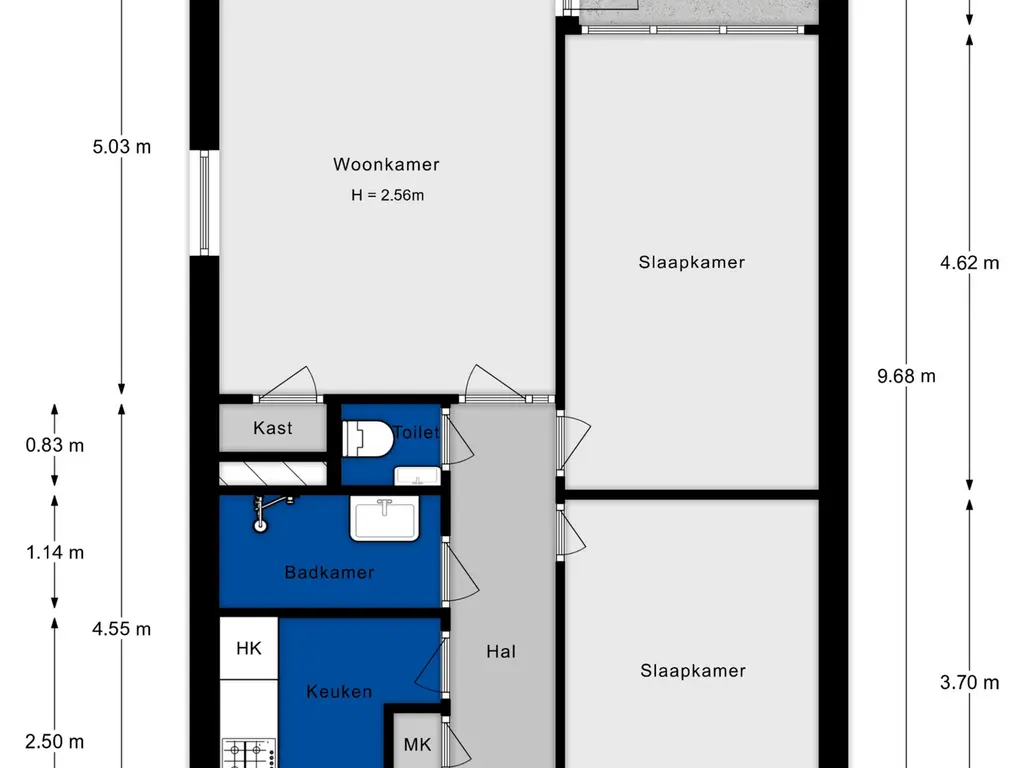 Hall with meter cupboard, wardrobe, toilet, and access to the kitchen, bedrooms, bathroom, and living room.