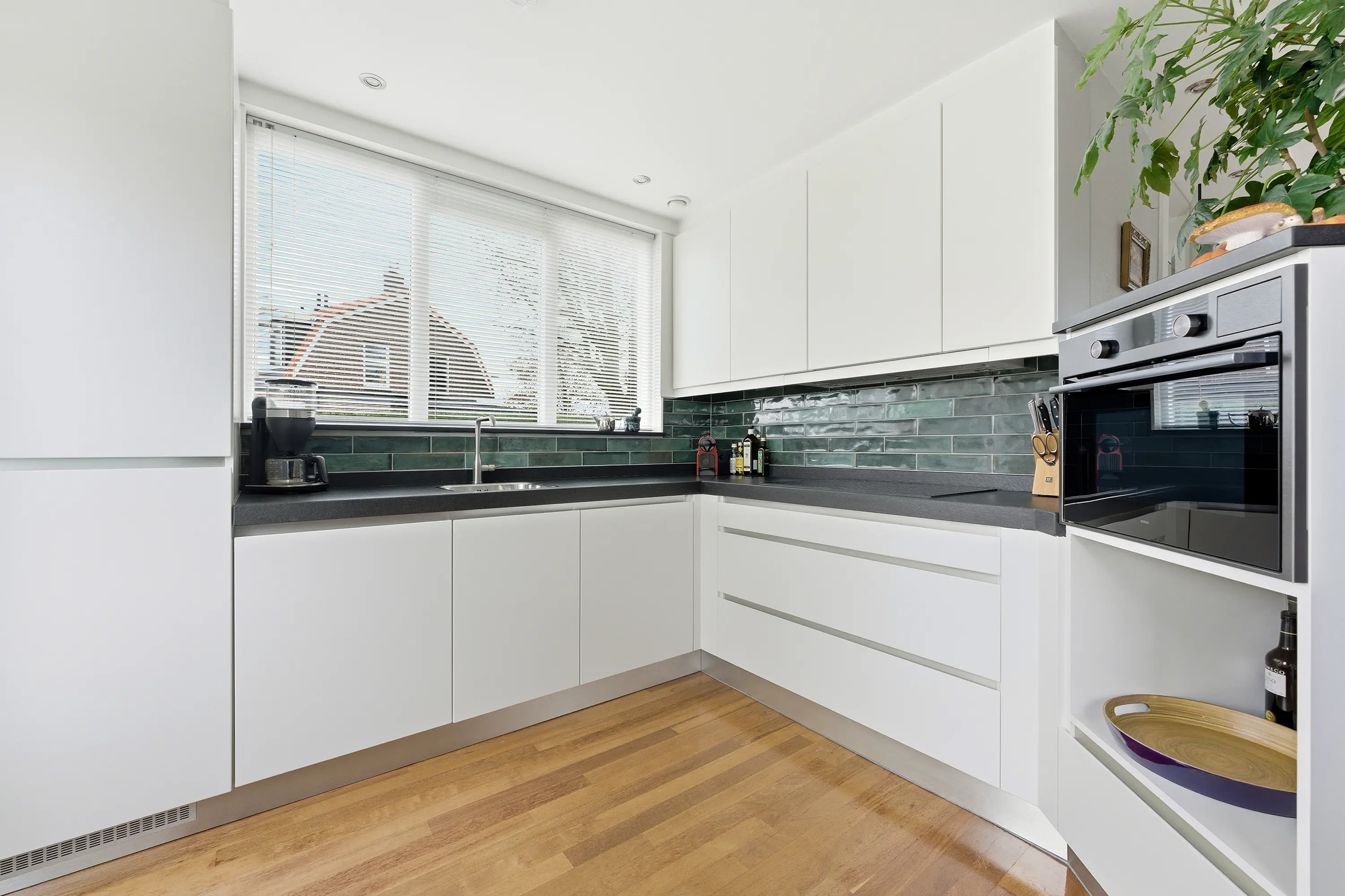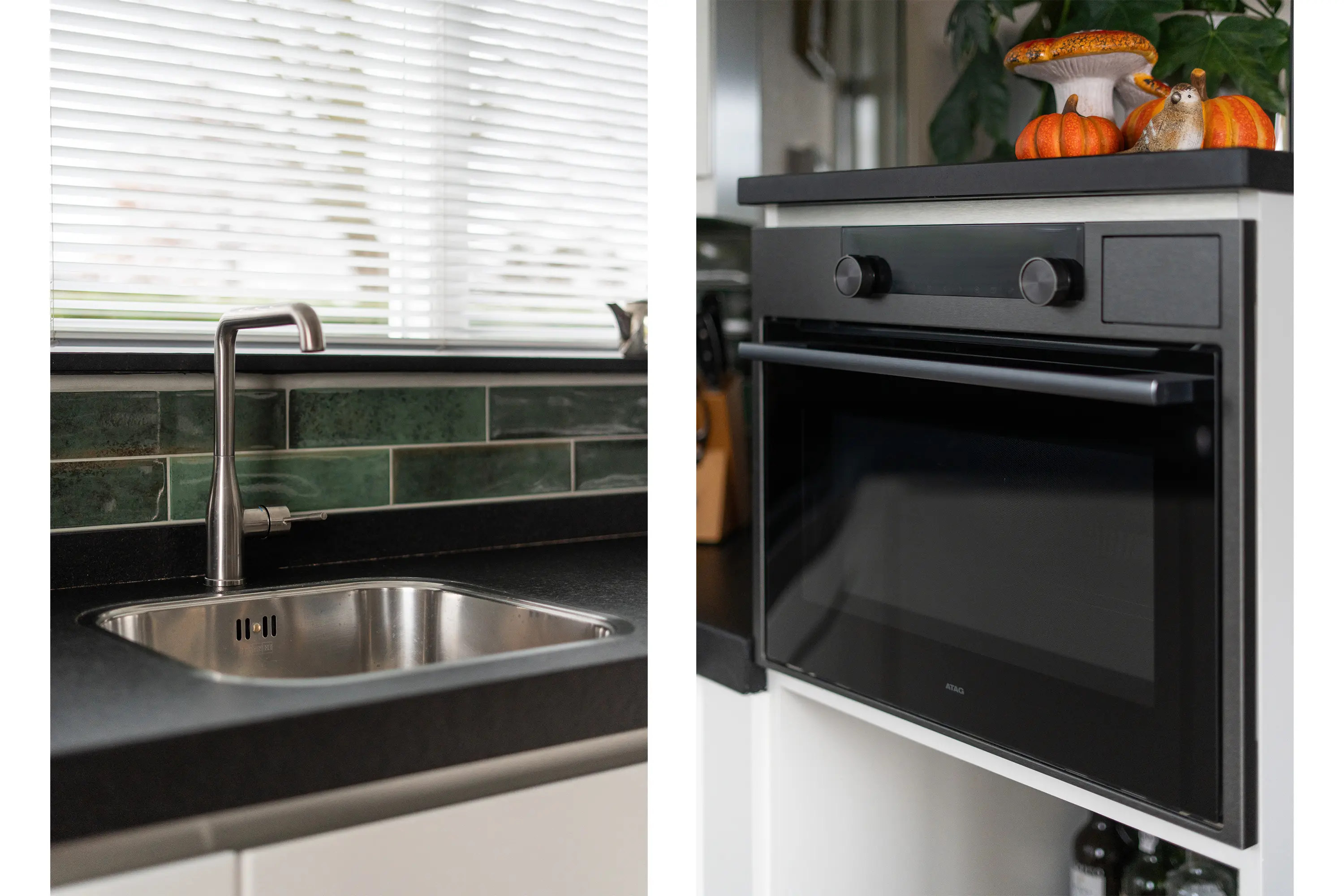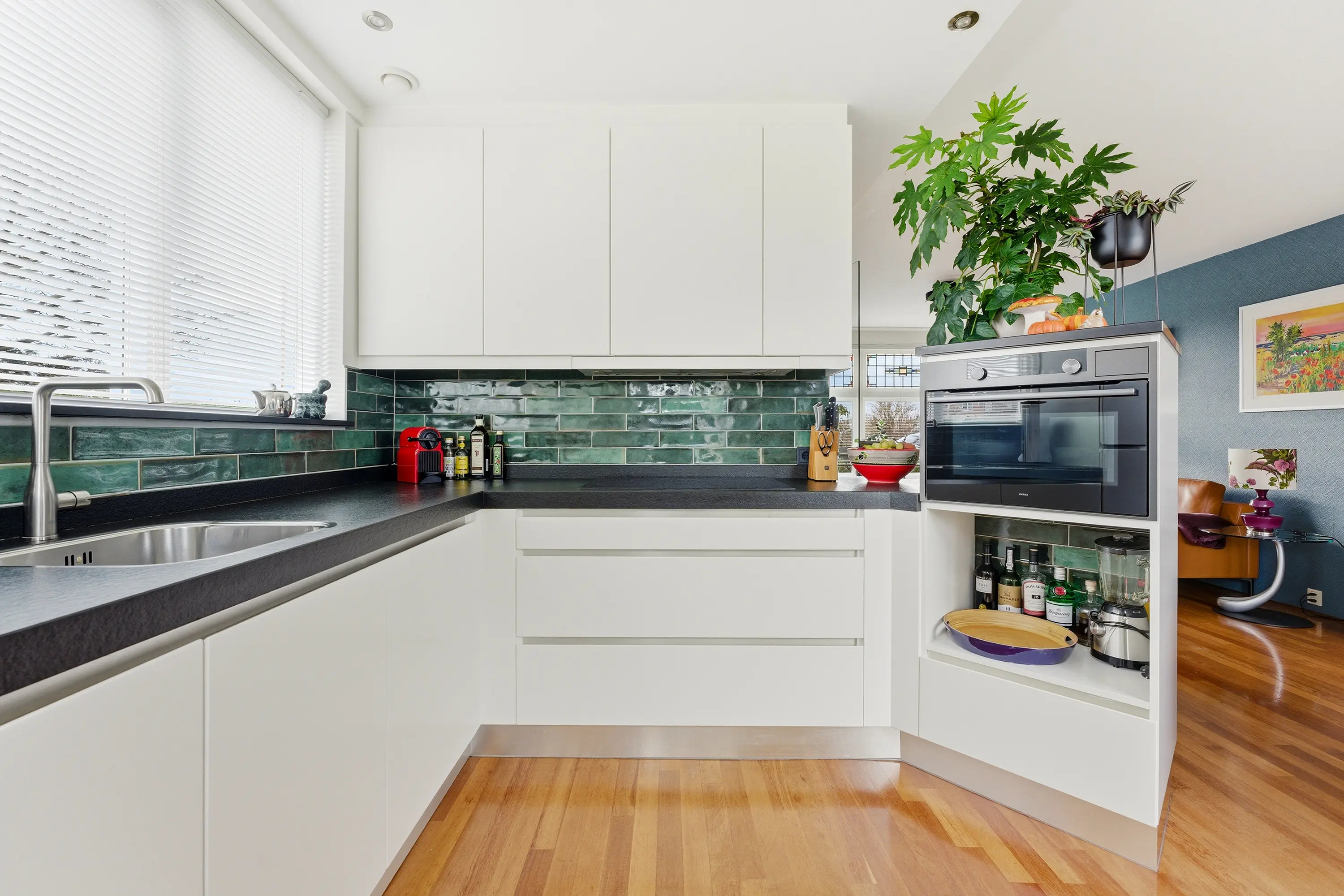 De woonkamer is opvallend licht door de doorzonindeling met grote ramen aan zowel de voorzijde als de achterzijde. Hier kijk je vrij weg over het weiland. Op de vloer ligt een mooie houten vloer die de ruimte warmte geeft. Aan de achterzijde bevindt zich de open keuken met hoekopstelling en diverse inbouwapparatuur zoals een koelkast, vriezer, combi oven magnetron, inductiekookplaat, afzuigkap en vaatwasser. Vanuit de keuken is er toegang tot het balkon dat met een trap in verbinding staat met de tuin.