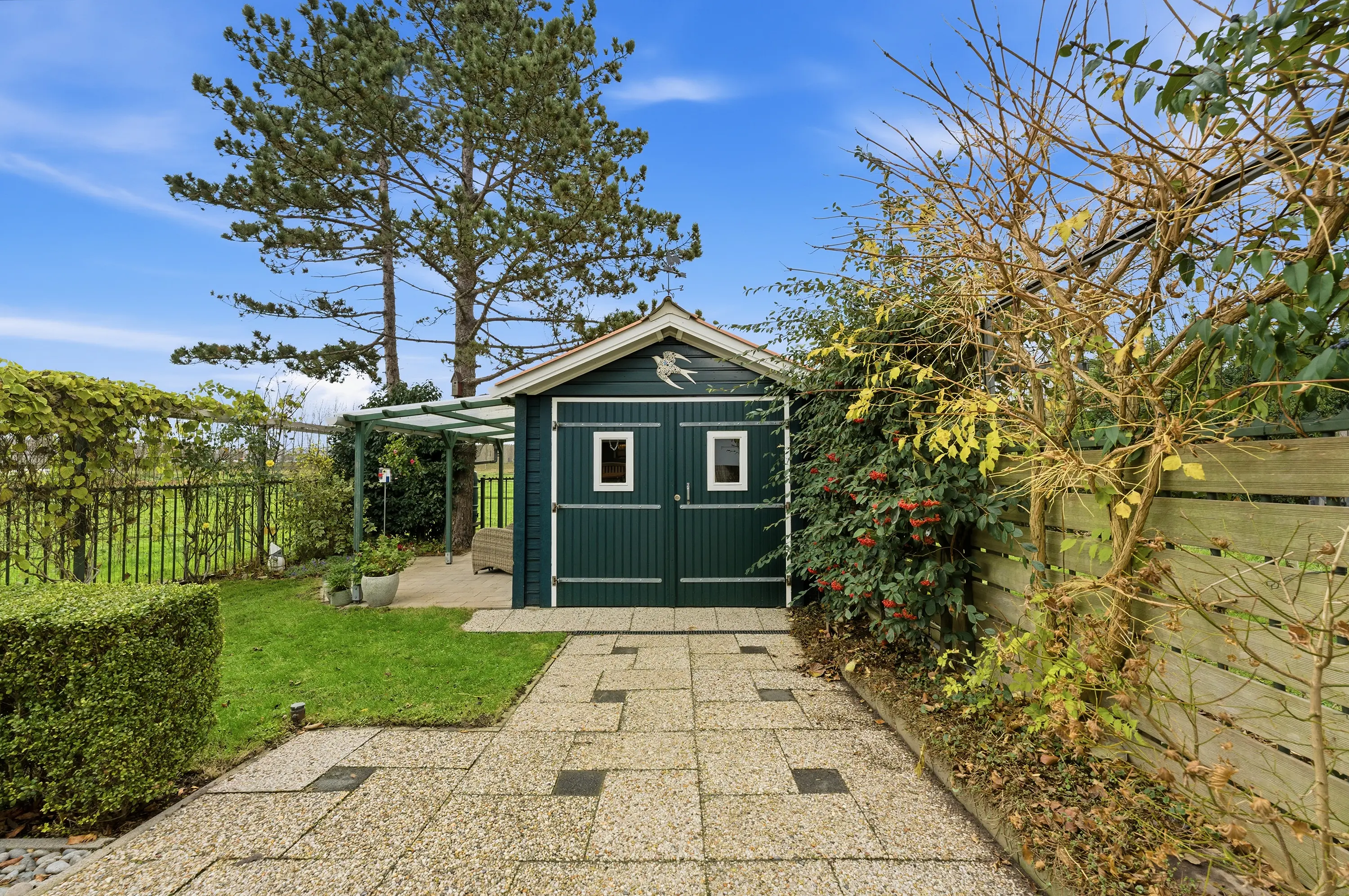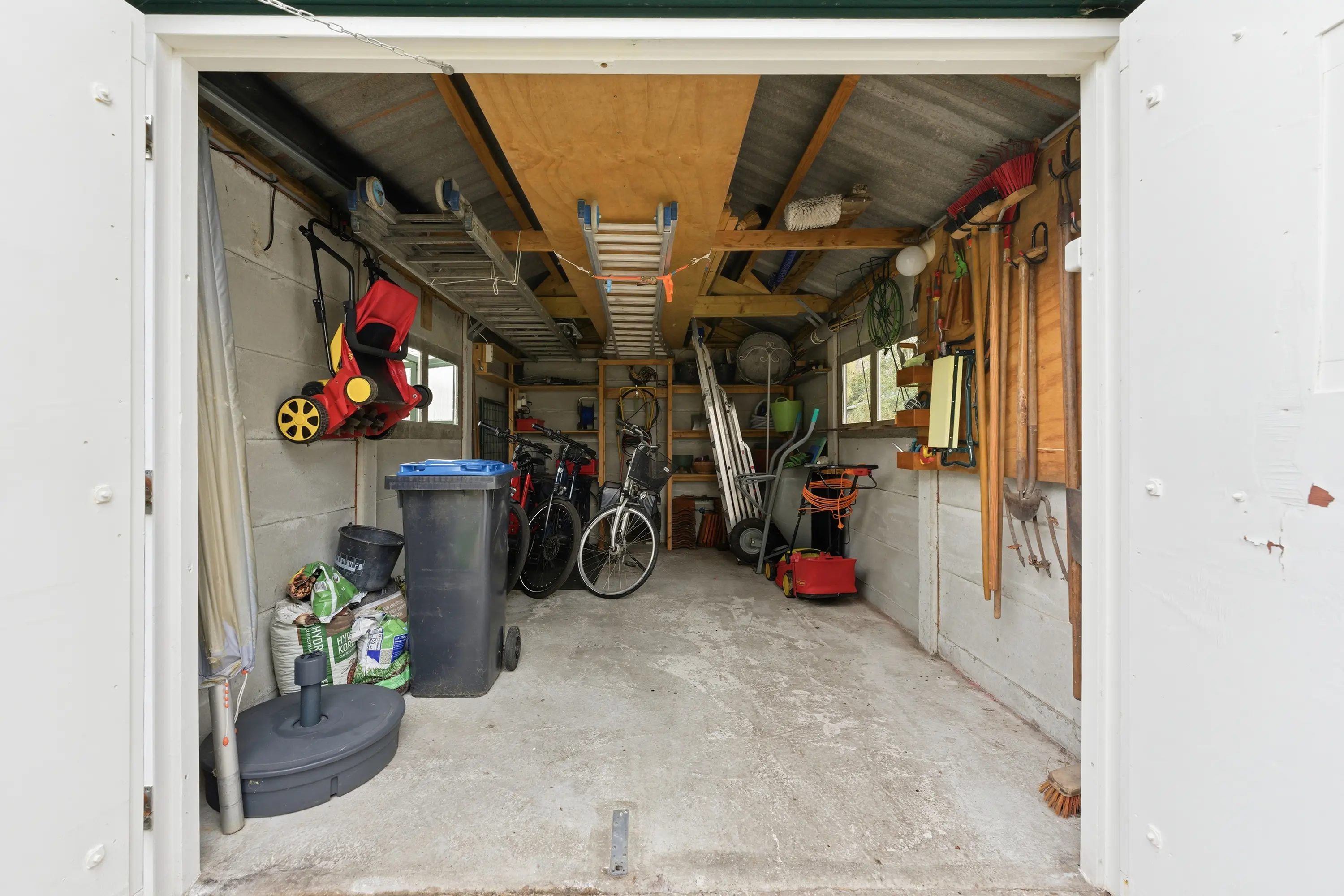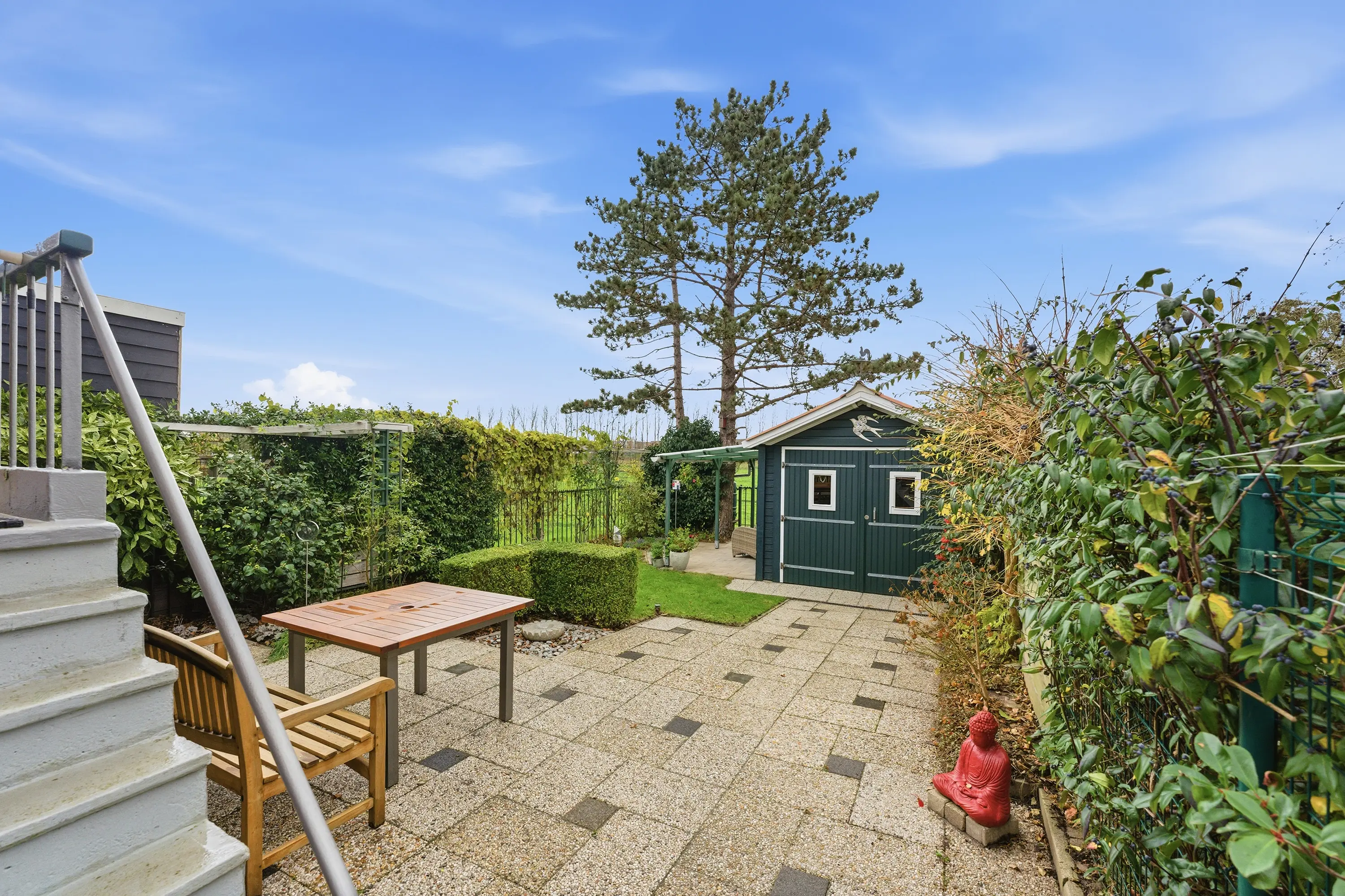 De achtertuin ligt op het noordoosten maar door de diepte en vrije ligging geniet je hier vrijwel de hele dag van de zon. De tuin is bereikbaar via het balkon, maar ook via het pad langs de zijkant van de woning. De ruime betonnen berging in de achtertuin heeft dubbele openslaande deuren en is ideaal voor bijvoorbeeld het stallen van een motor.