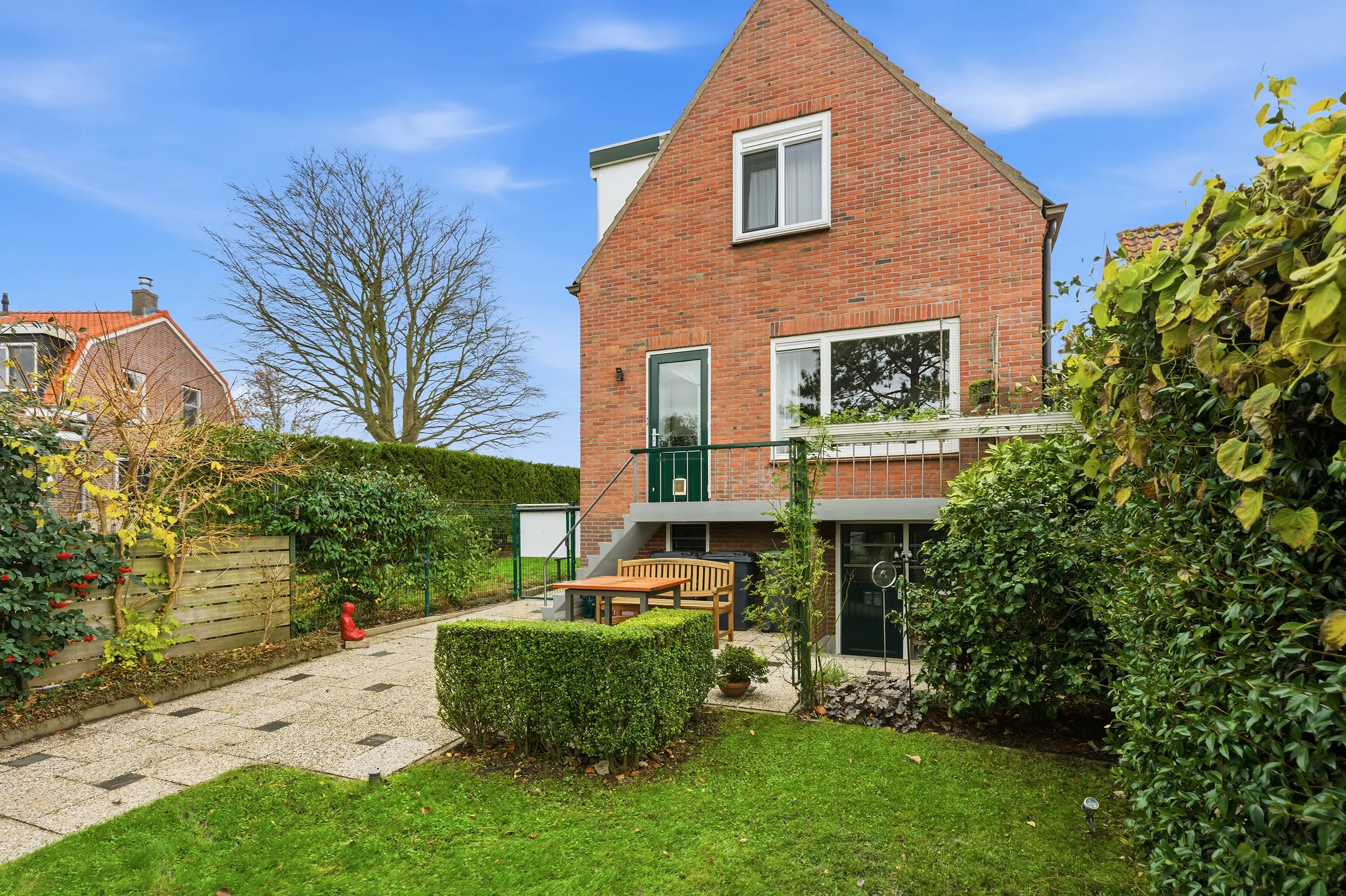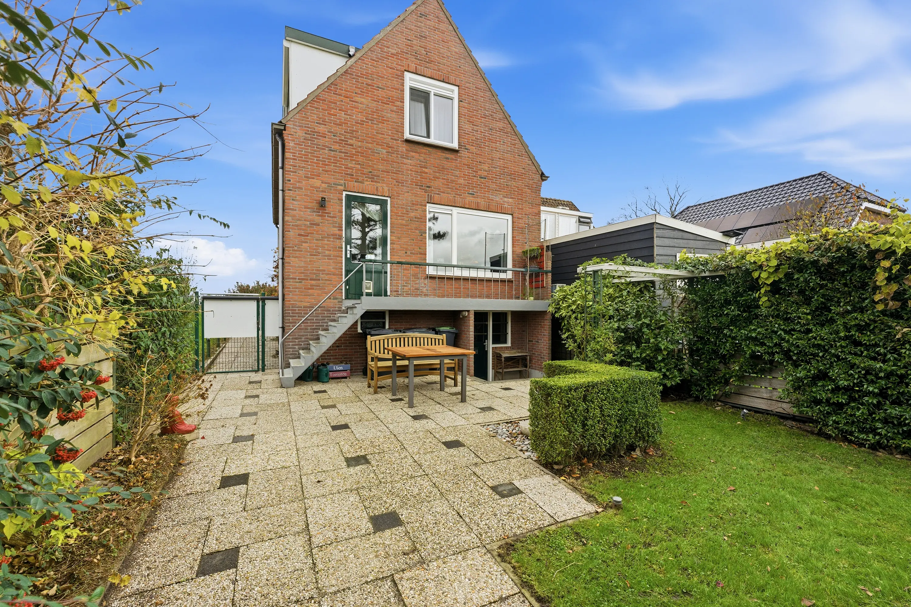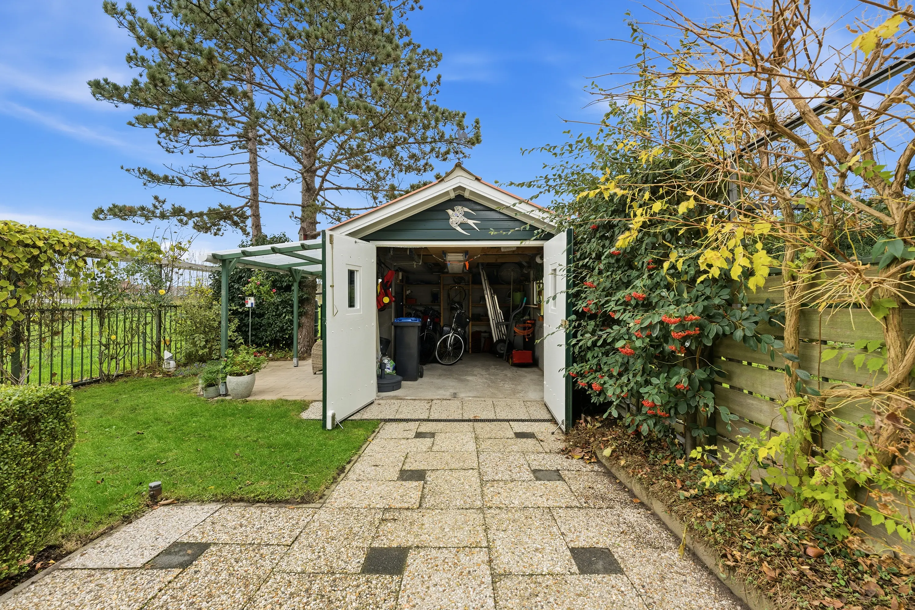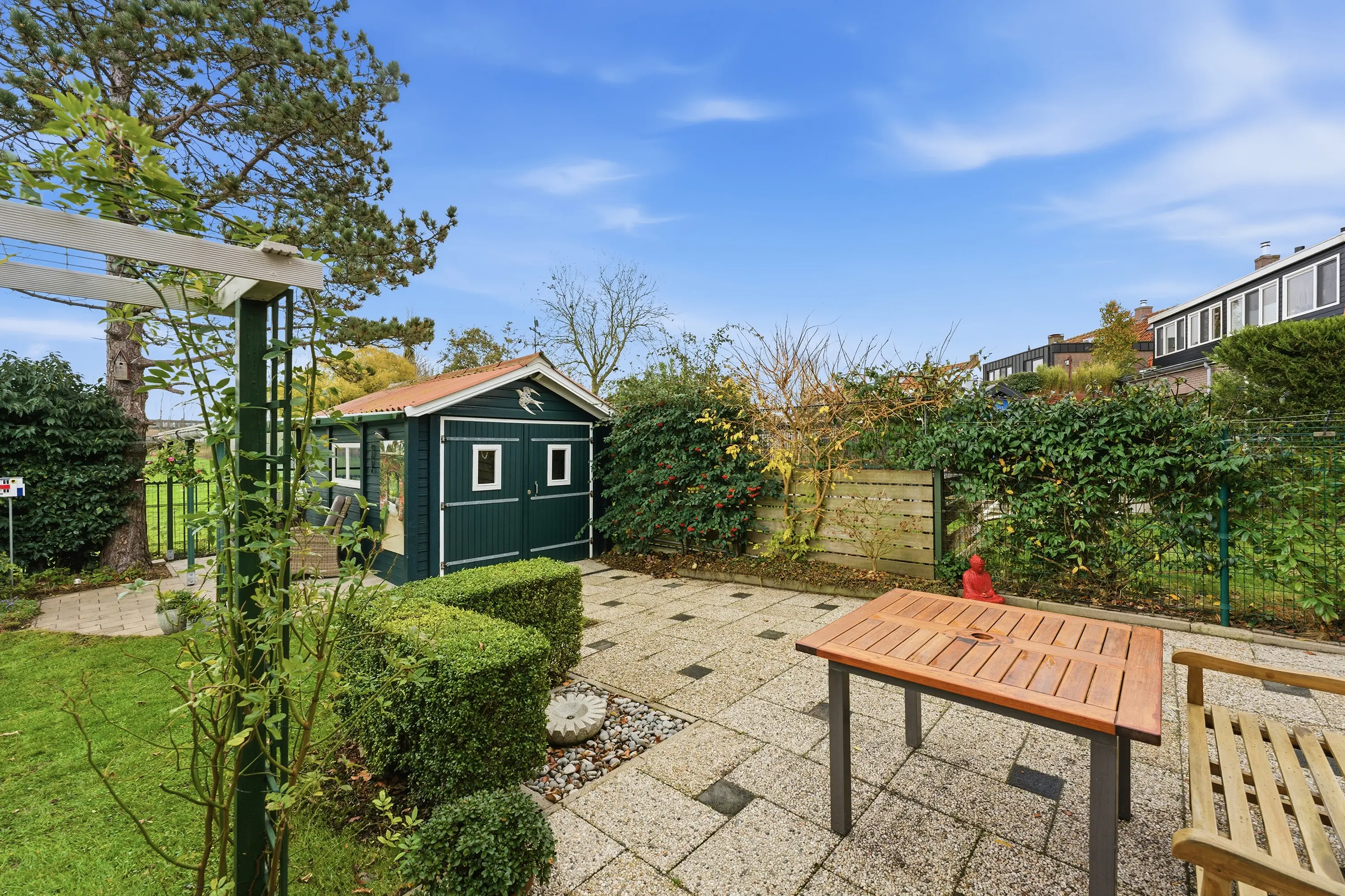 De achtertuin ligt op het noordoosten maar door de diepte en vrije ligging geniet je hier vrijwel de hele dag van de zon. De tuin is bereikbaar via het balkon, maar ook via het pad langs de zijkant van de woning. De ruime betonnen berging in de achtertuin heeft dubbele openslaande deuren en is ideaal voor bijvoorbeeld het stallen van een motor.