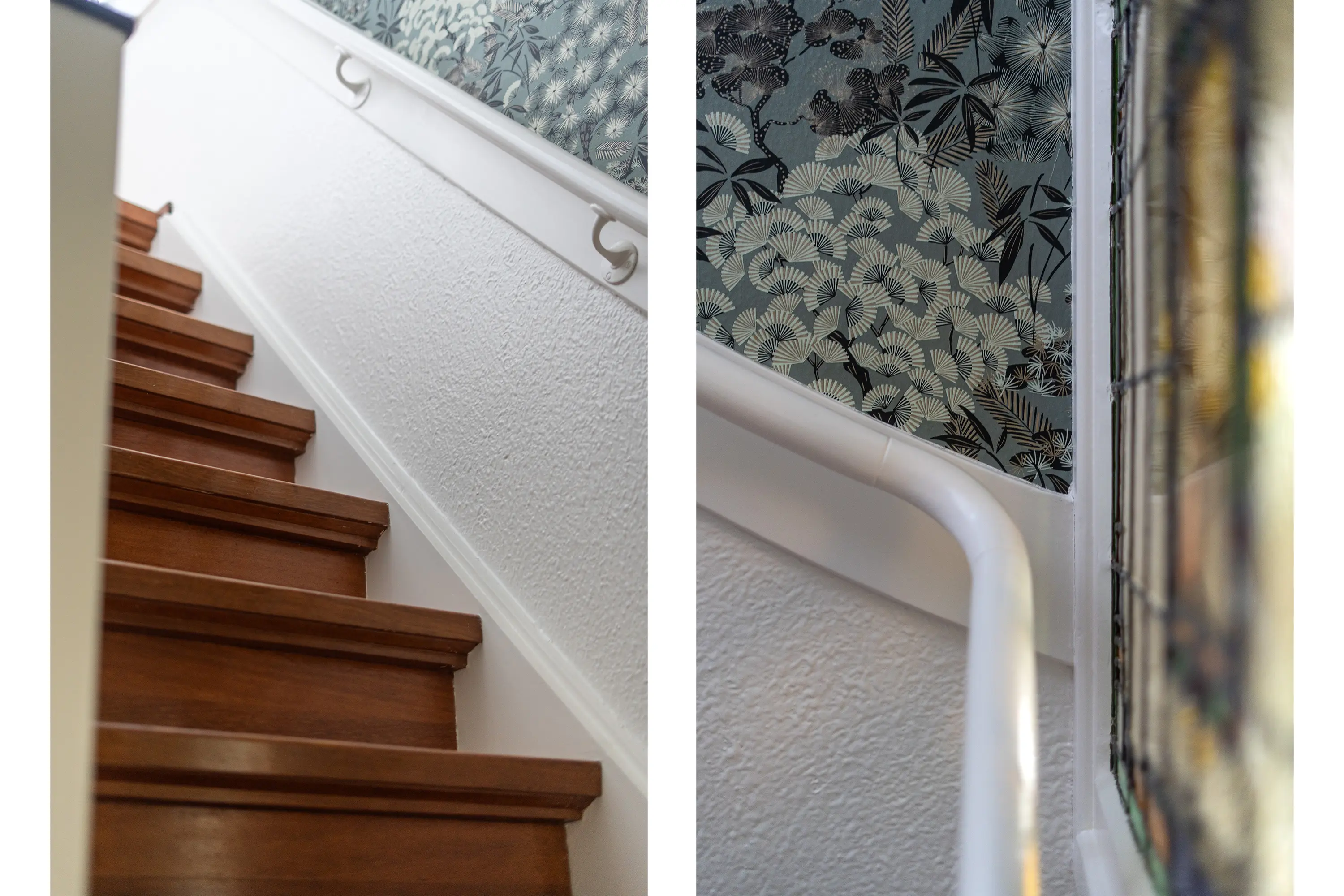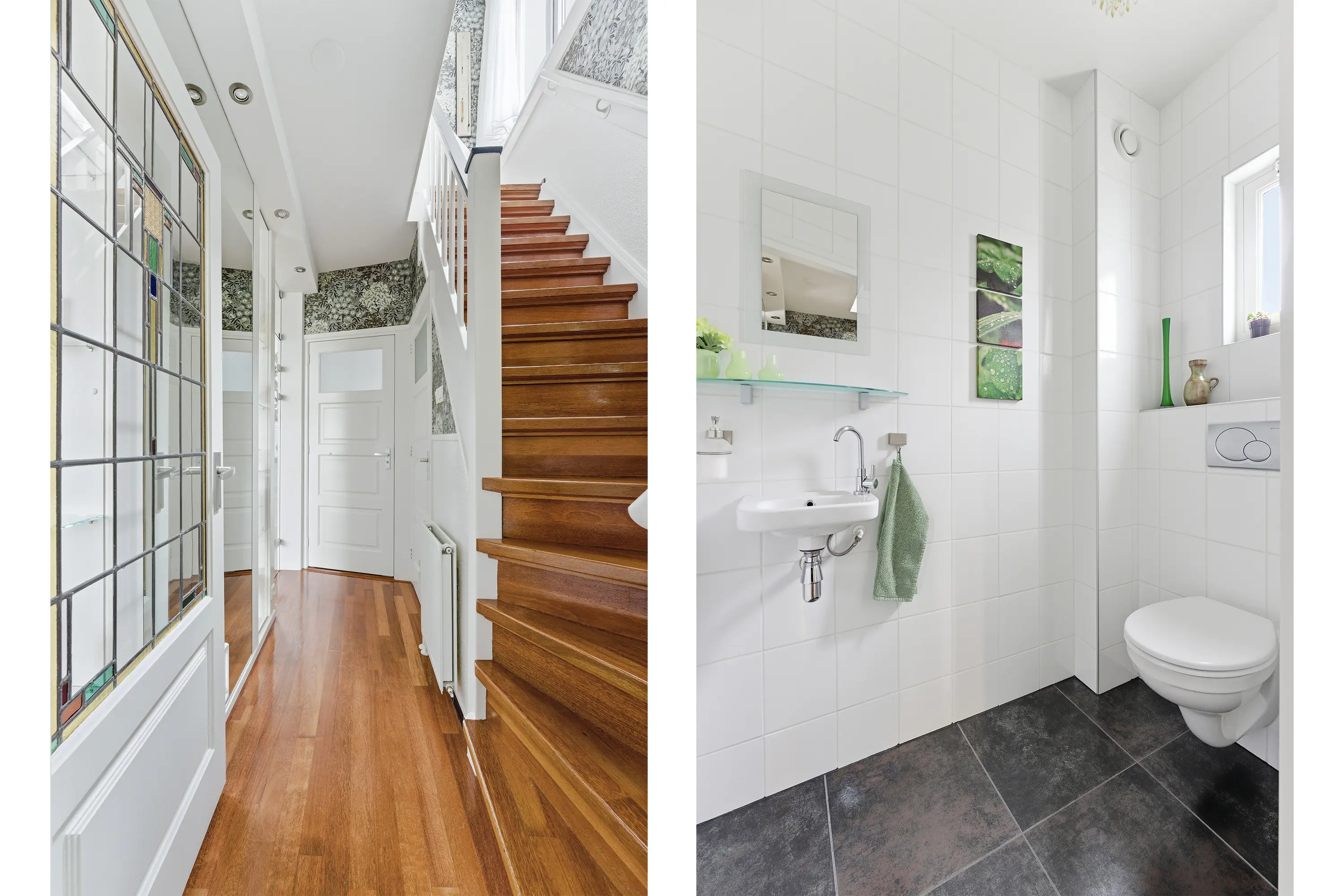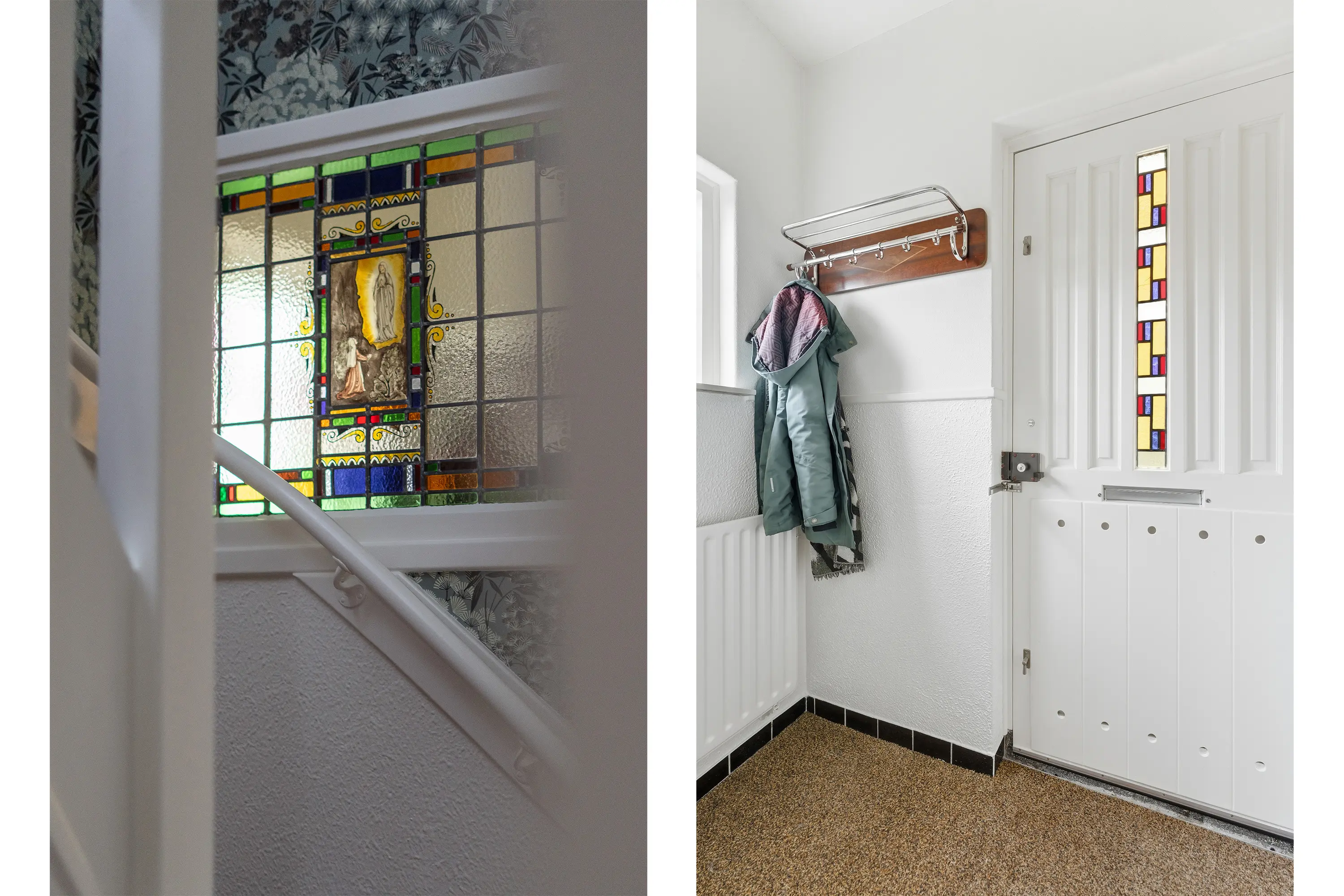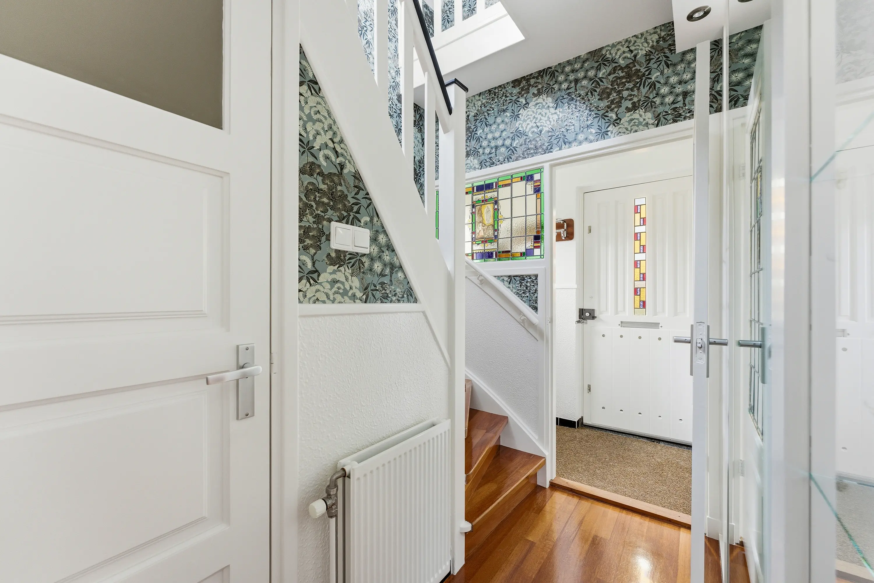 Via de verzorgde voortuin bereik je de voordeur die toegang geeft tot het tochtportaal met prachtige glas in lood ramen. In de hal bevinden zich de trap naar de bovenverdieping en de trap naar het souterrain, het toilet en de toegang tot de woonkamer. Het toilet is volledig betegeld en ruim uitgevoerd met een hangend toilet en fonteintje.