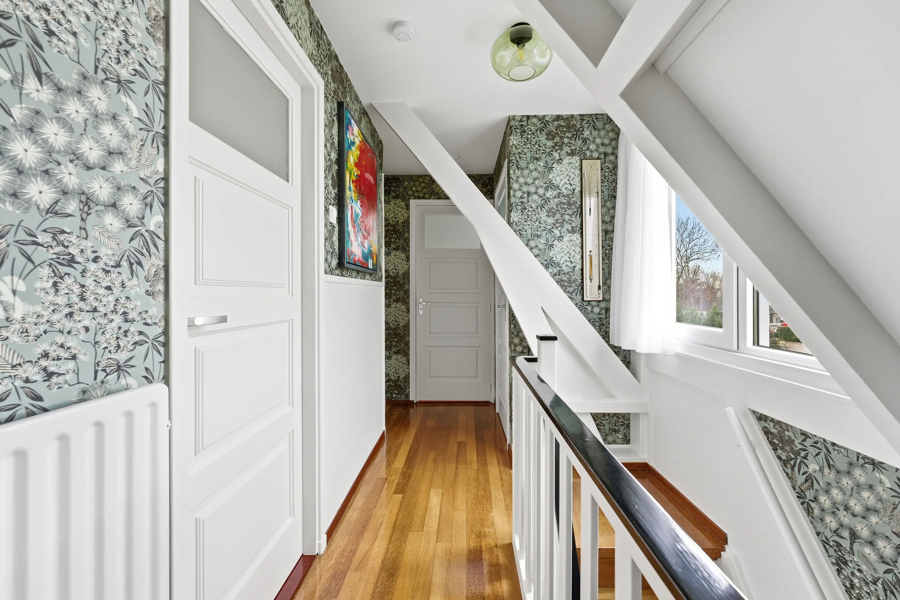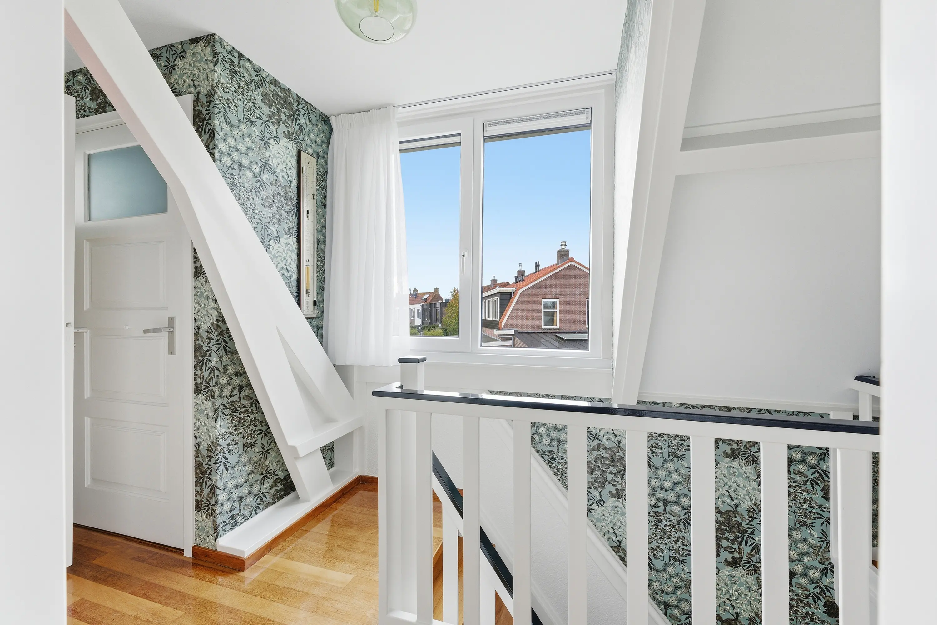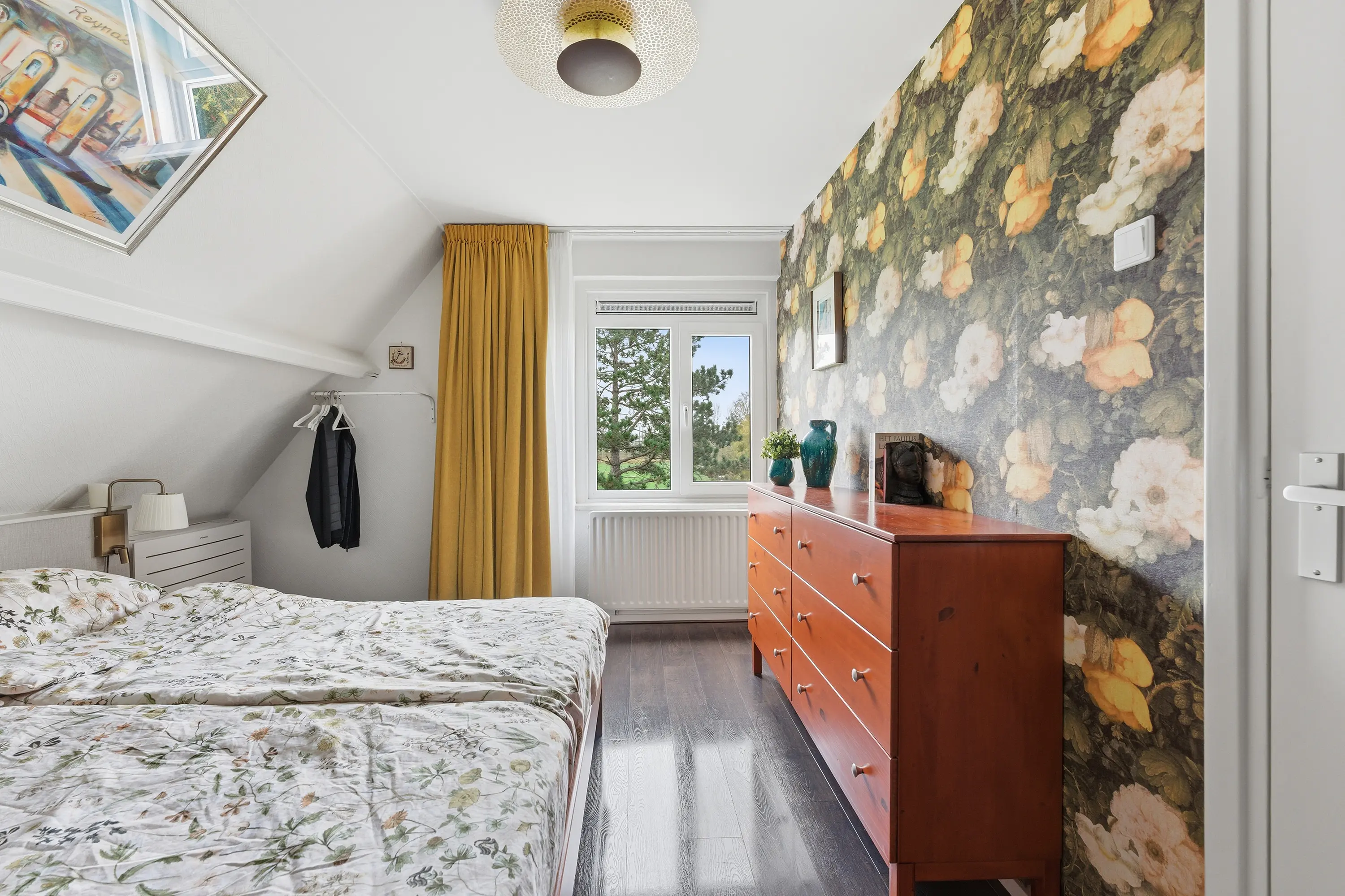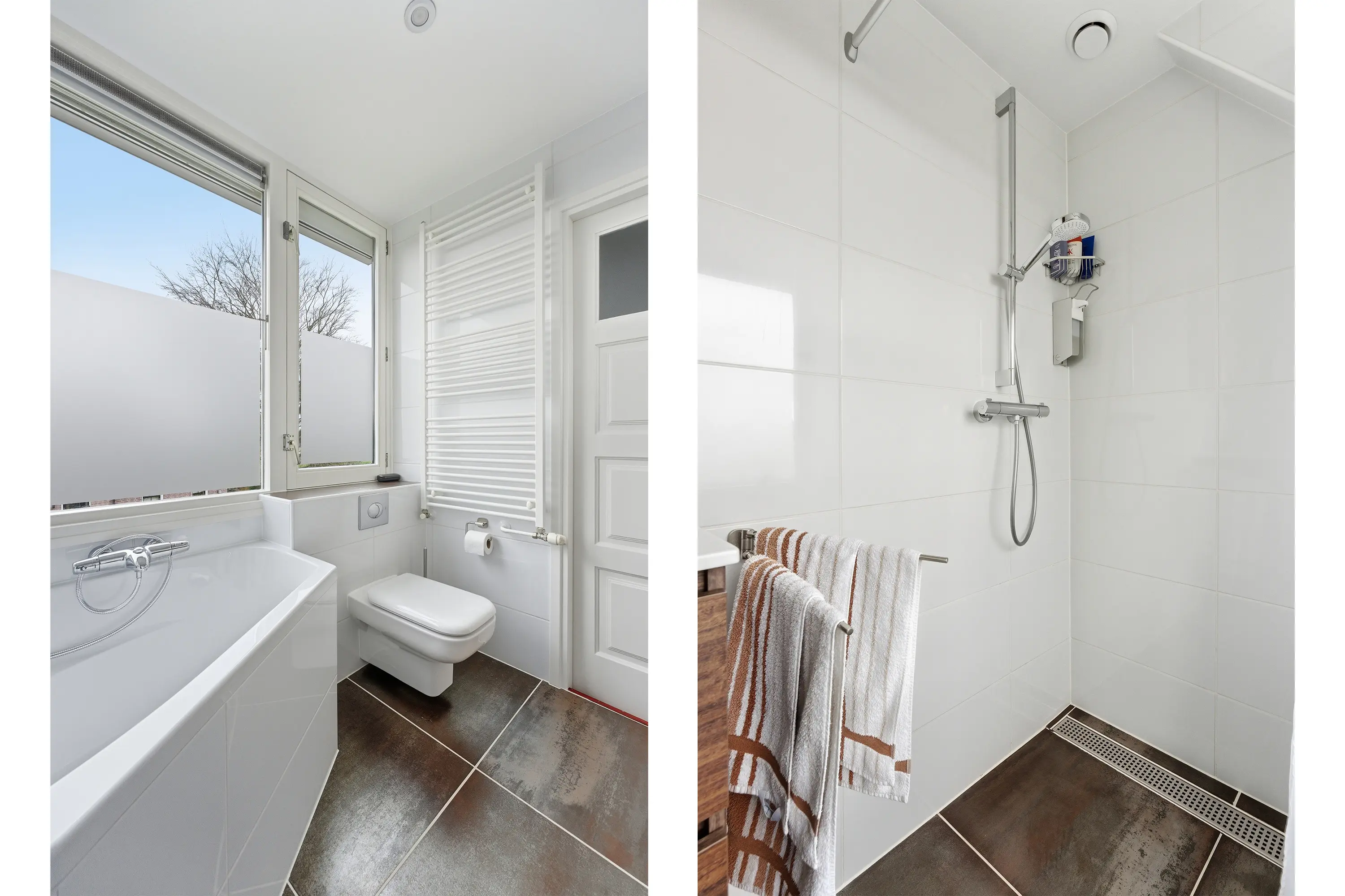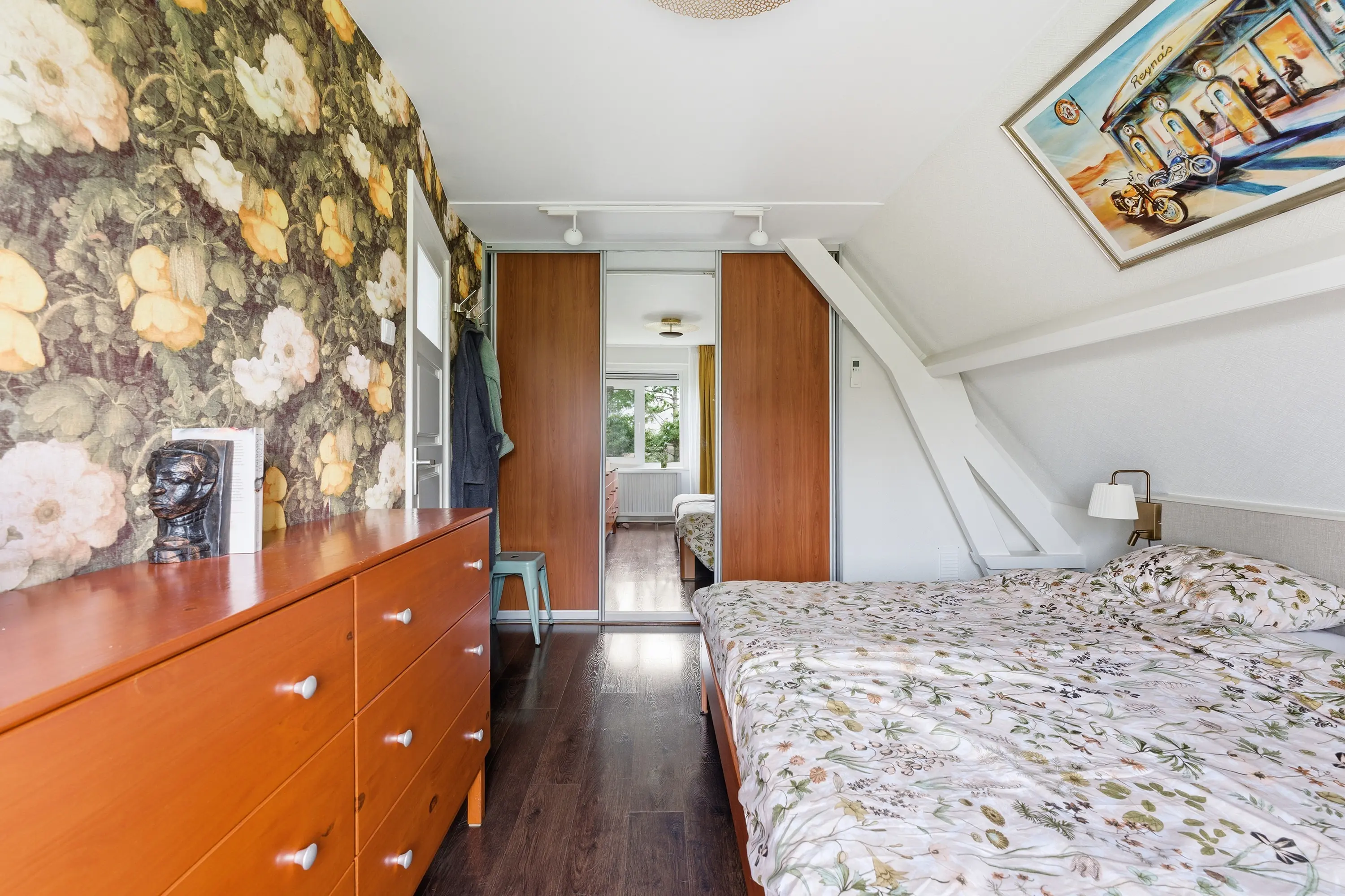Op de bovenverdieping zijn twee slaapkamers gesitueerd, beide voorzien van een houten vloer. De slaapkamer aan de voorzijde beschikt over airconditioning en toegang tot de vliering die over de gehele lengte extra bergruimte biedt. Aan de zijkant van de woning zorgt een groot dakkapel voor extra ruimte in zowel de hal als de badkamer. De badkamer is volledig betegeld en uitgerust met een inloopdouche, ligbad, dubbele wastafel met meubel en een tweede toilet. Op deze verdieping bevinden zich tevens twee praktische bergkasten met onder andere de opstelplaats voor de mechanische ventilatie.