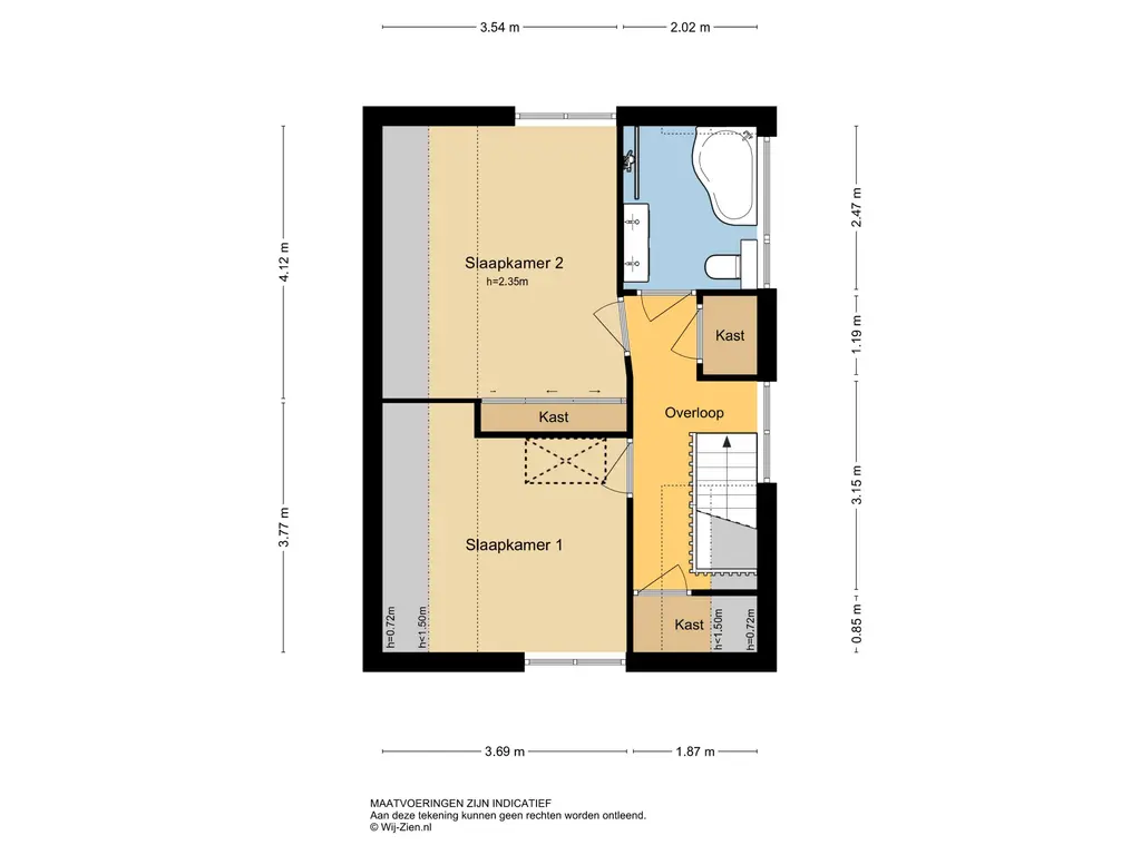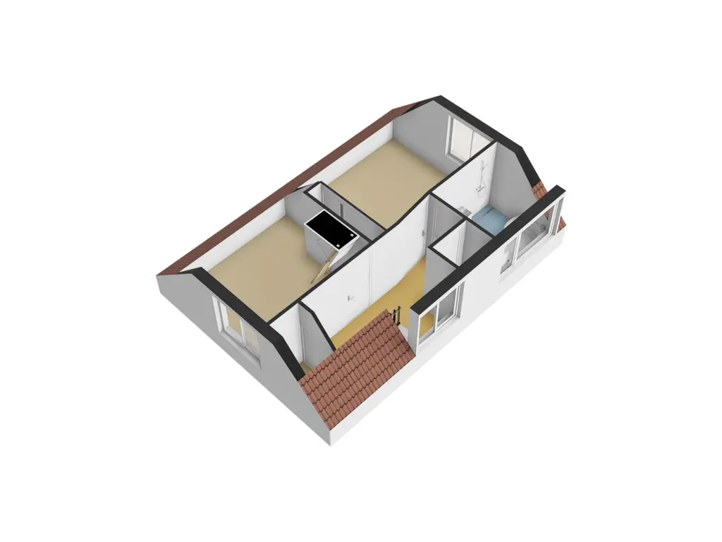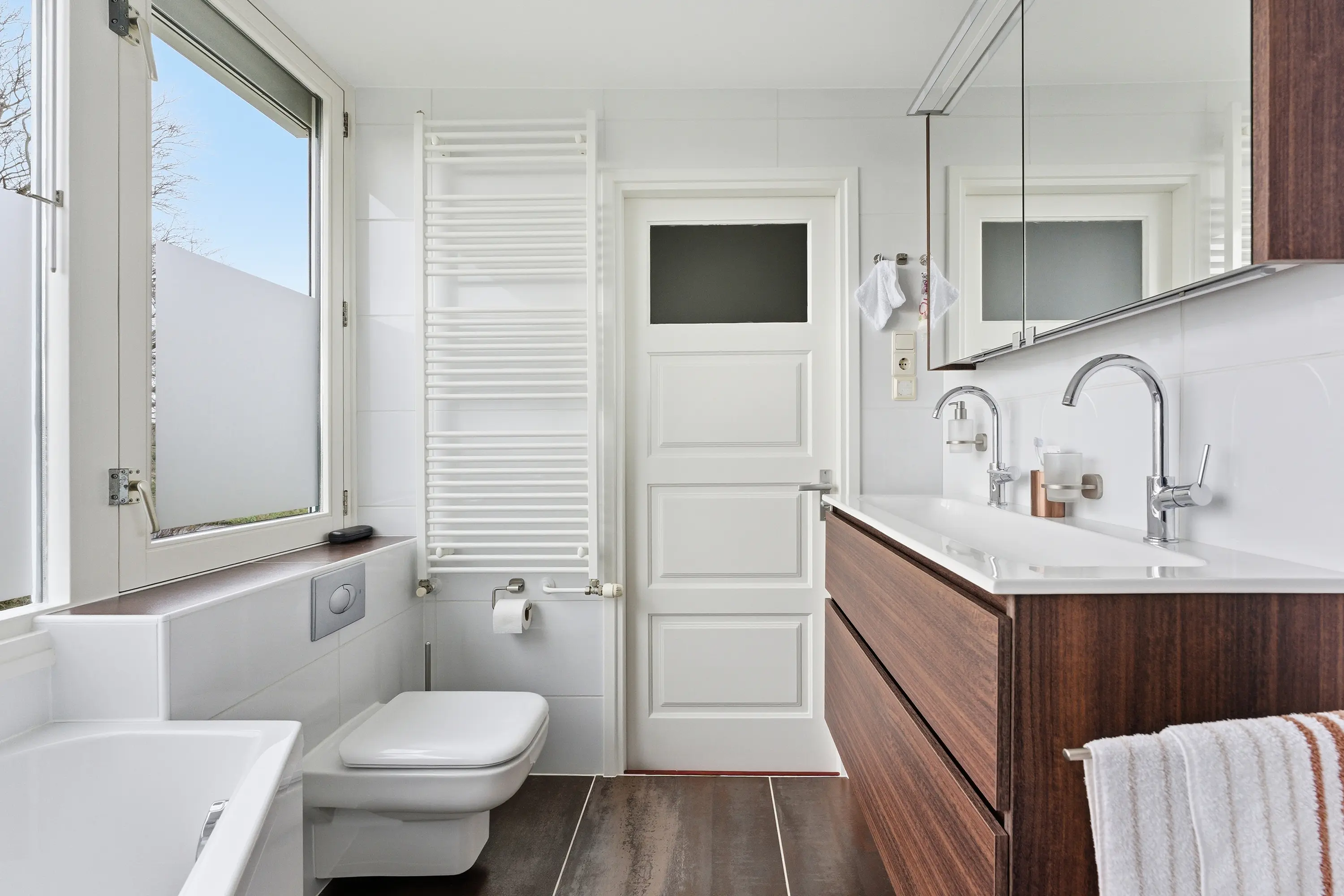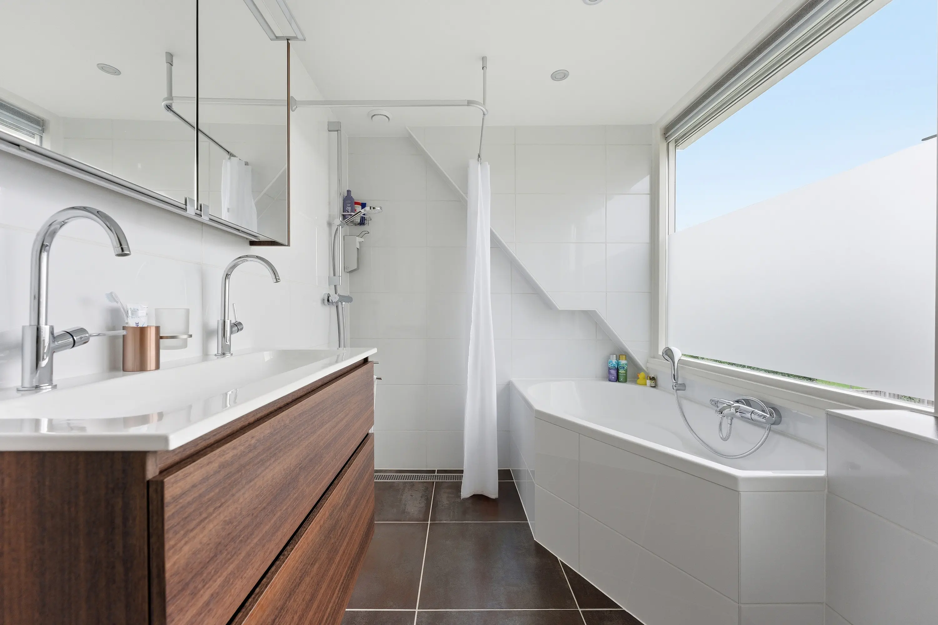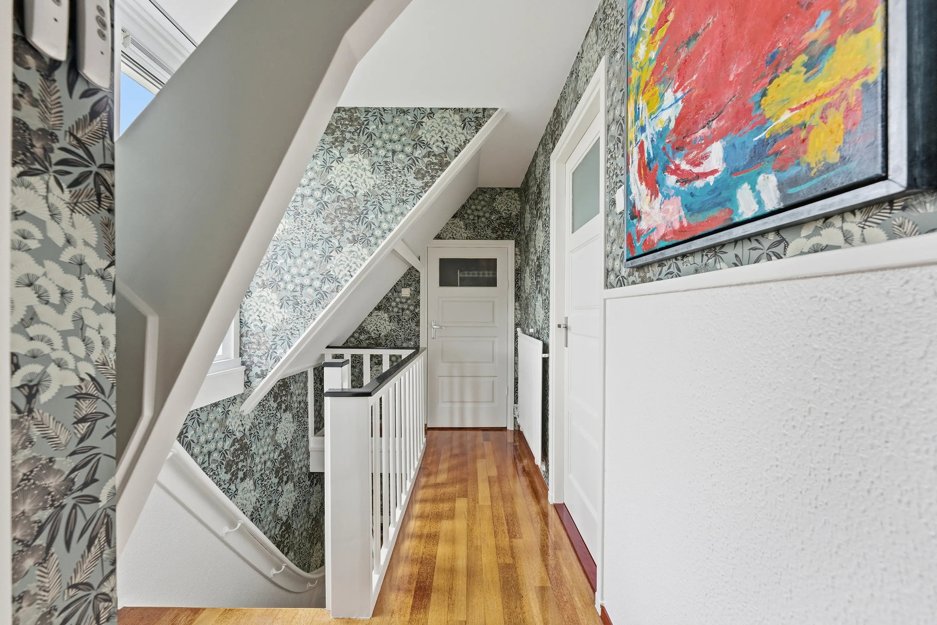 Op de bovenverdieping zijn twee slaapkamers gesitueerd, beide voorzien van een houten vloer. De slaapkamer aan de voorzijde beschikt over airconditioning en toegang tot de vliering die over de gehele lengte extra bergruimte biedt. Aan de zijkant van de woning zorgt een groot dakkapel voor extra ruimte in zowel de hal als de badkamer. De badkamer is volledig betegeld en uitgerust met een inloopdouche, ligbad, dubbele wastafel met meubel en een tweede toilet. Op deze verdieping bevinden zich tevens twee praktische bergkasten met onder andere de opstelplaats voor de mechanische ventilatie.