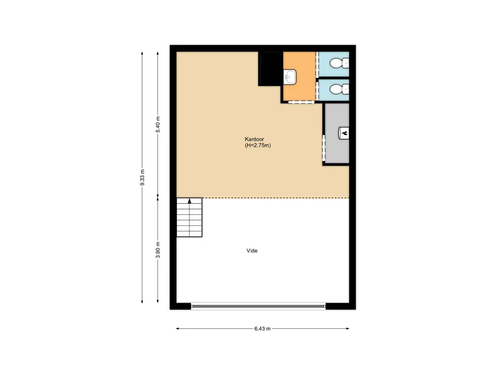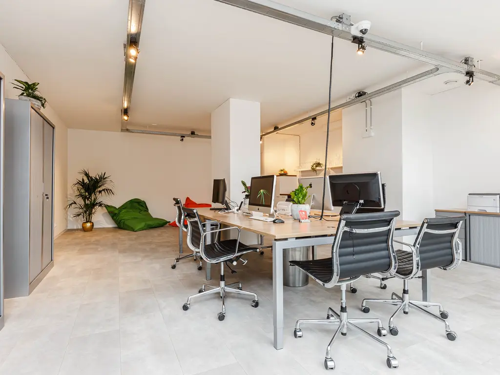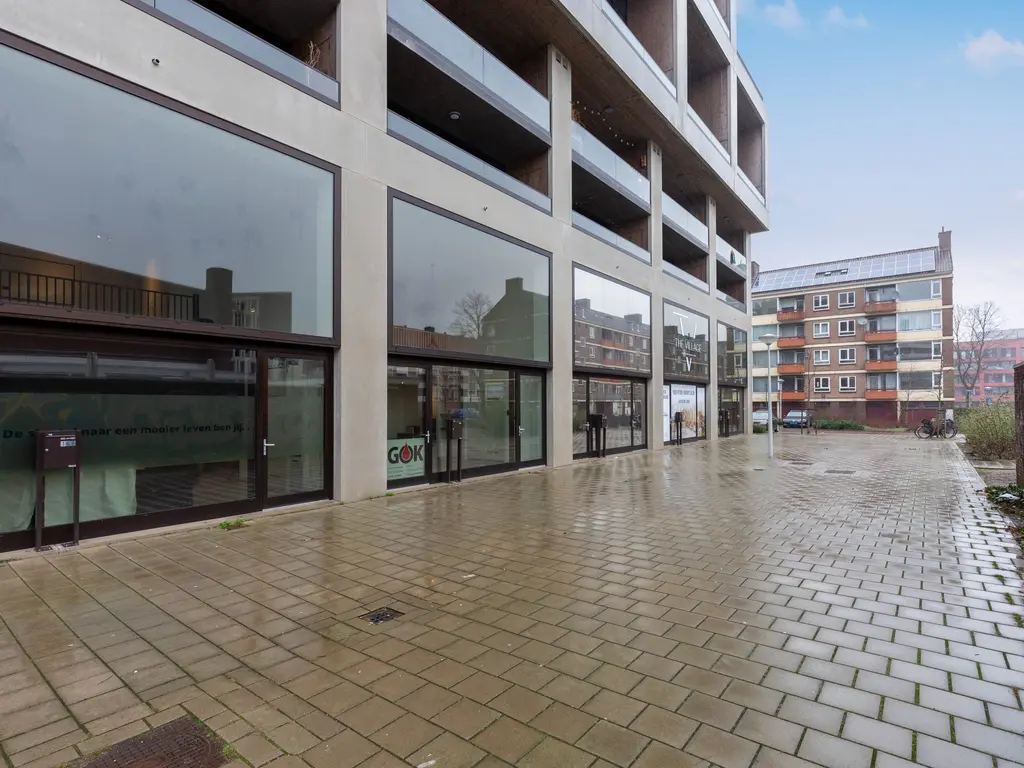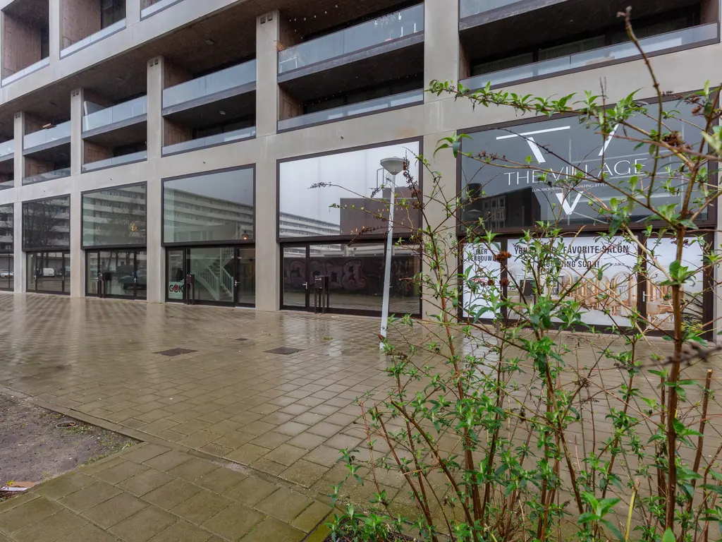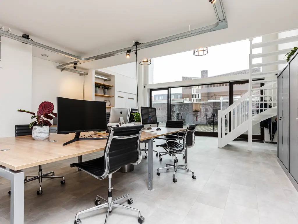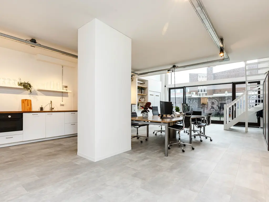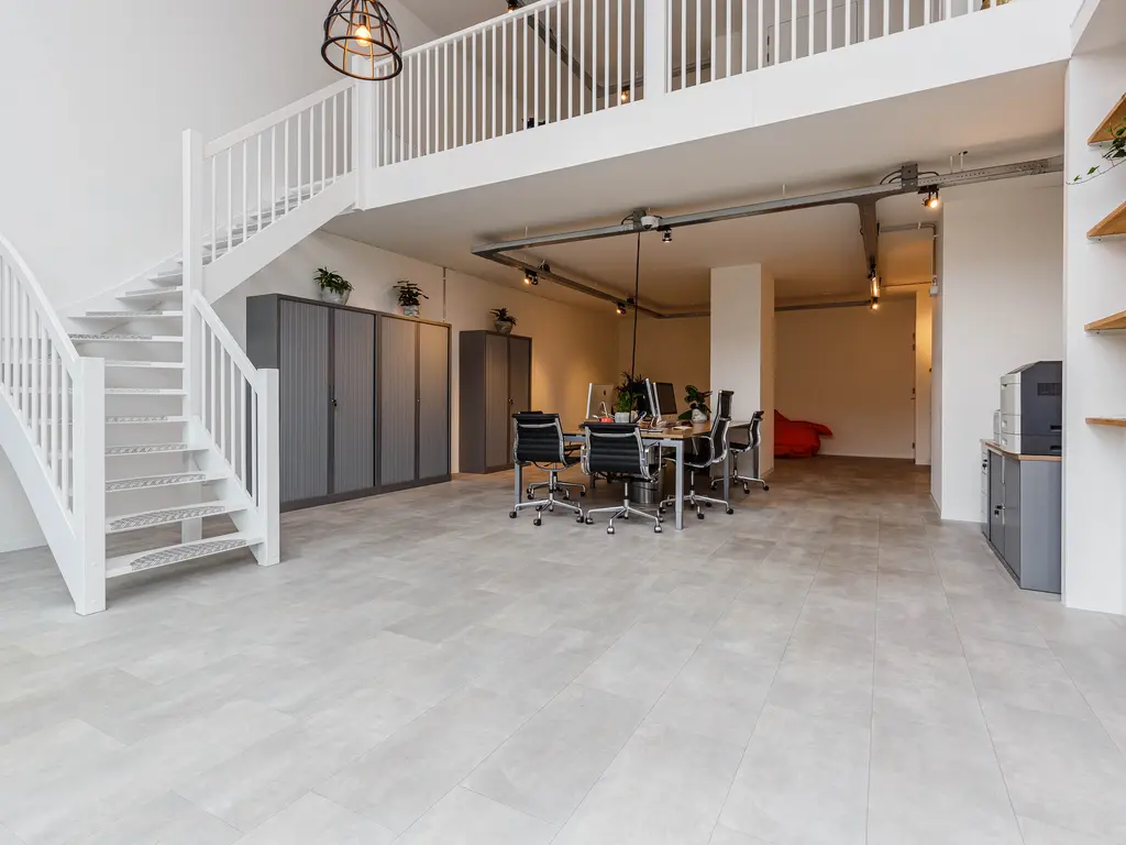 Bij binnenkomst valt direct de fantastische plafondhoogte op en krijgt de ruimte door de glazen voorzijde een zee van licht. Op de begane grond van ongeveer 78 m2 bevindt zich in de huidige situatie het kantoor met achterin de keuken. Via de trap bereikt u de mezzanine met o.a. een overlegruimte en twee separate toiletten.