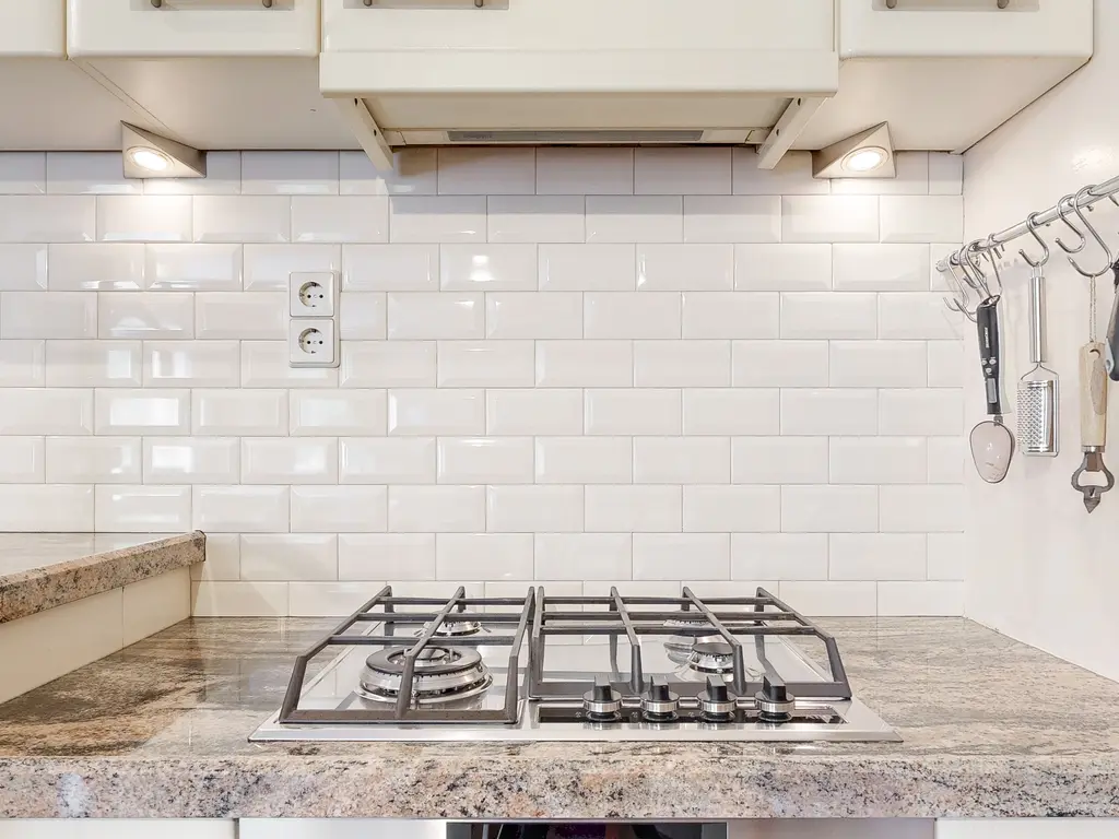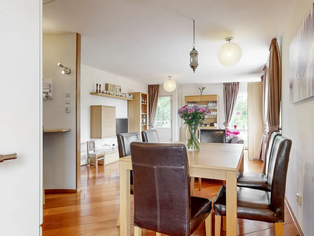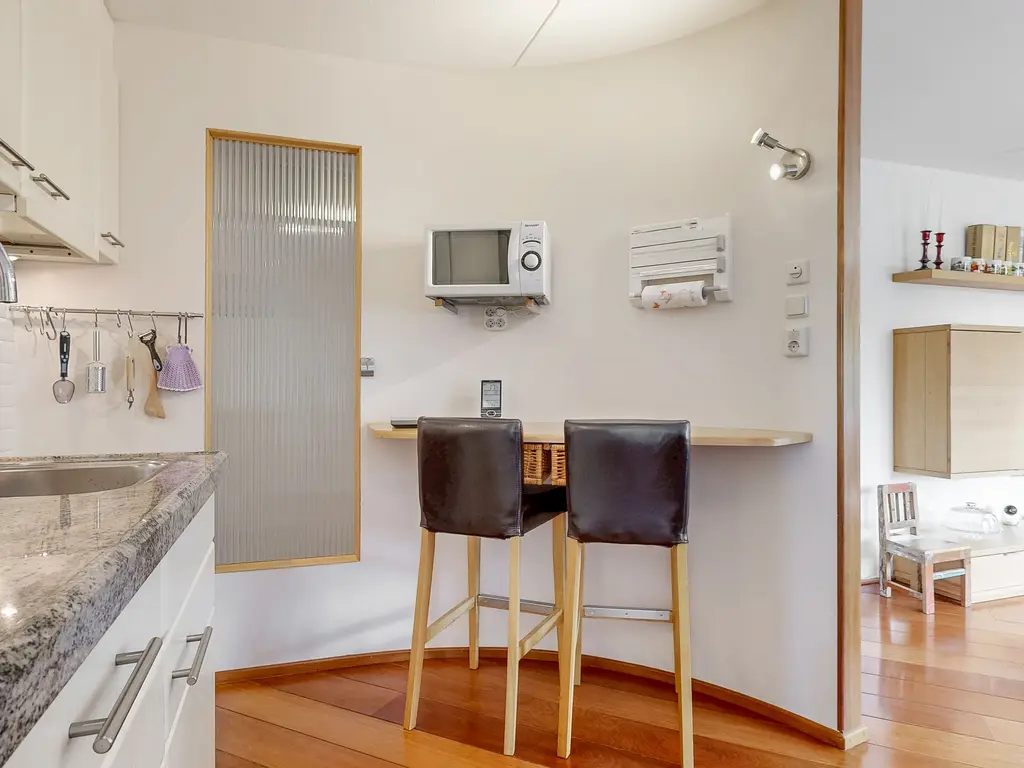 De open keuken heeft een natuurstenen aanrechtblad en is uiteraard voorzien van diverse (inbouw) apparatuur zoals een oven, vaatwasser, 4 pits gasfornuis met afzuigkap en een koelkast. Bij de keuken is een gezellig (ontbijt)barretje gecreëerd, leuk om te ontbijten of even een kopje koffie te nuttigen.