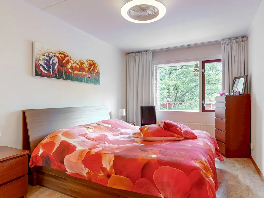 Entrance, hall with meter cupboard, laundry room/storage room with central heating boiler, modern toilet with sink, bathroom and access to the living room with open kitchen. The spacious and very bright living room has a beautiful wooden floor, smooth plastered walls and gives access to the two balconies (east and south facing). The open kitchen has a natural stone countertop and is of course equipped with various (built-in) appliances such as an oven, dishwasher, 4-burner gas stove with extractor hood and a refrigerator. A cozy (breakfast) bar has been created near the kitchen, nice to have breakfast or a cup of coffee. There are also 2 bedrooms and a modern luxurious bathroom with a spacious walk-in shower, a bidet, (sani-broyeur) toilet, washbasin with mirror cabinet and a design radiator.
