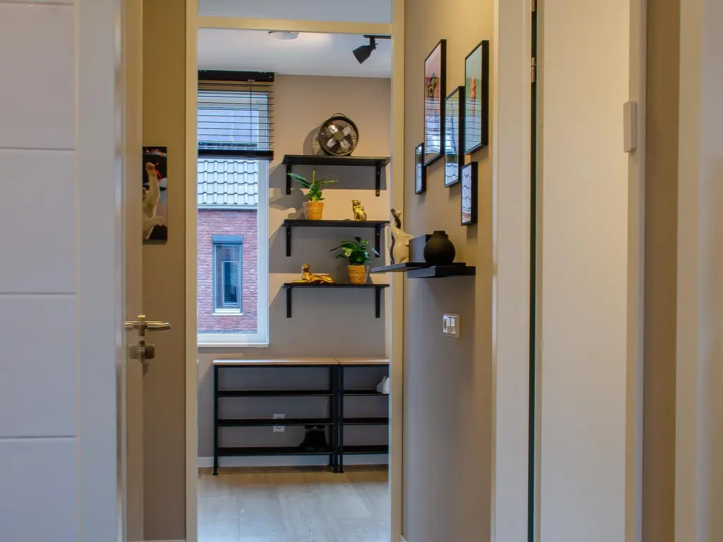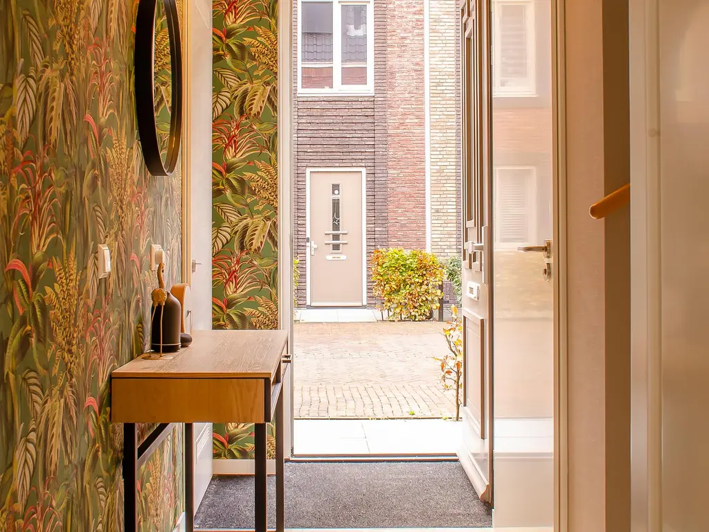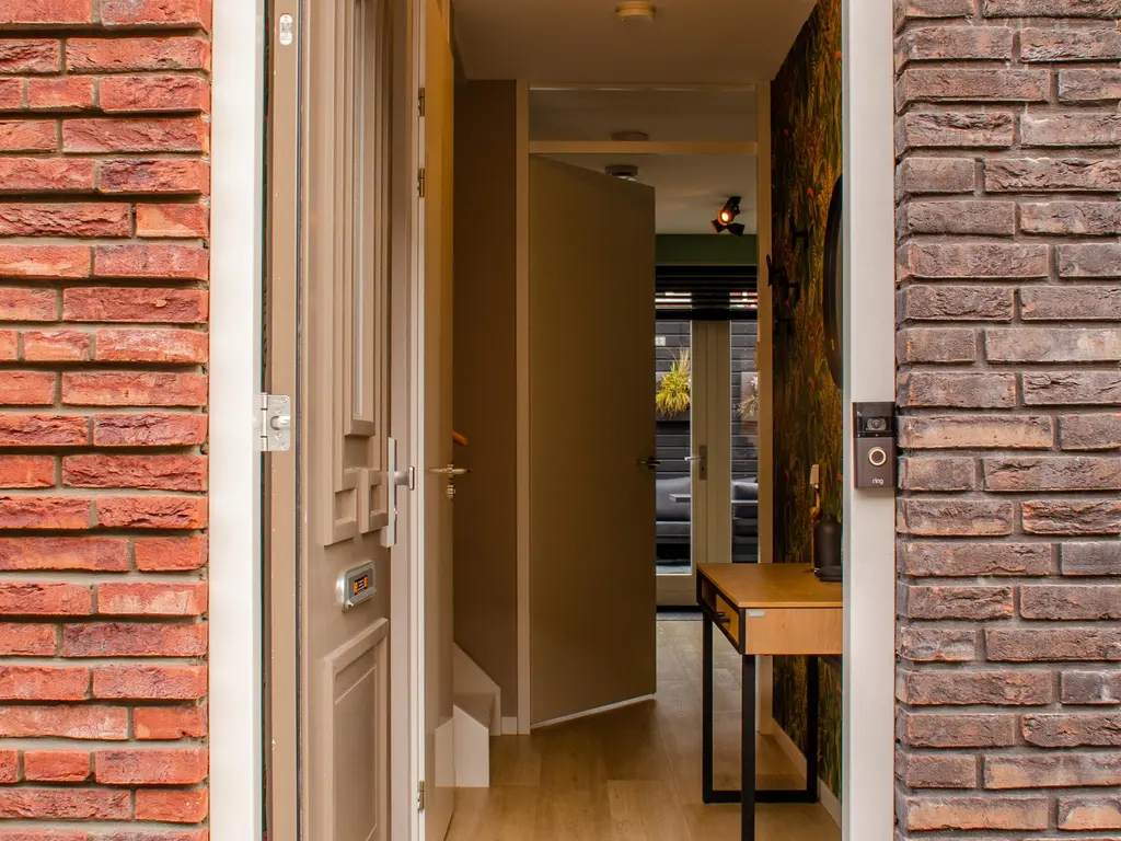 Via de voortuin betreedt u de ruime hal waarvan één muur voorzien is van een mooi design behang, het geheel heeft een luxe uitstaling. Direct links achter de deur vindt u de warmtepomp. Daarnaast is er plaats voor de garderobe en bevindt zich hier het toilet met apart fonteintje en de meterkast.