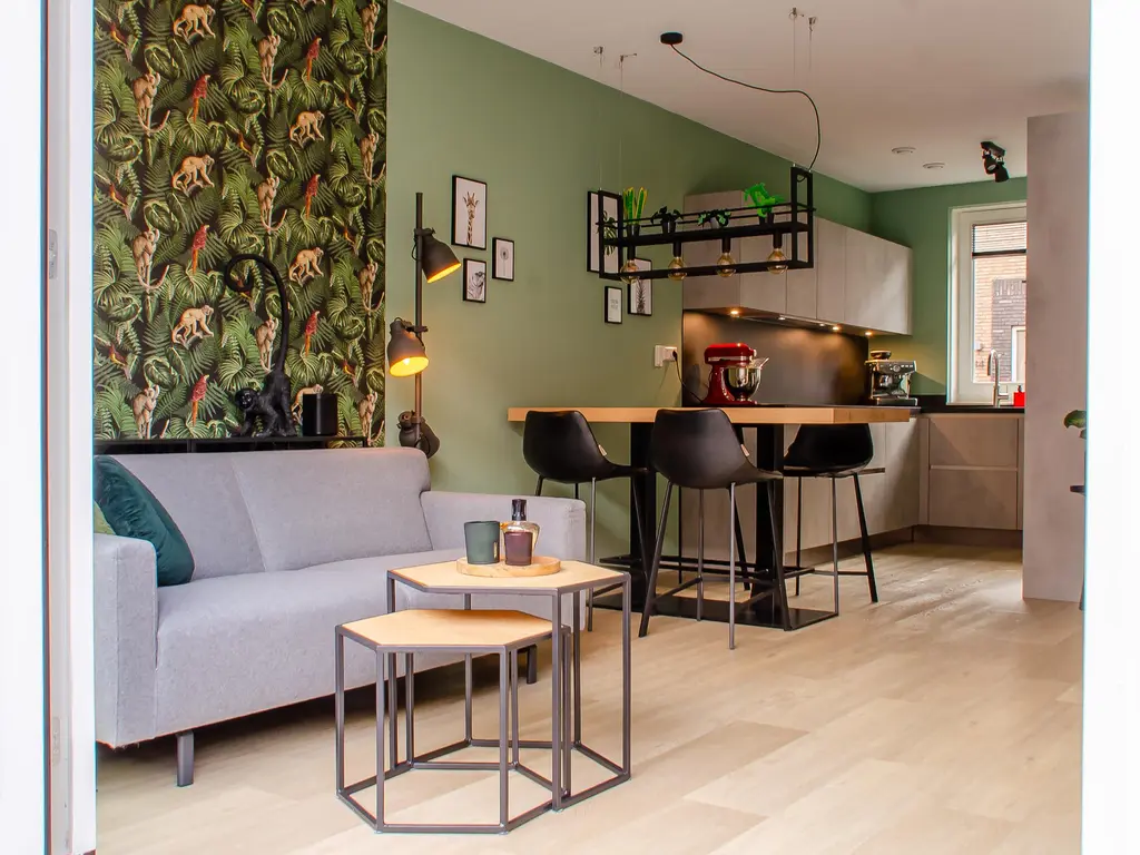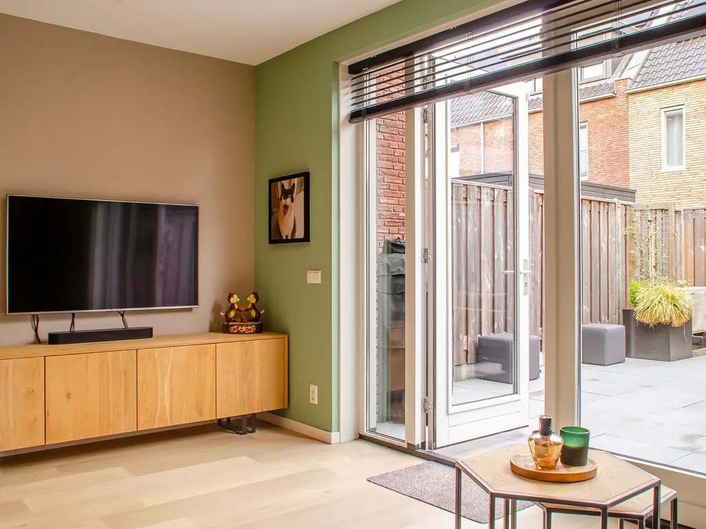 De tuingerichte woonkamer heeft een sfeervolle uitstraling, de wanden zijn voorzien van behang in lichte tinten en design. Over de gehele begane grond ligt een mooie PVC-vloer met vloerverwarming als hoofdverwarming en onder de trap vindt u een goed bemeten kast. De grote openslaande deuren aan de achterzijde verbinden binnen met buiten.