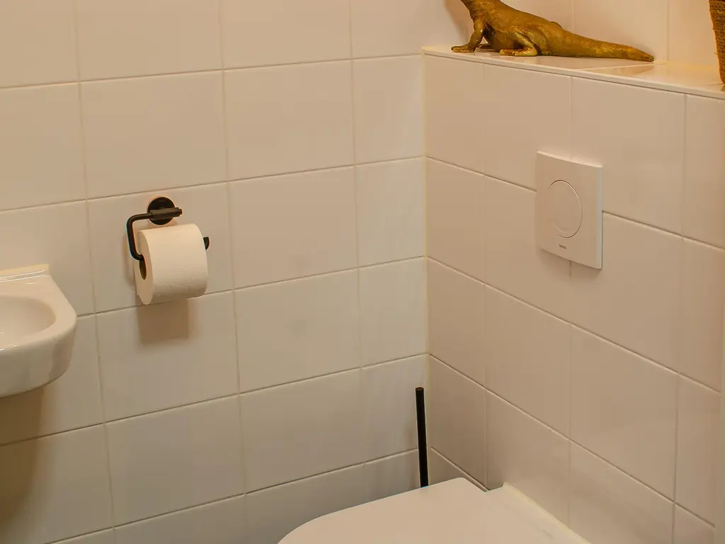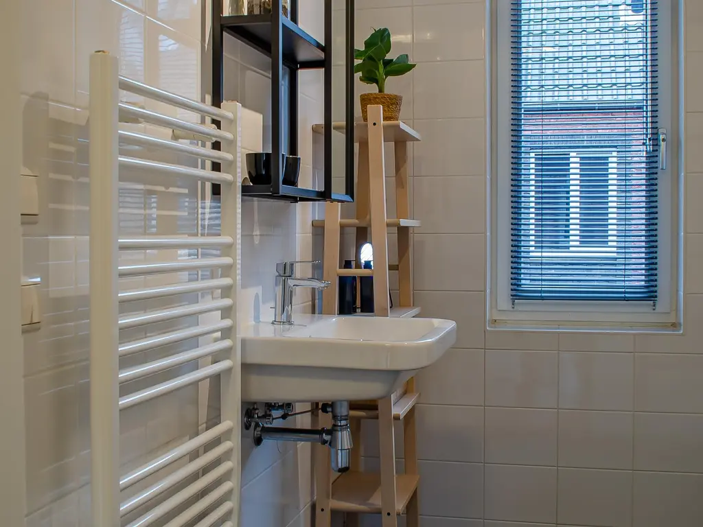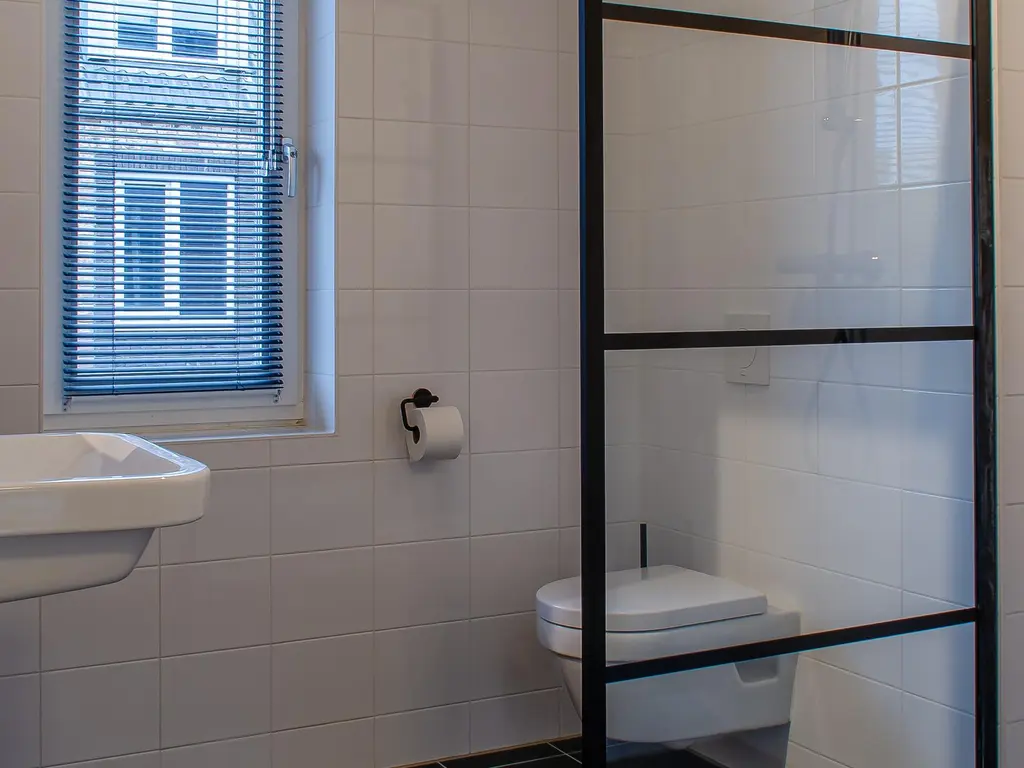De badkamer is geheel betegeld en uitgerust met een wastafel, douche en toilet. Een plek waar u heerlijk kunt ontspannen.