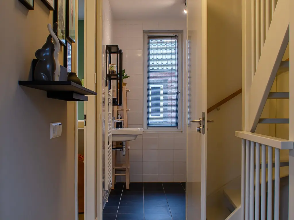 Tot slot vindt u in de hal de trap naar de eerste verdieping en de doorgang naar de woonkamer.