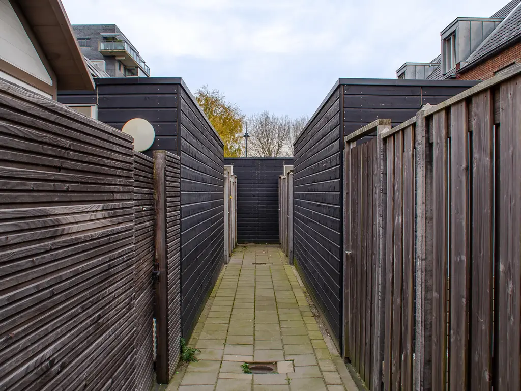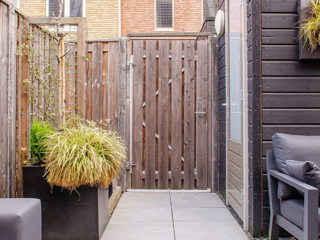 Achter in de tuin staat een houten berging, ideaal voor het stallen van de fietsen en het bergen van het (tuin) gereedschap. Via de poort naar de steeg kunt u gemakkelijk met de fietsen weg.