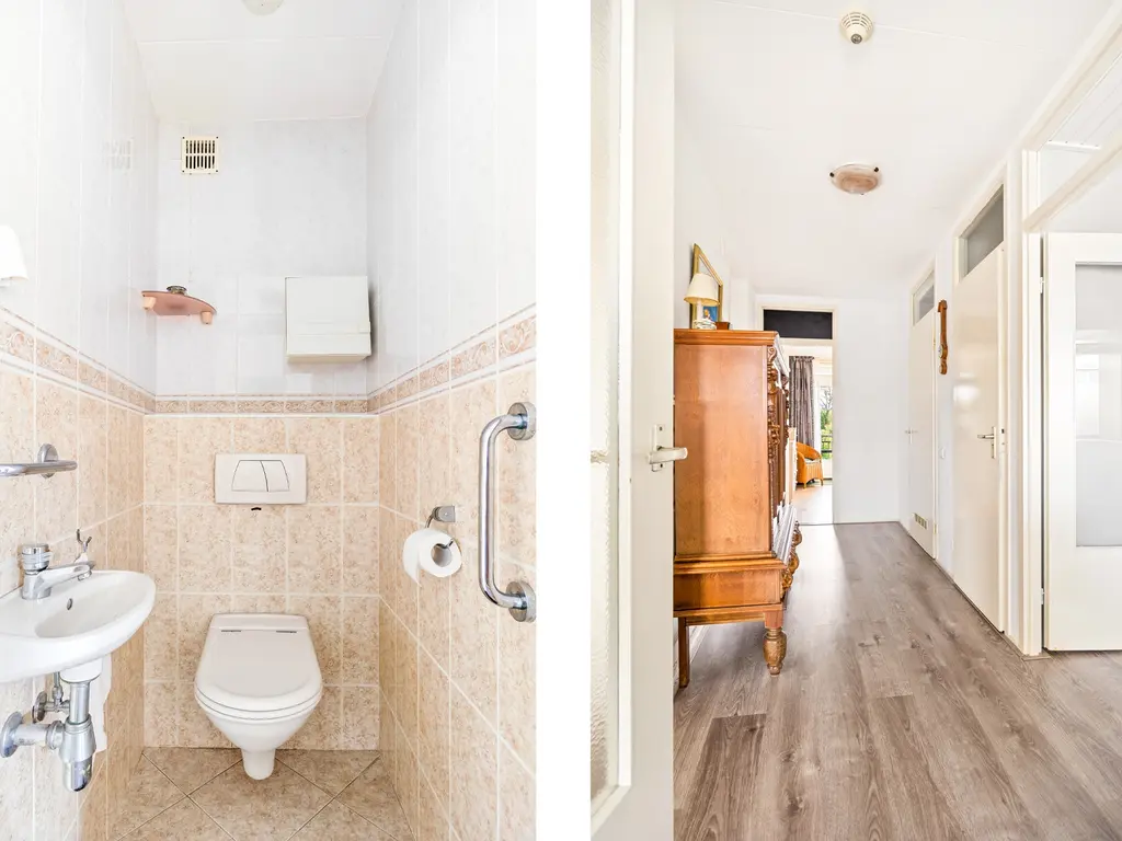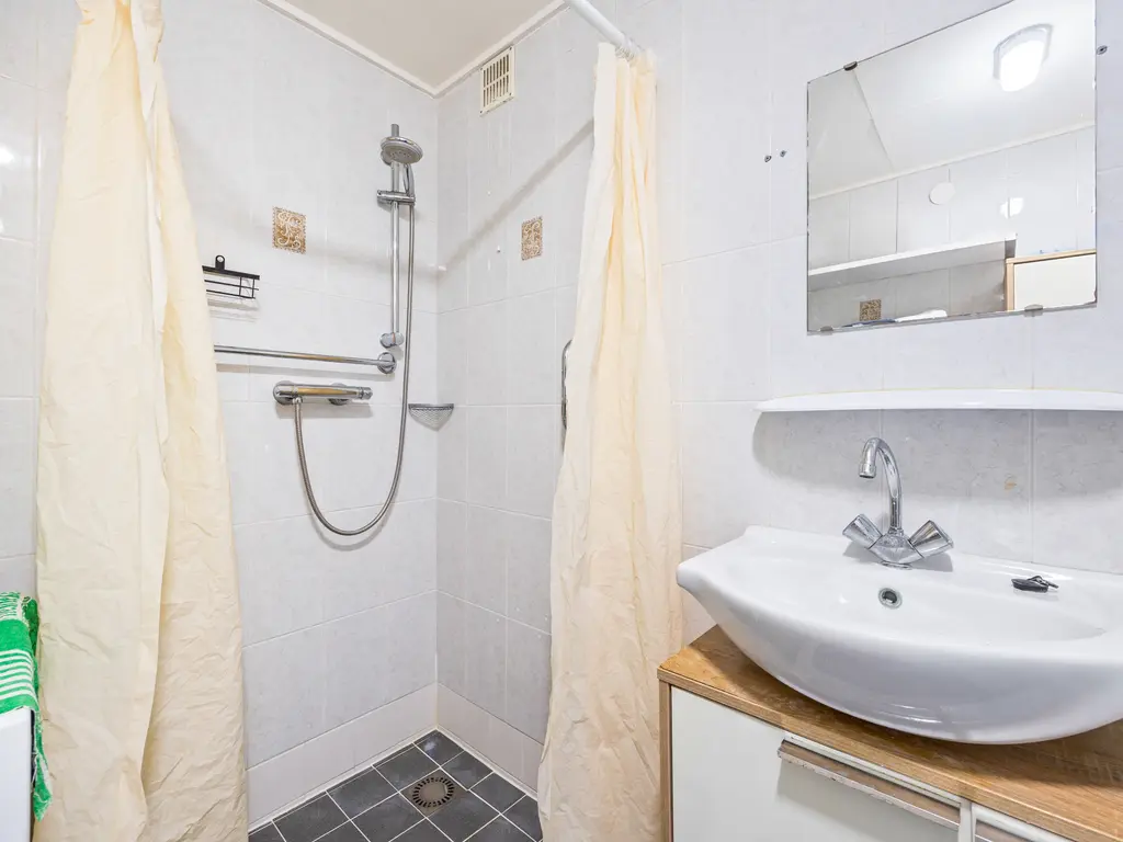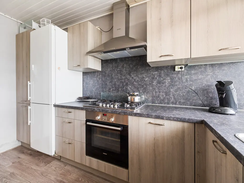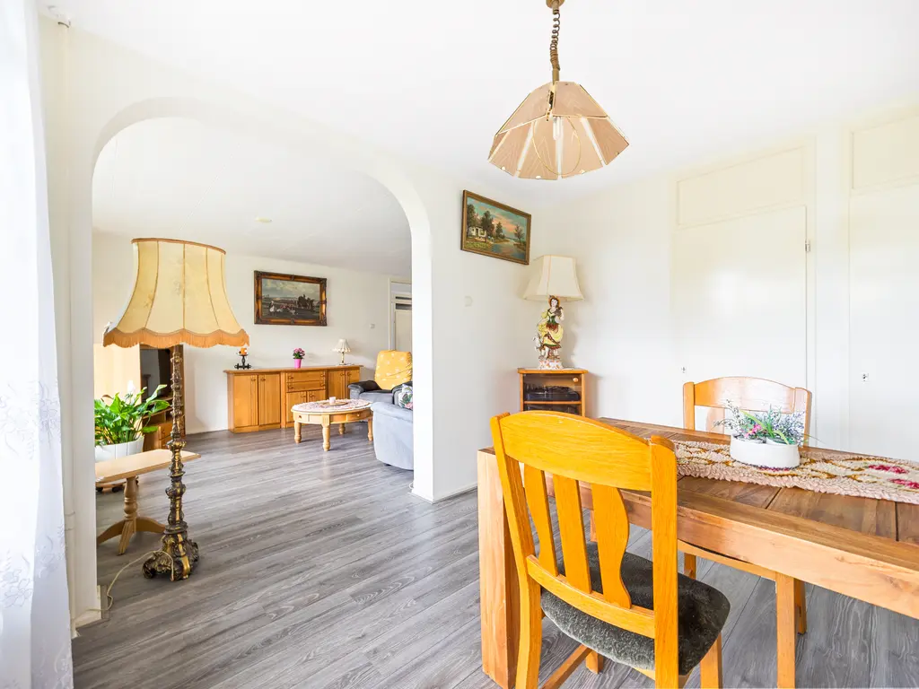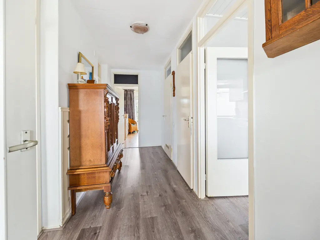 Through the entrance hall you enter the corridor. From here you have access to the kitchen (gallery side), bathroom, toilet (with wash basin), two bedrooms and the living room. The kitchen is equipped with a five-burner gas hob with extractor hood, oven, dishwasher (Siemens) and fridge-freezer combination. The bathroom has a shower, wash basin with cabinet and washing machine connection. The boiler is also located here. At the rear is the spacious and bright living room with adjoining dining room with built-in cupboards. Through a door and corridor from the living room you reach the third bedroom and a spacious storage room where the meter cupboard is located. From the living room, dining room and bedroom at the rear you have access to the sunny balcony across the full width.