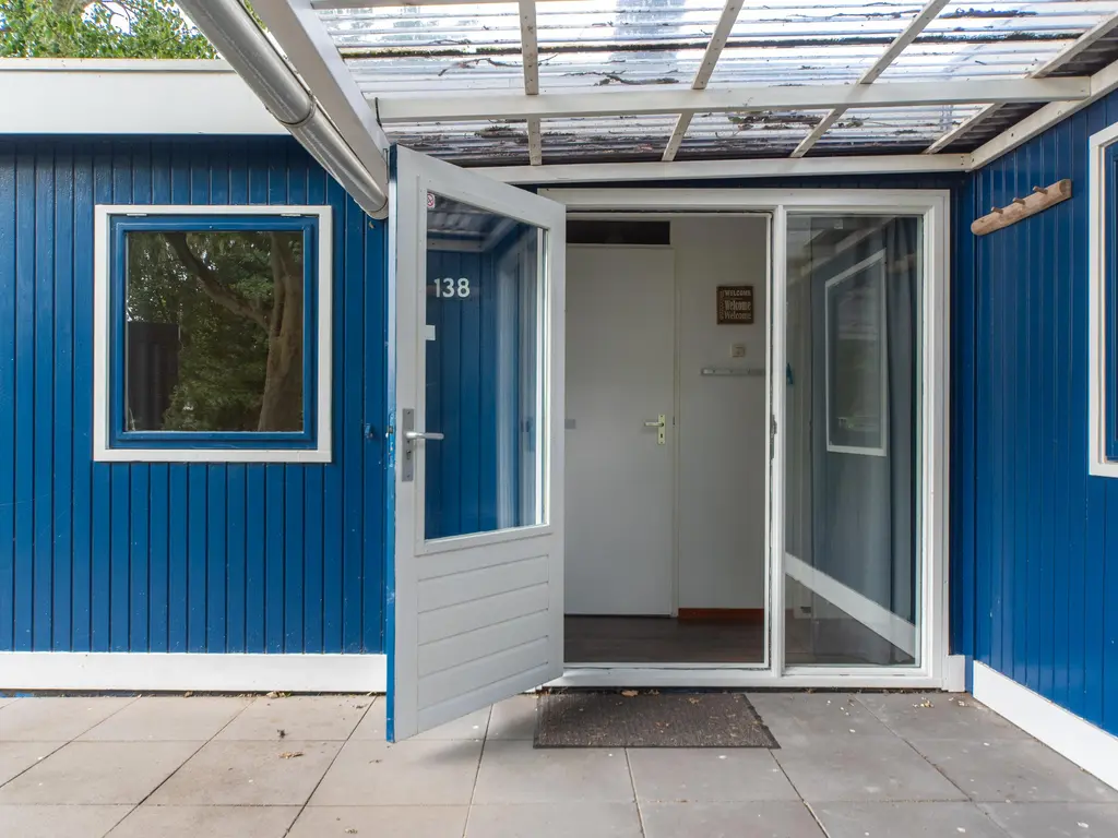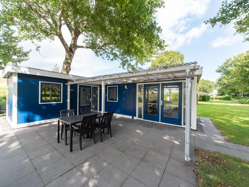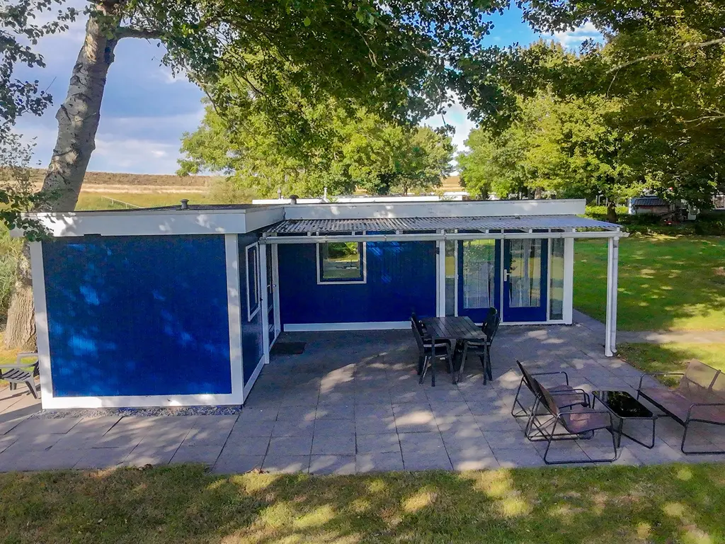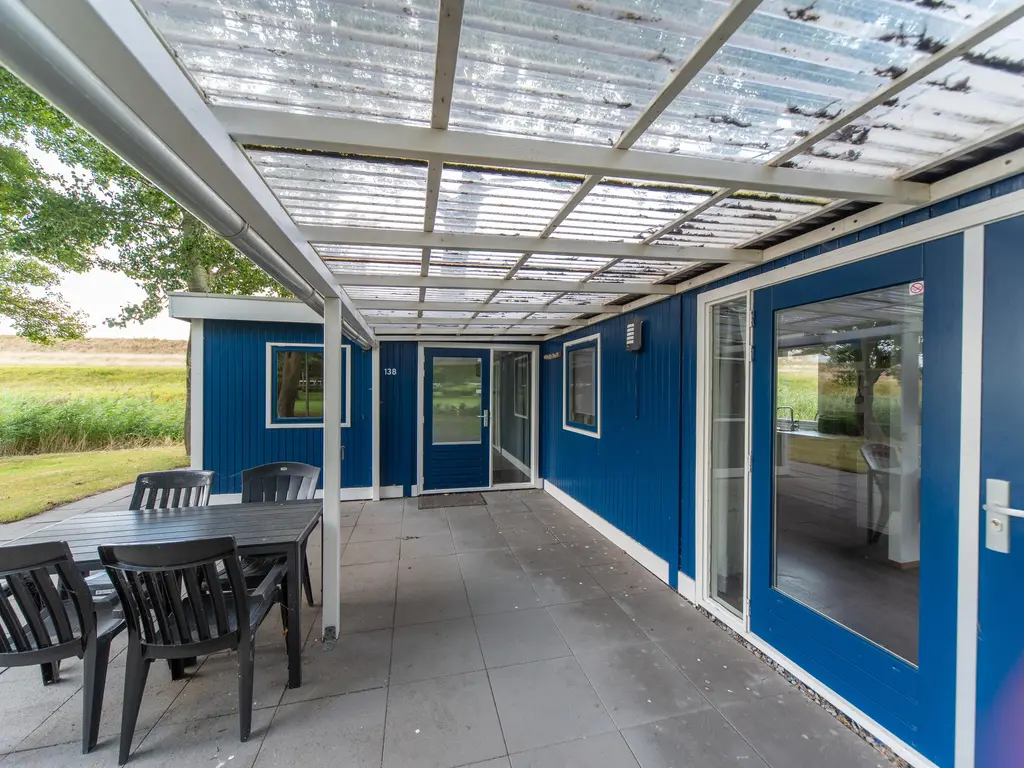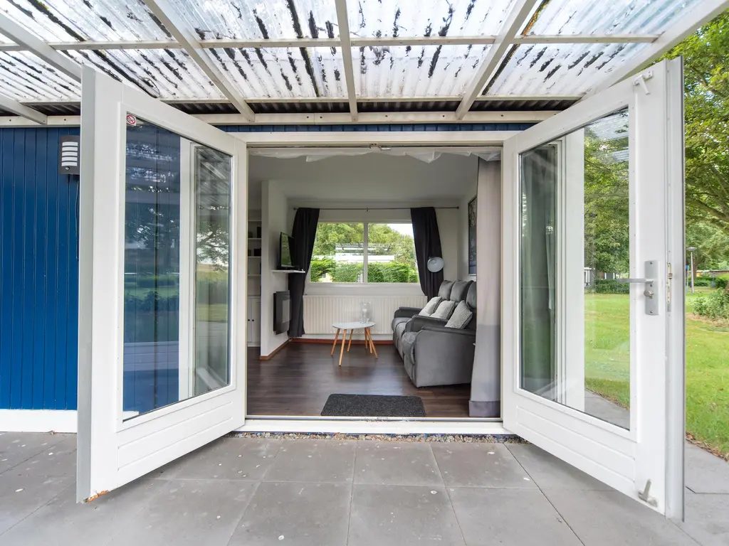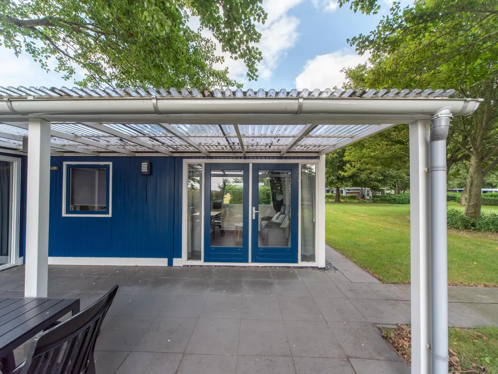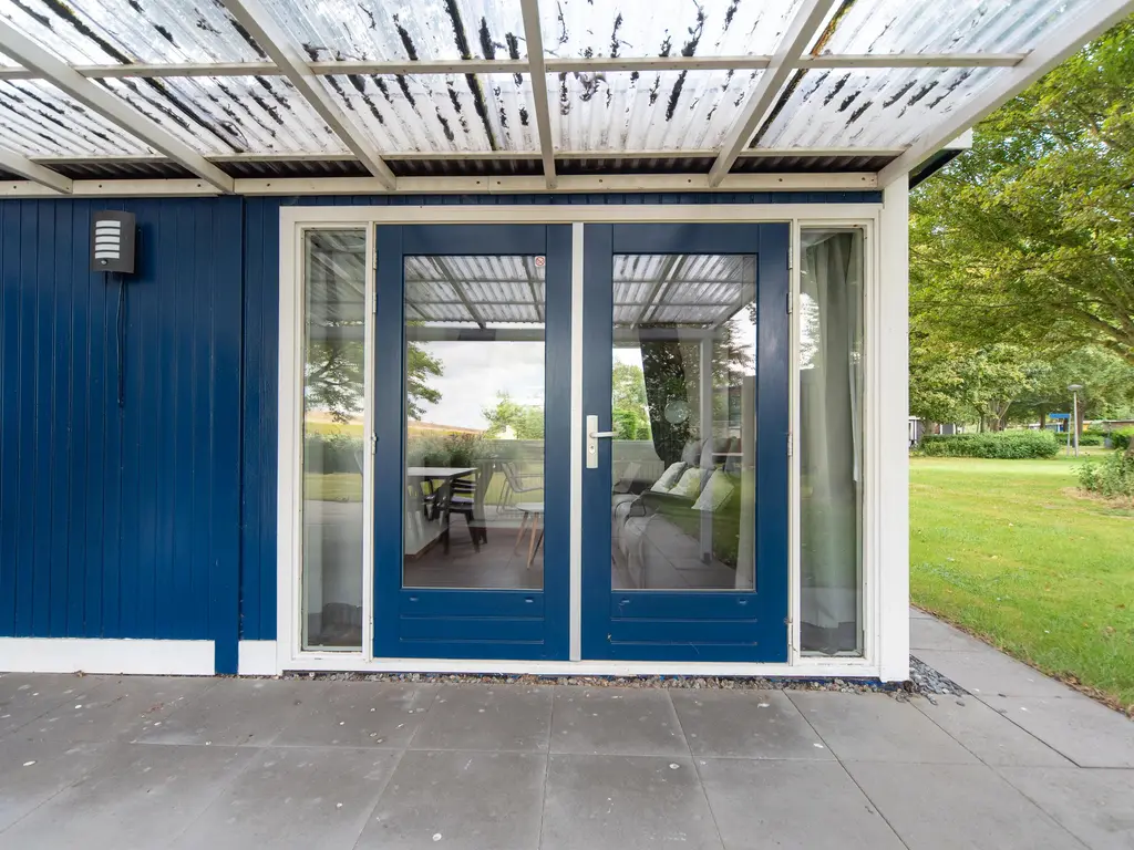 Aan de zijkant bevindt zich over de gehele lengte van het chalet een overkapping boven het betegelde terras, de openslaande deuren en de voordeur. Erg makkelijk als u met volle boodschappentassen tijdens een plotselinge regenbui uw sleutels nog moet zoeken om de voordeur open te maken of een mogelijkheid om toch het wasrek nog even buiten weg te zetten als het onverhoopt gaat regenen.