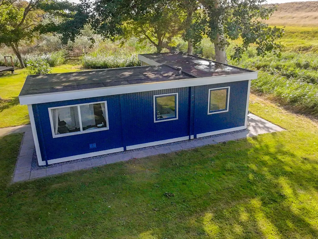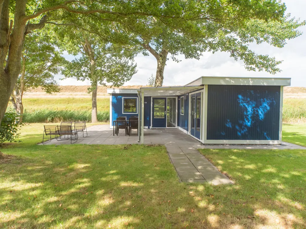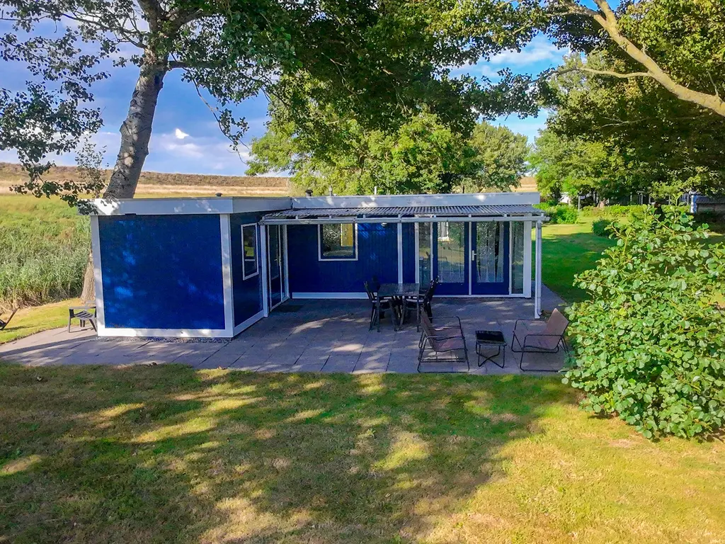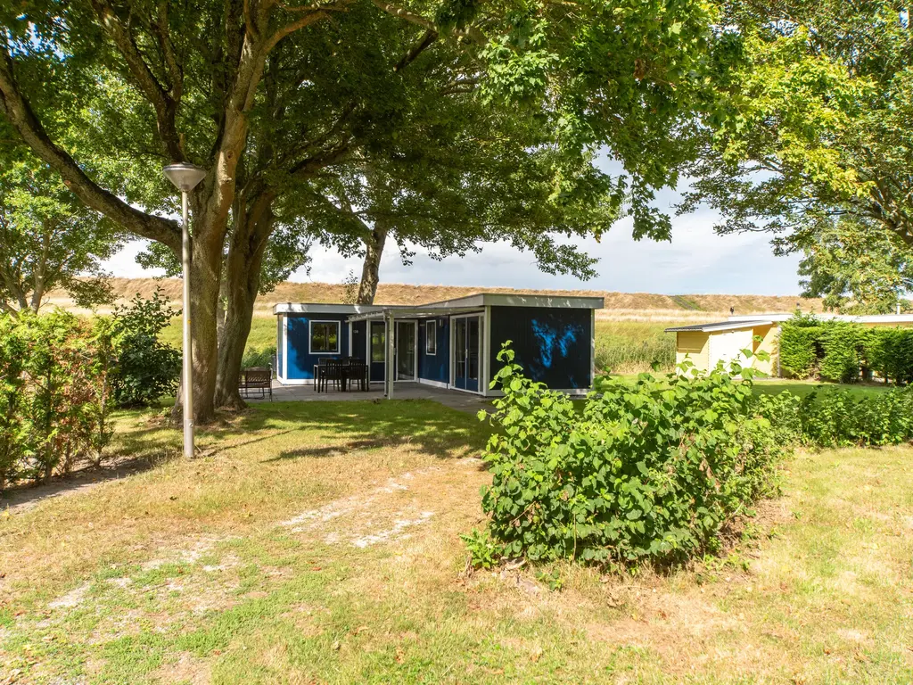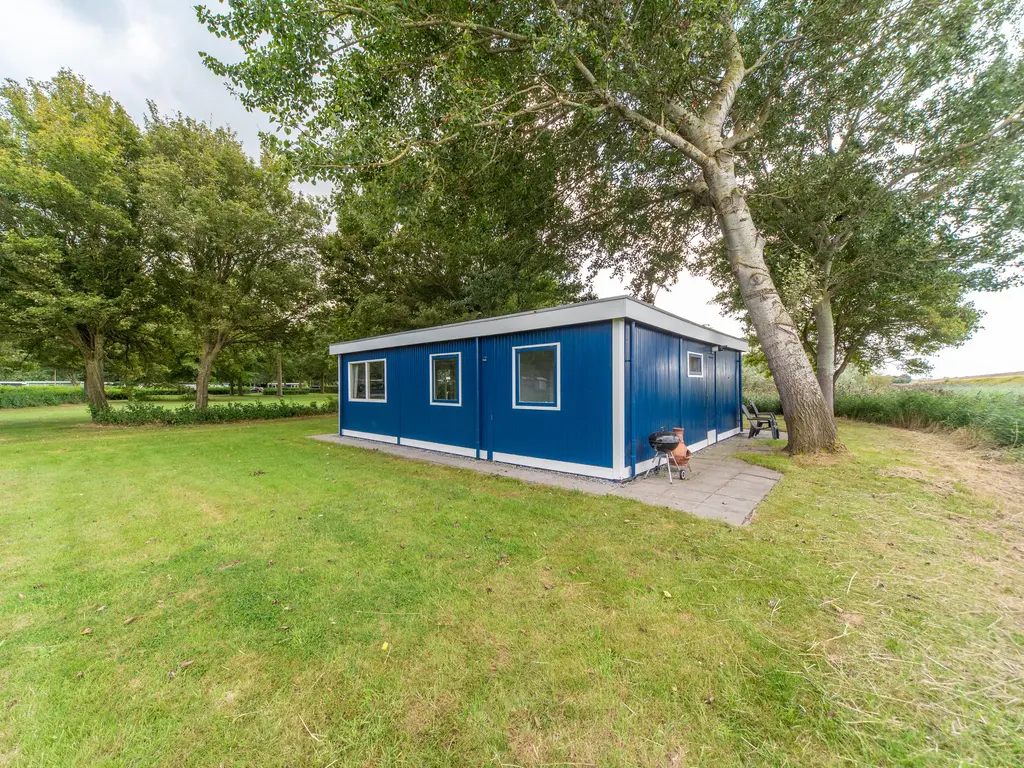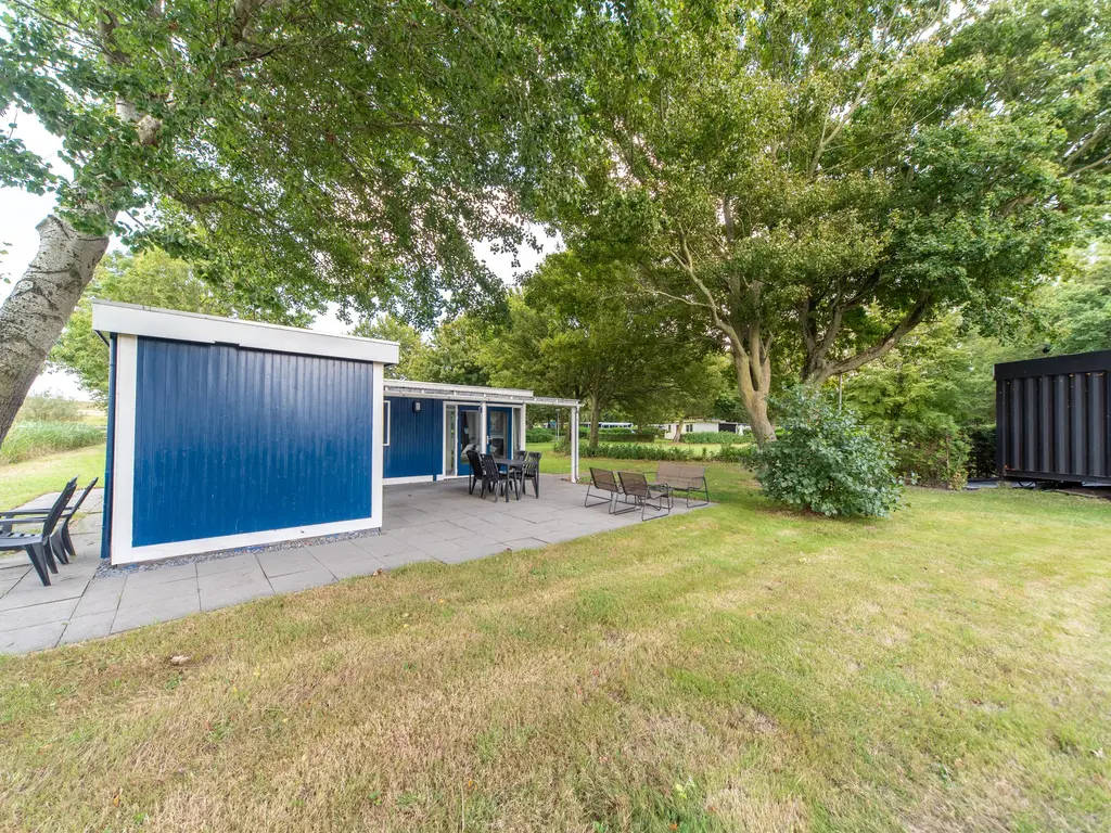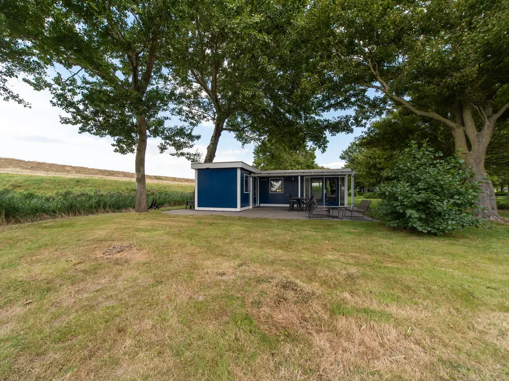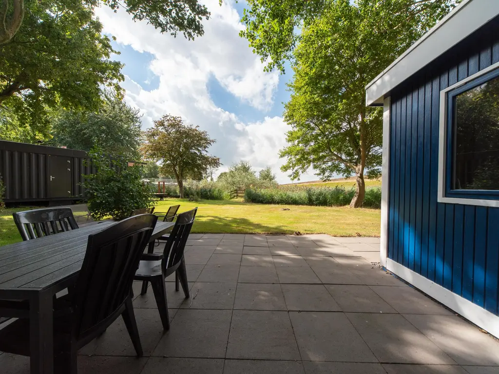 Aan de zijkant bevindt zich over de gehele lengte van het chalet een overkapping boven het betegelde terras, de openslaande deuren en de voordeur. Erg makkelijk als u met volle boodschappentassen tijdens een plotselinge regenbui uw sleutels nog moet zoeken om de voordeur open te maken of een mogelijkheid om toch het wasrek nog even buiten weg te zetten als het onverhoopt gaat regenen.