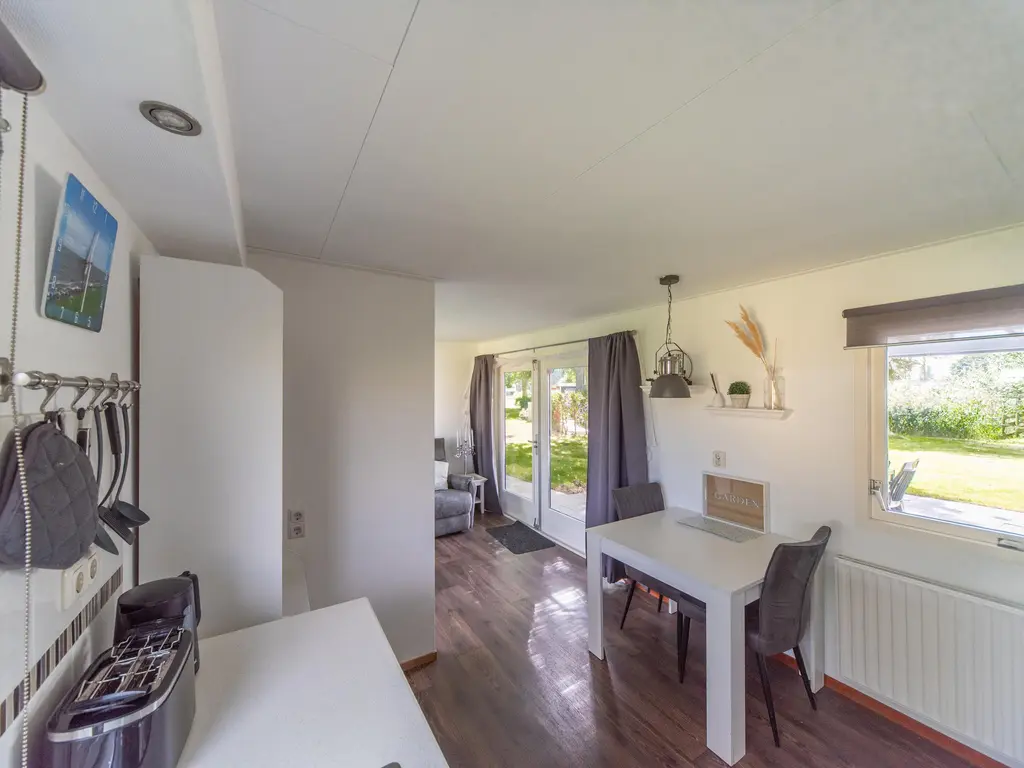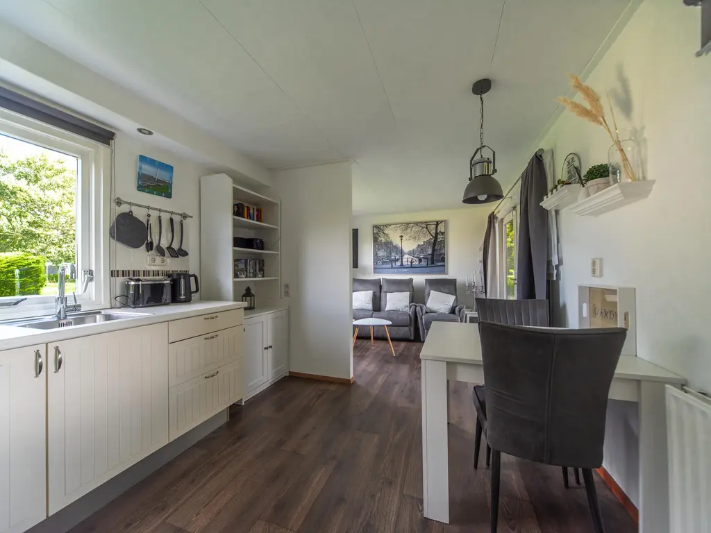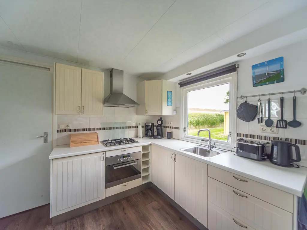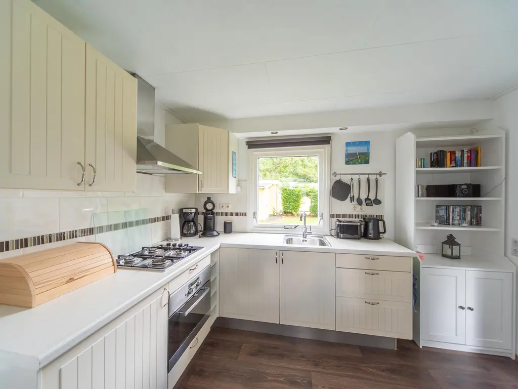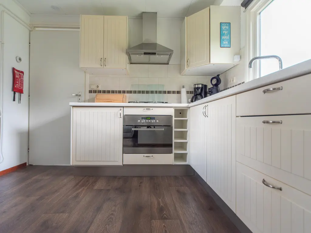 De keuken is van alle gemakken voorzien zoals een (compacte) vaatwasser, gaskookplaat, afzuigkap, oven en zelfs aan de klein huishoudelijke apparaten is gedacht. Zo vindt u hier onder meer een koffiezetapparaat, waterkoker en broodrooster. De keuken is uitgevoerd in een tijdloze witte kleur die nog jaren mee kan. Op de vloer zien we een contrasterende donkere houten laminaatvloer die prima onderhouden is en makkelijk schoon te maken is.