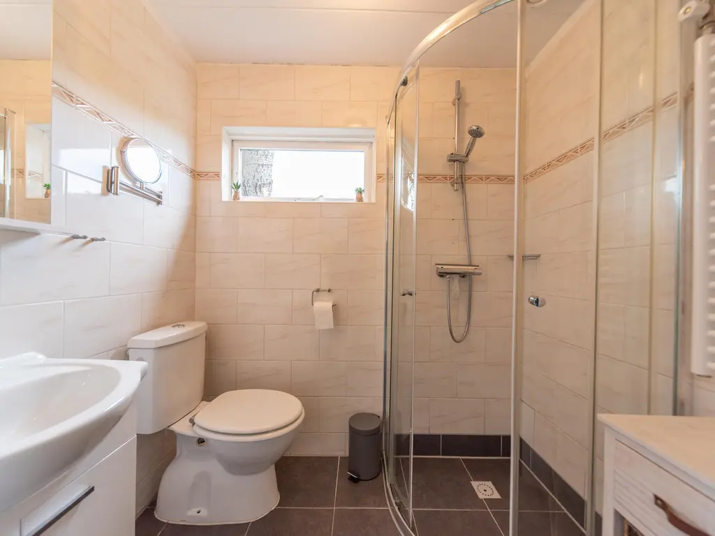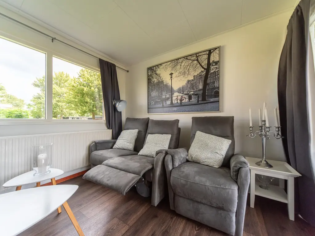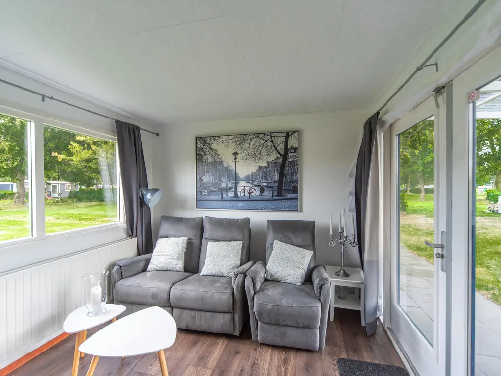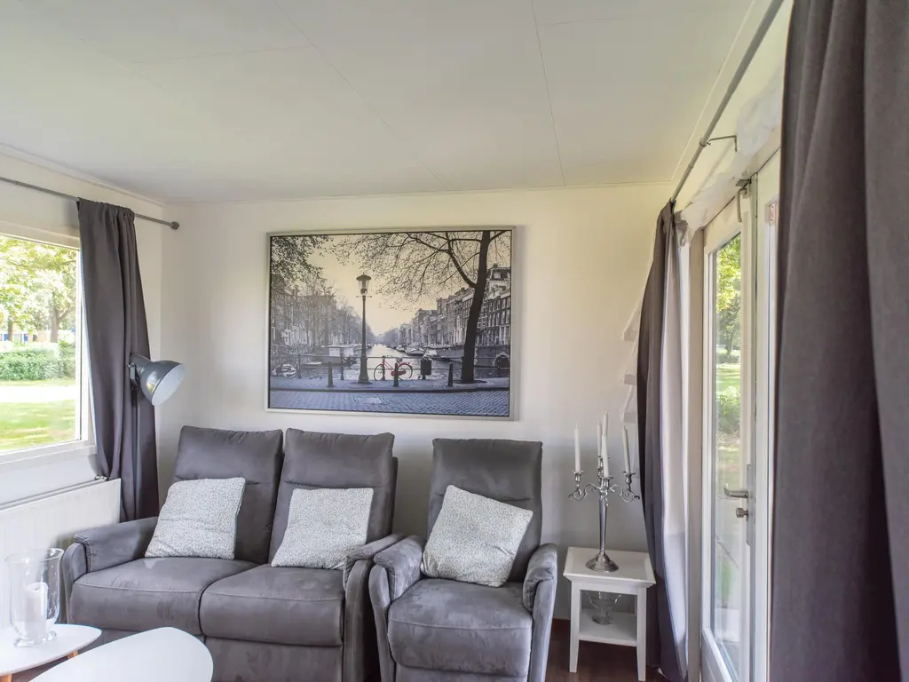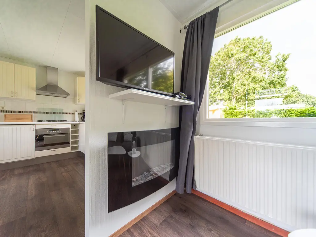 De huidige bewoners laten het chalet zoals gezegd volledig gemeubileerd achter, dus ook het recent gekochte bankstel en de stoel die beide voorzien zijn van elektrisch ingebouwde voetensteun blijven net als de TV en sierhaard gewoon achter in de woonkamer die zeker voor een chalet, mooi van formaat is. De woonkamer heeft ook nog 2 openslaande deuren naar het overdekte zonneterras, waar u ook heerlijk kunt vertoeven aan de kunststof tuin set of languit onderuit kunt op de lounge set die aanwezig is.