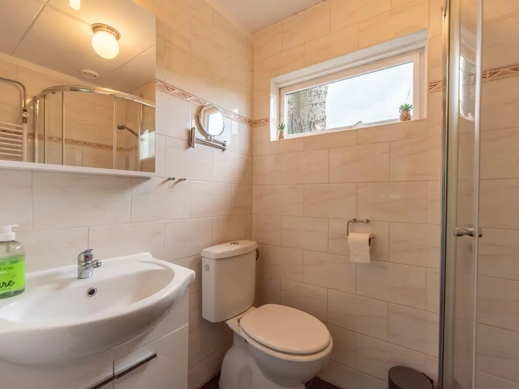 De hal biedt ook toegang tot de bergruimte waar de CV-combiketel nu hangt, maar deze ruimte zou u ook kunnen gebruiken om bijvoorbeeld een wasmachine te plaatsen. De badkamer is prima van formaat en is voorzien van een douche, toilet, badkamer meubel met wasbak. spiegel en planchet en zelfs hier hangt een radiator waar u uw handdoek op kunt drogen na het douchen.