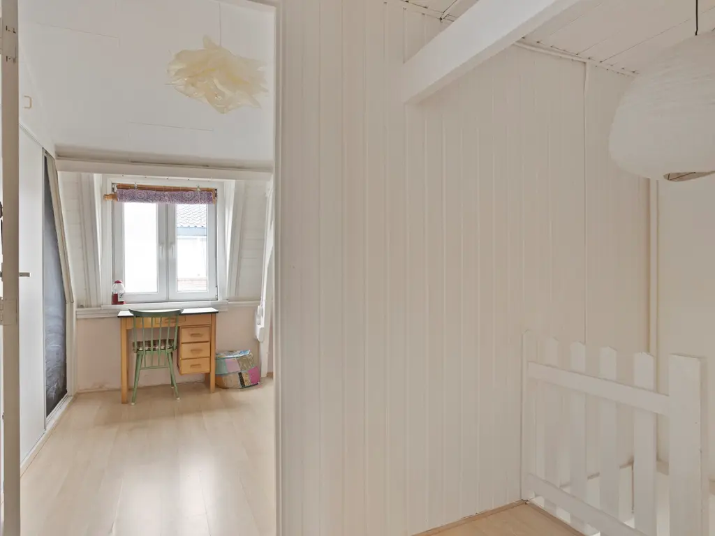 De ruime overloop geeft toegang tot twee slaapkamers. De slaapkamer aan de achterzijde is royaal van formaat en kan eventueel worden opgesplitst in twee kamers. De slaapkamer aan de voorzijde beschikt over een inbouwkast. Op de overloop bevindt zich daarnaast een separaat toilet met fonteintje.