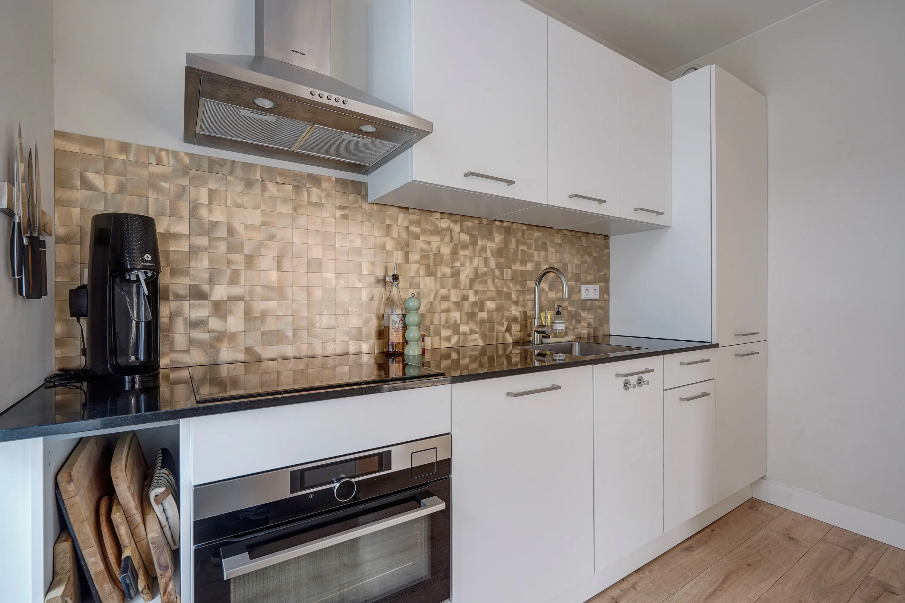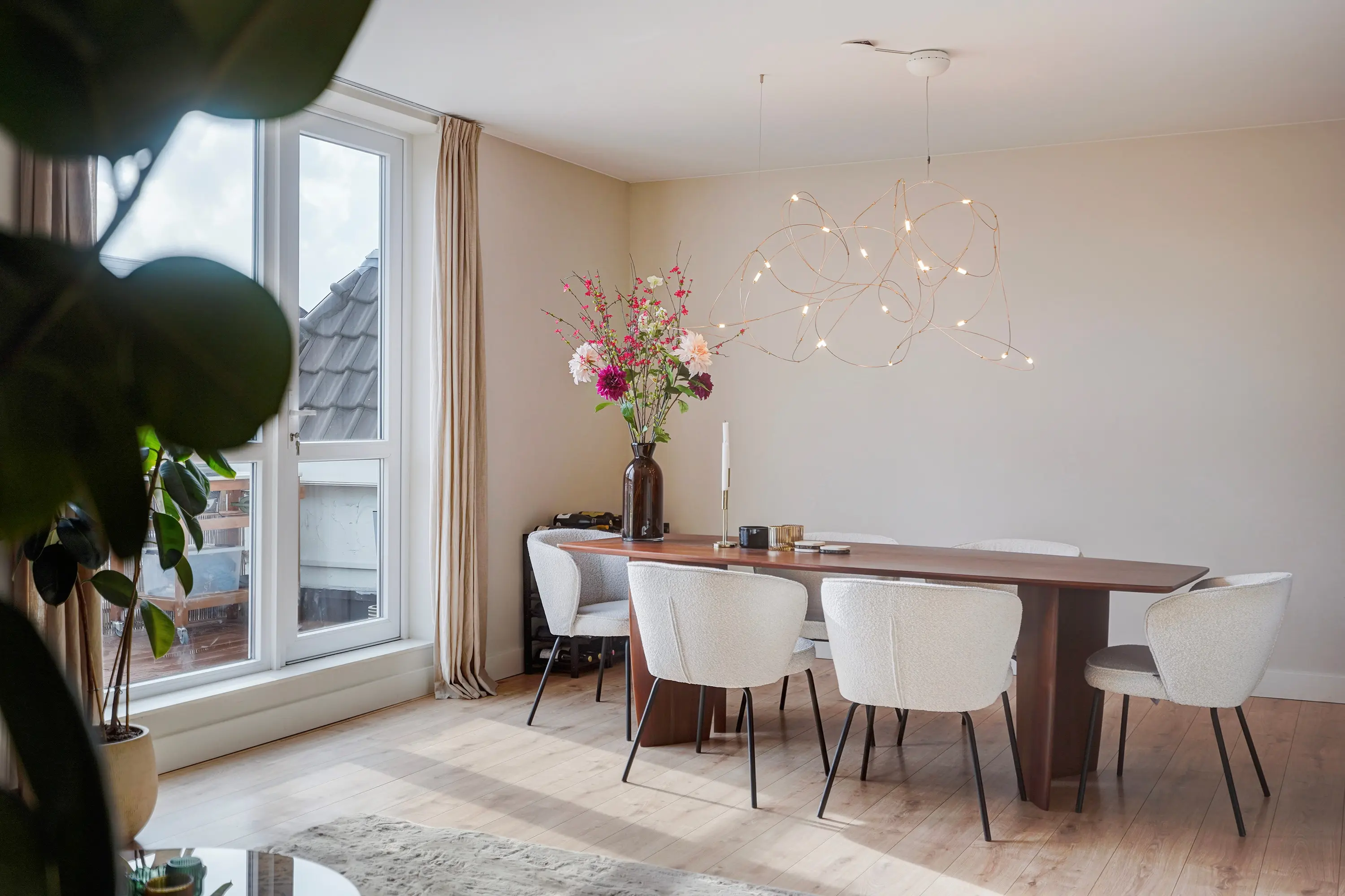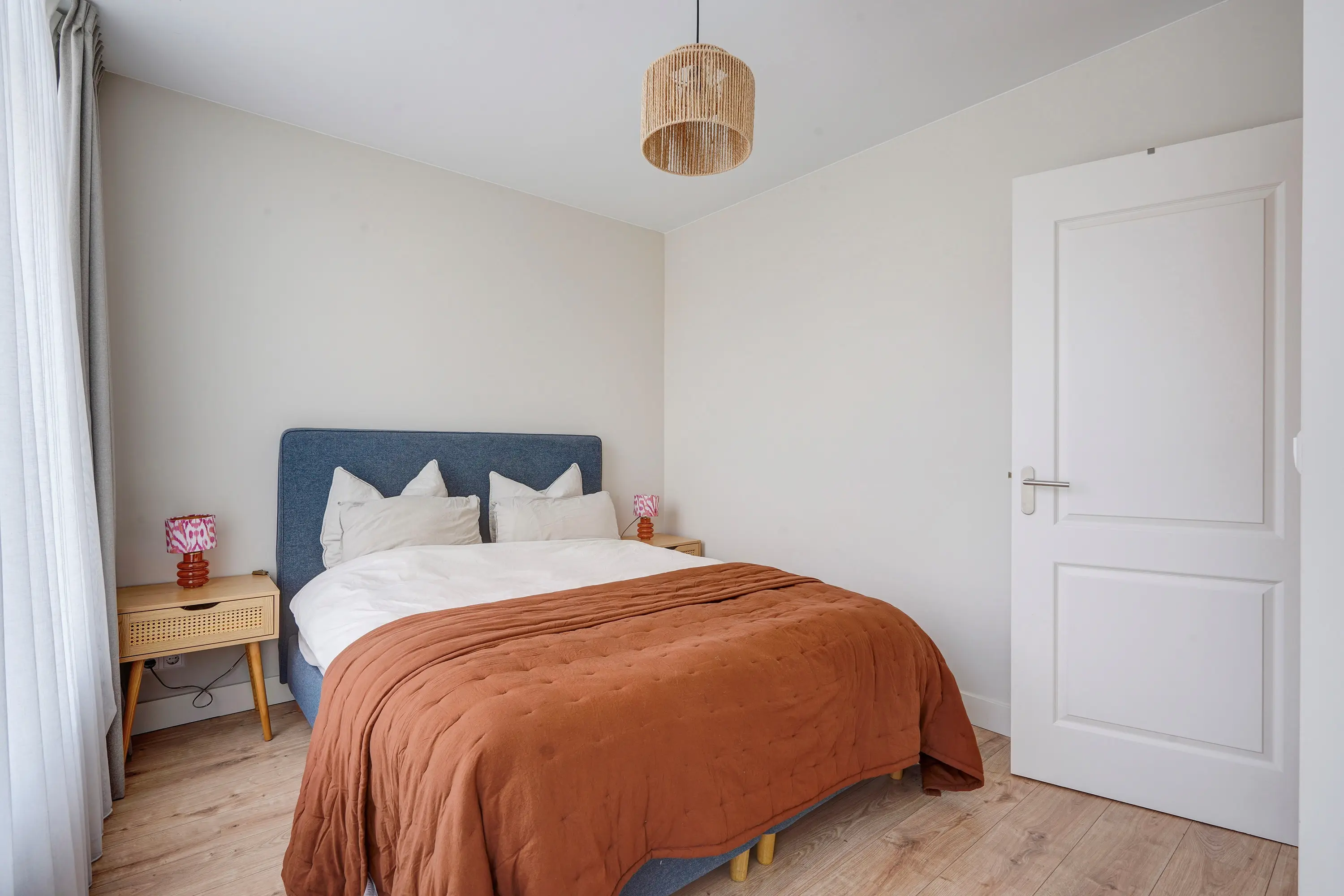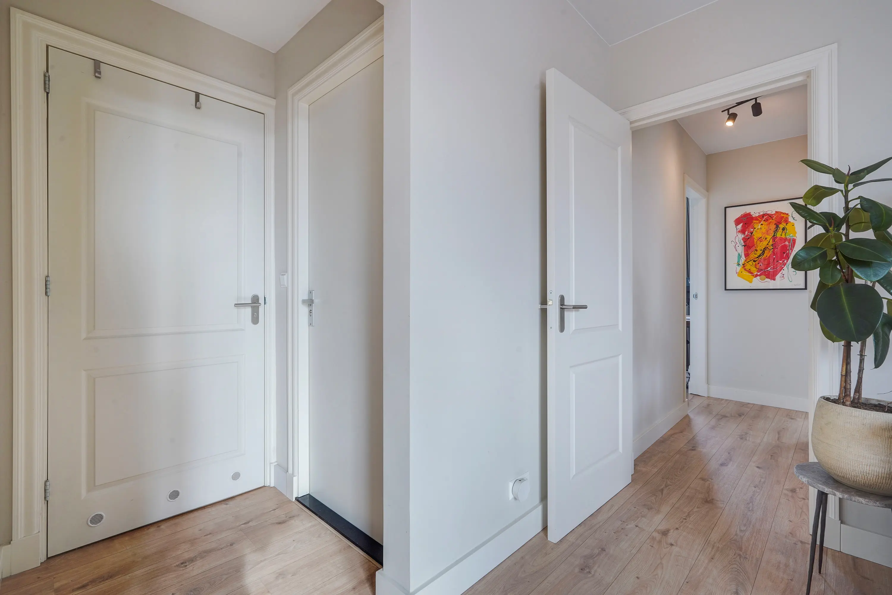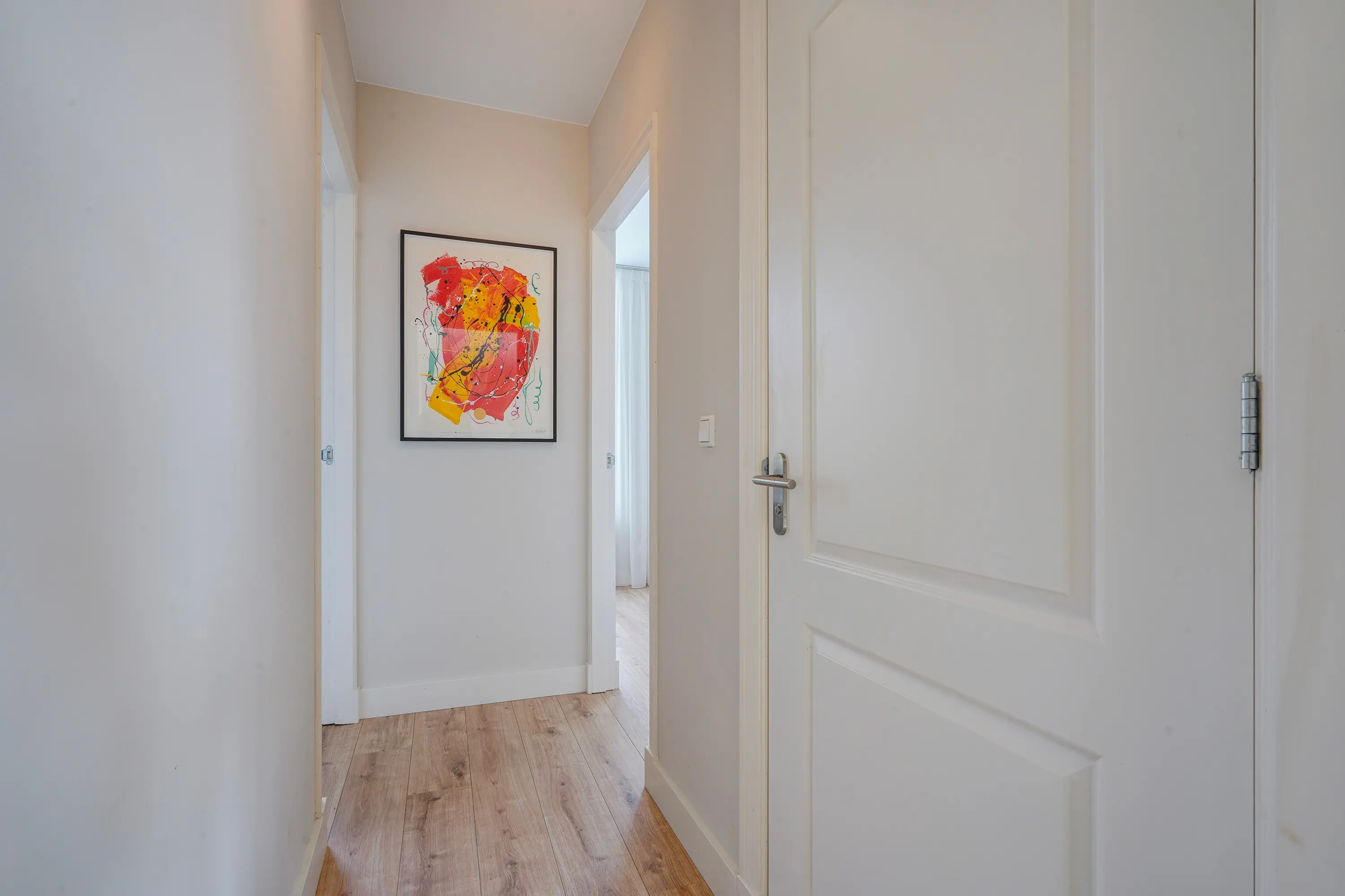 Through the entrance on the ground floor, you reach the first floor where there is a spacious separate bedroom. Via the staircase, you reach the second floor. Landing with entrance to the apartment. Hallway with access to a modern toilet with a small sink and a spacious, bright living room. From the living room, you enter the semi-open kitchen with new kitchen appliances and a separate storage and laundry closet. From the living room, you also access a sunny and spacious roof terrace (south-east). A second hallway from the living room provides access to 2 bedrooms and a modern bathroom with a walk-in shower, vanity unit, and towel radiator.
