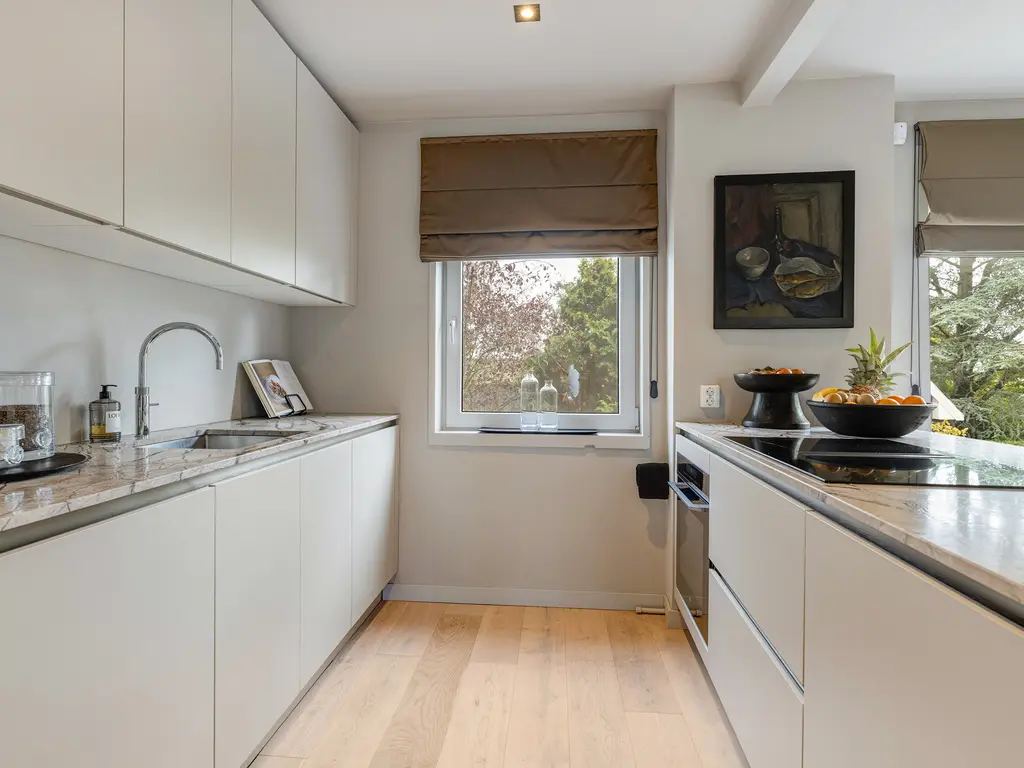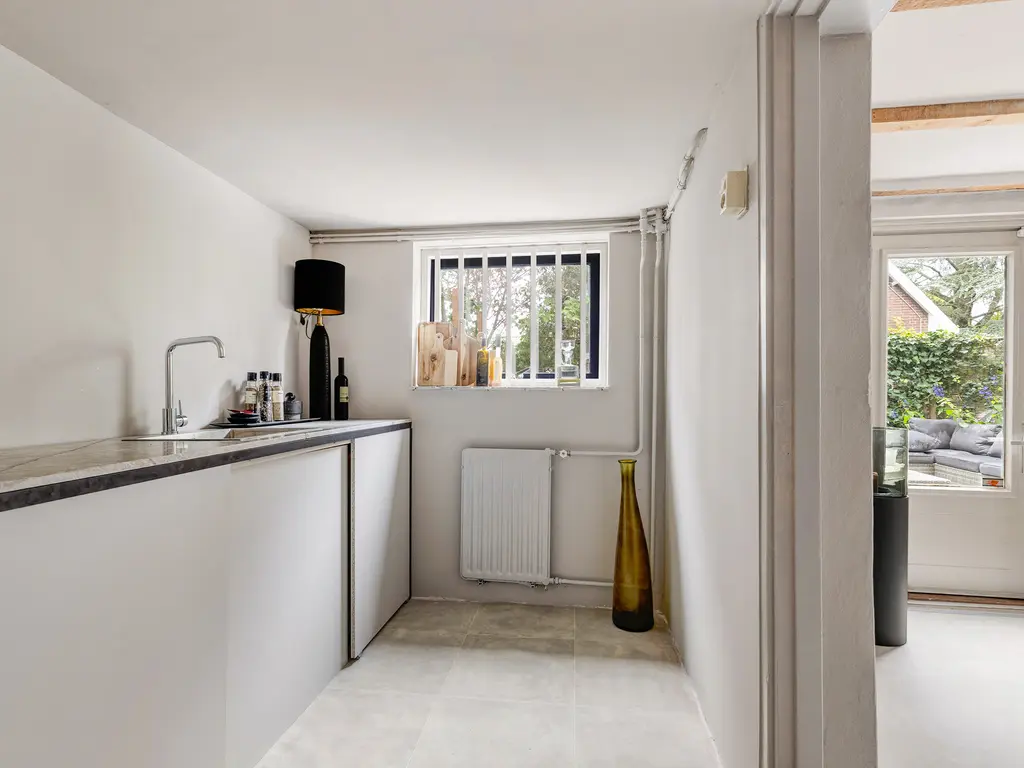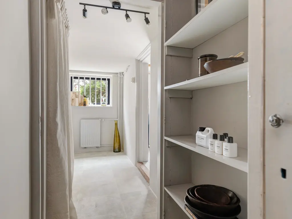 Het onderhuis is praktisch en stijlvol ingericht met een nieuwe keuken voorzien van hetzelfde marmeren aanrechtblad als op de woonverdieping. Er is een handige kast voor wasmachine en droger plus extra bergkast. Deze ruimte is ideaal als hobbyruimte, werkplek of tweede leefruimte.
