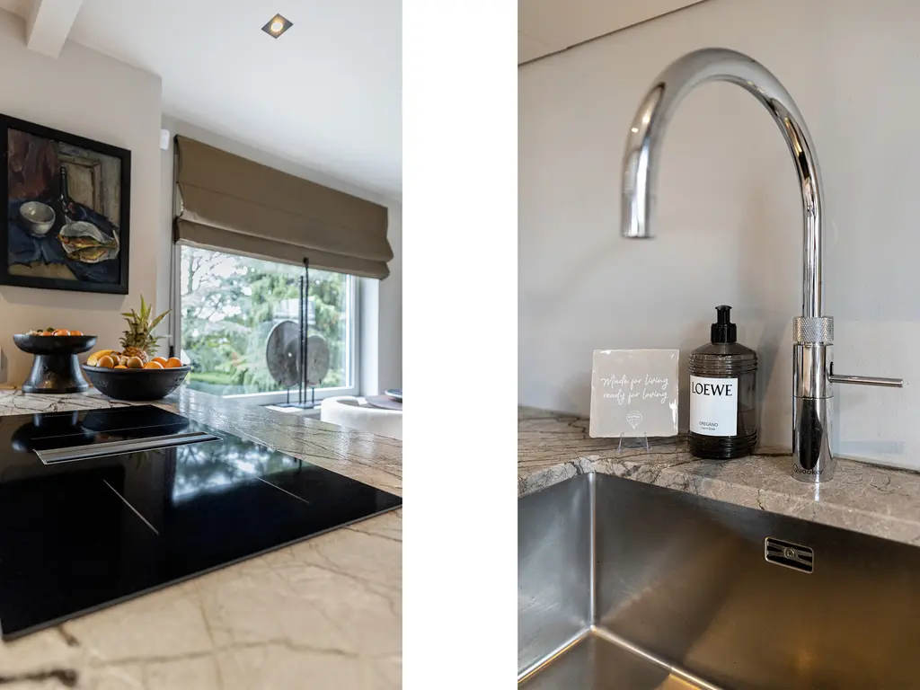Luxe open keuken met marmeren aanrecht, inductiekookplaat met geïntegreerde afzuiging, Quooker, vaatwasser, koelkast en combi-oven
