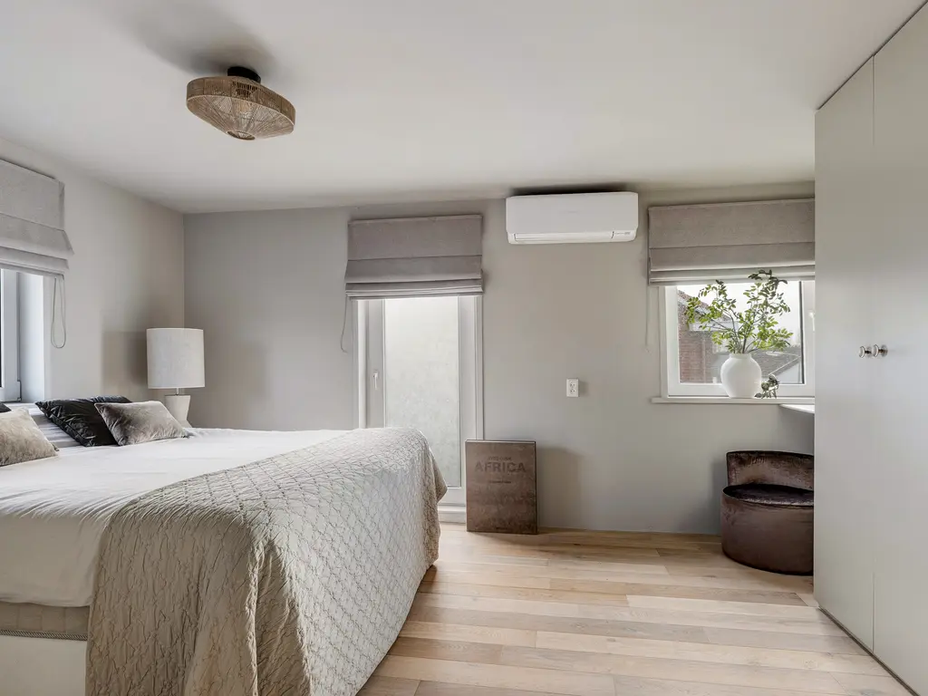Op de eerste verdieping bevinden zich twee slaapkamers, beide voorzien van eikenhouten vloeren en airconditioning in de ouderslaapkamer. De luxe badkamer is volledig vernieuwd, voorzien van elektrische vloerverwarming, een grote inloopdouche, toilet en marmerlook wastafel met meubel en spiegel – stijlvol én comfortabel.