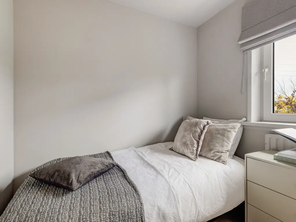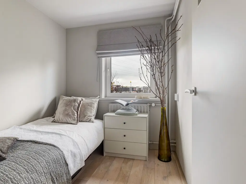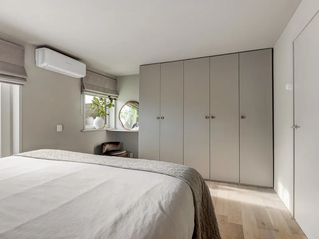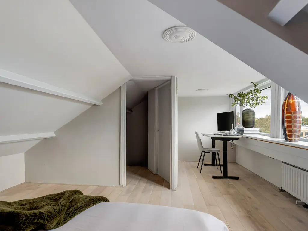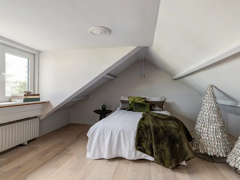 De zolder is een ruime, lichte slaapkamer met grote dakkapel en houten vloer, perfect als extra slaapkamer, werk- of chillruimte. Slimme bergruimte houdt alles netjes en overzichtelijk.