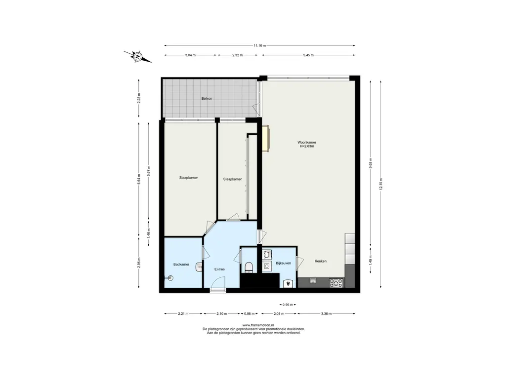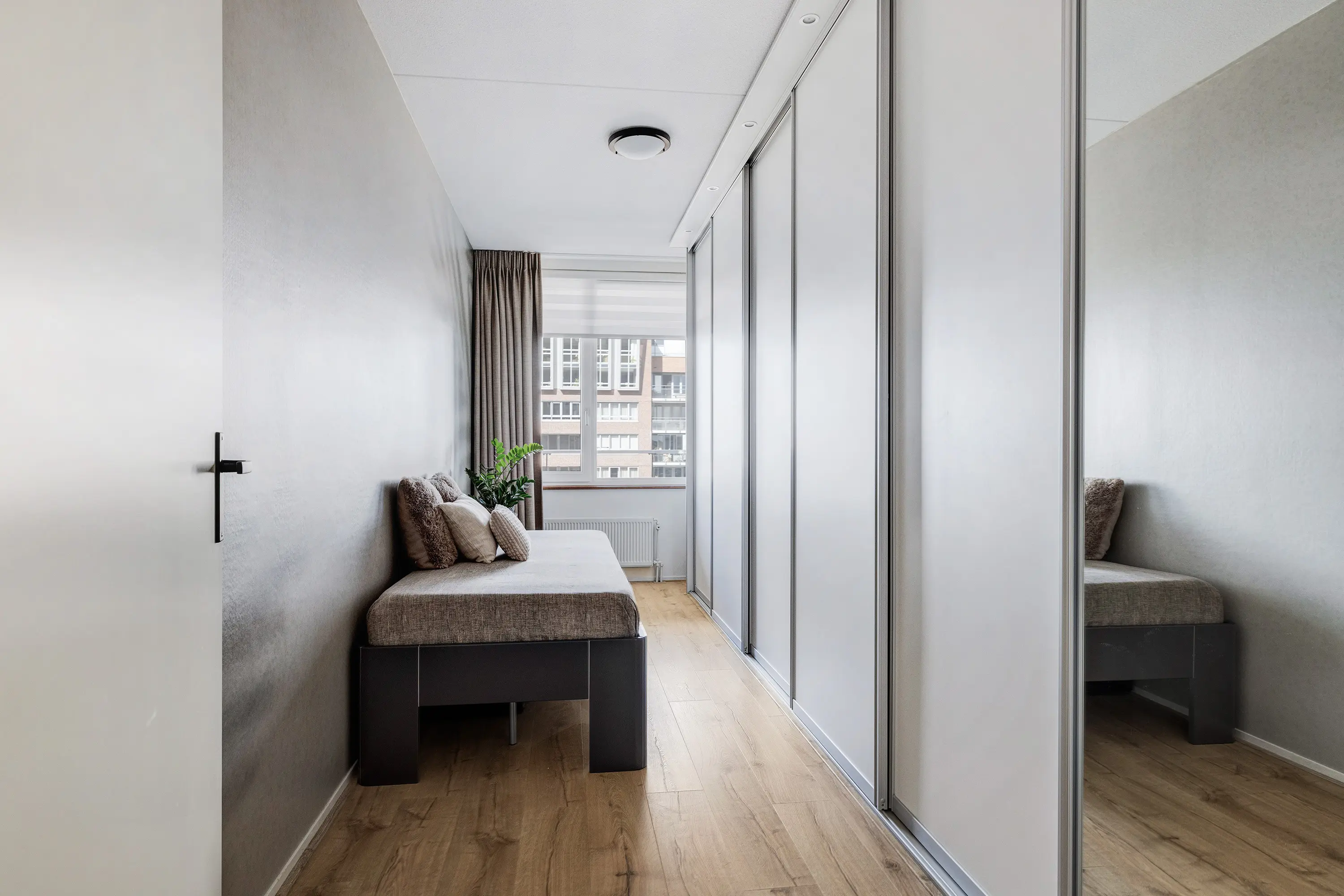 Slaapkamer 2 (ca. 13 m²) heeft een vaste kastenwand over de gehele lange zijde.