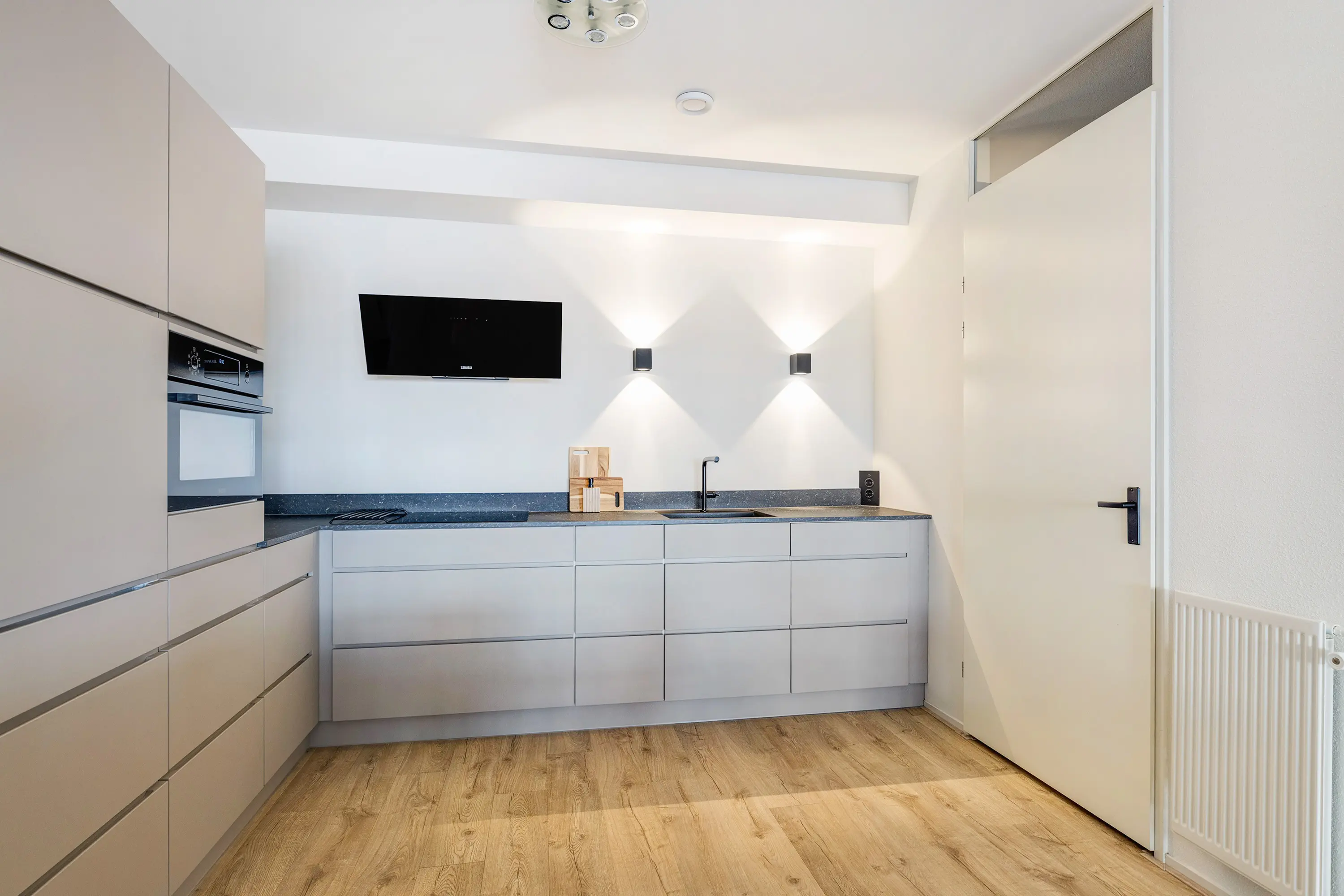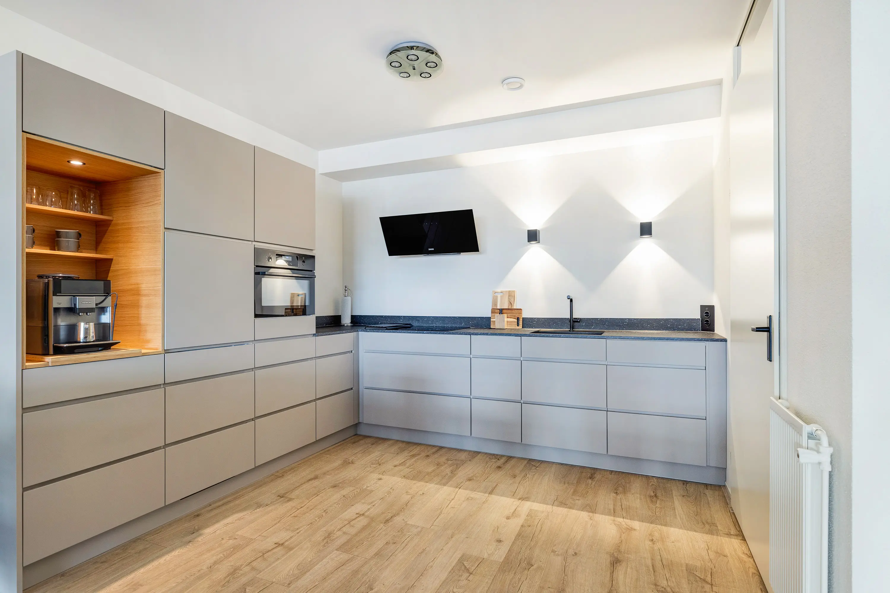 De luxe open keuken (ca. 8 m²) in hoekopstelling is uitgevoerd in beige met een antracietkleurig kunststof aanrechtblad. Uitgerust met o.a. een 4-pits inductiekookplaat, rvs/zwart glazen afzuigkap, koel/vriescombinatie en combi-oven. Ook is er een handige coffeecorner en veel bergruimte. De keuken is voorzien van dimbare inbouwspots met afstandsbediening en heeft strak gestucte wanden met afwasbare verf. Aansluitend vindt u de praktische bijkeuken met ruimte voor wasmachine, droger, CV-installatie en mechanische ventilatie, plus extra bergruimte.