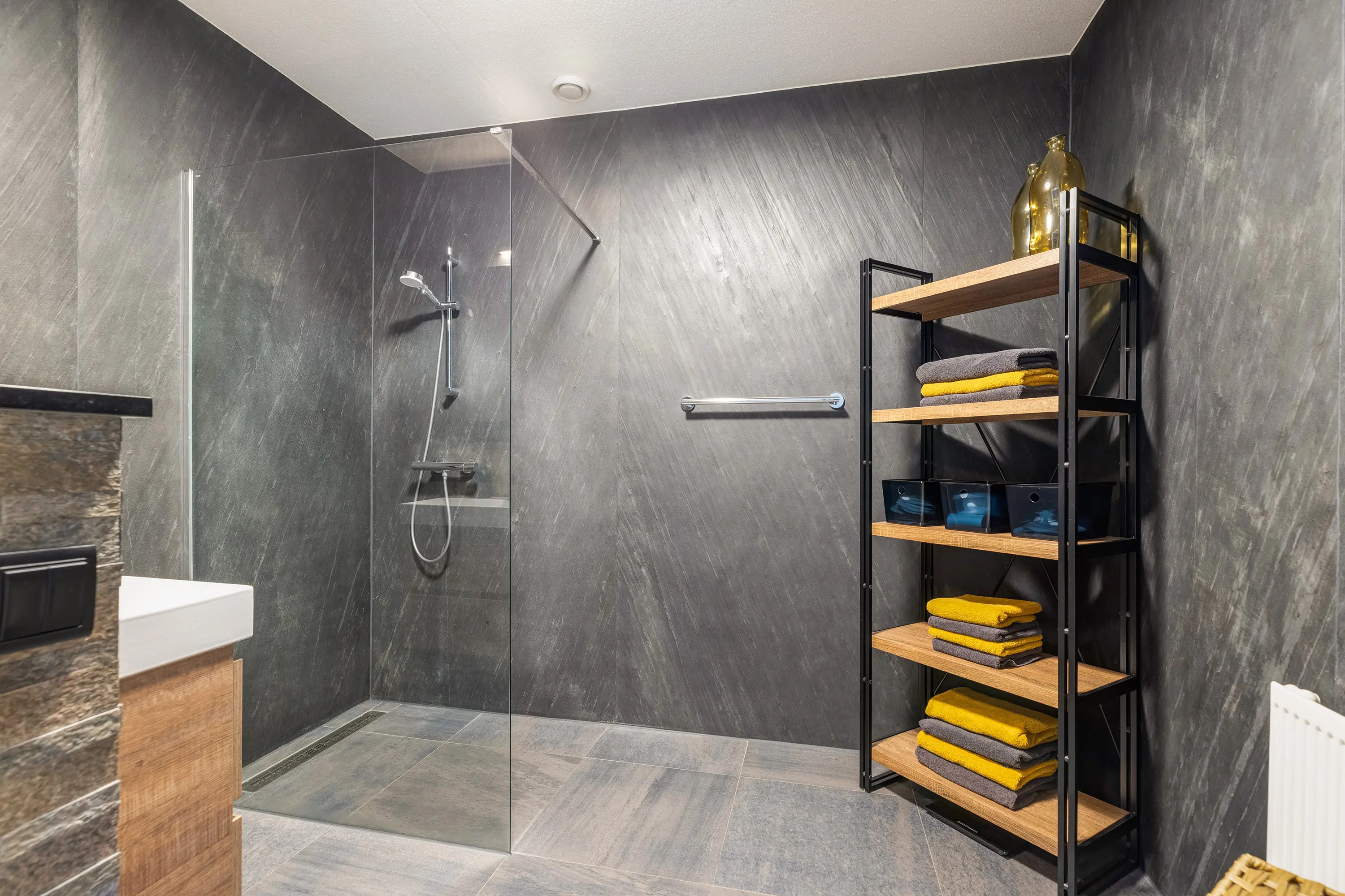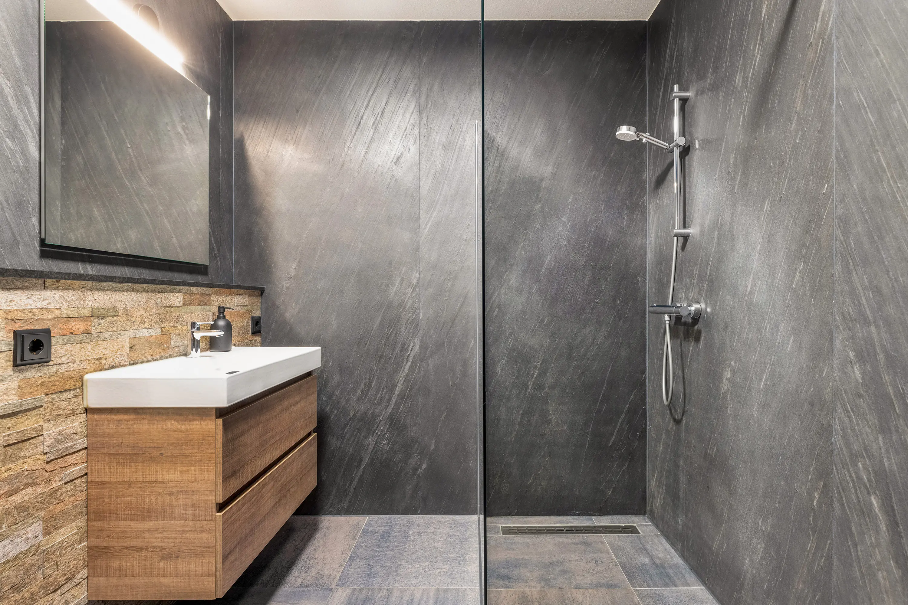 De badkamer (ca. 7 m²) is luxe uitgevoerd met leistenen wandafwerking, een ruime inloopdouche en een modern wastafelmeubel met spiegel inclusief verlichting. De donkere vloer- en wandafwerking geven de ruimte een stijlvolle, hotelwaardige uitstraling.