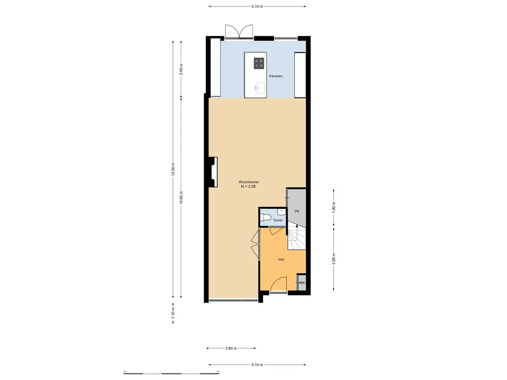 Entree, ruime hal, meterkast, trap naar de 1e verdieping. De sfeervolle trap is afgewerkt met automatisch verlichting. Toiletruimte voorzien van een hangend toilet en fonteintje. De toiletruimte is geheel betegeld in een lichte kleurstelling.