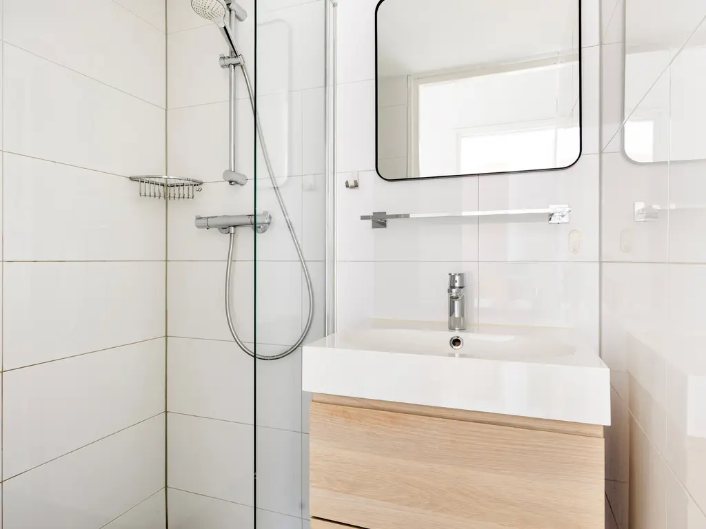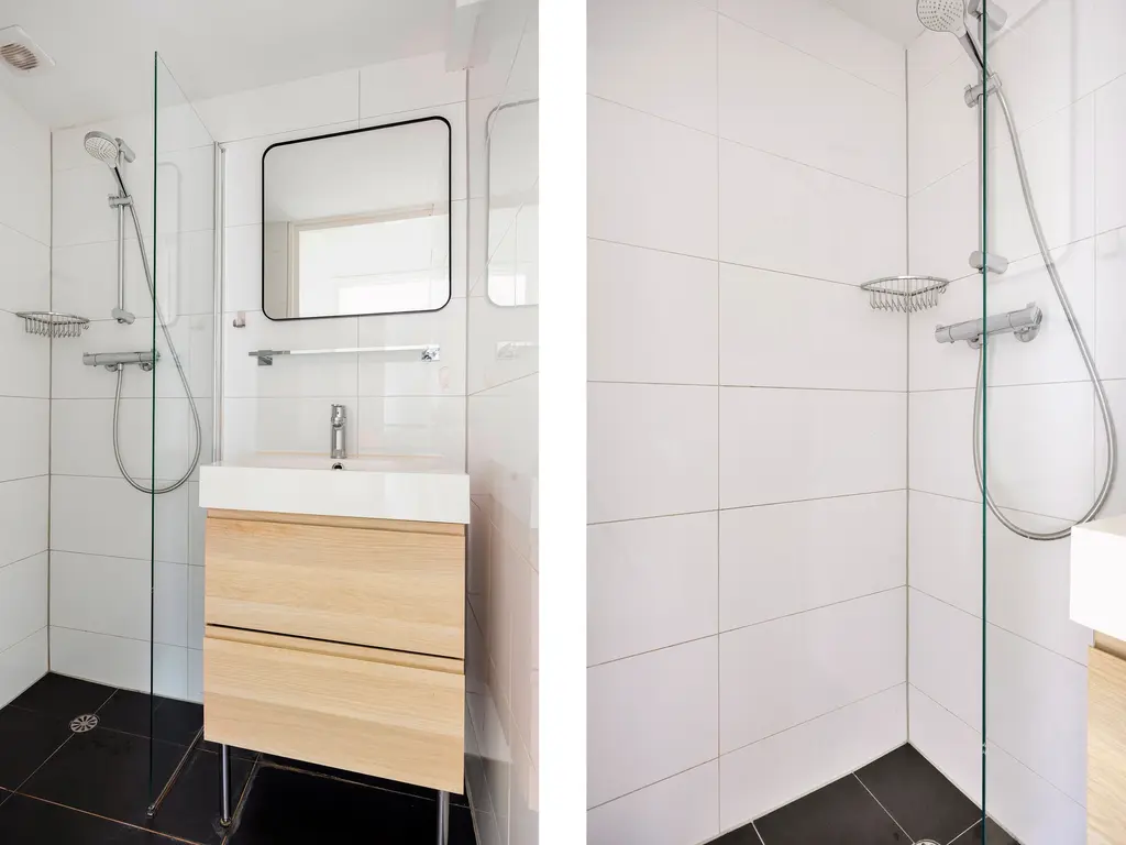 De woning beschikt over een knusse en verzorgde badkamer. De ruimte is praktisch ingericht met een inloopdouche en wastafelmeubel.