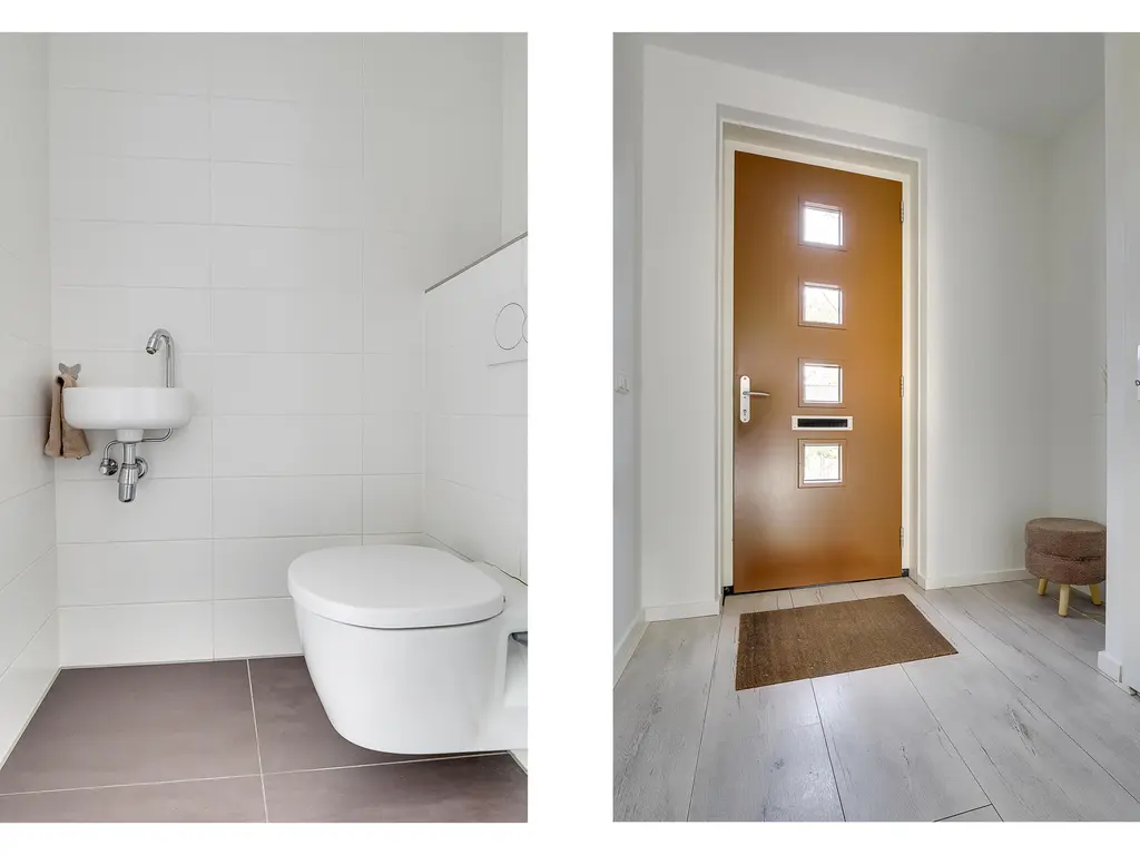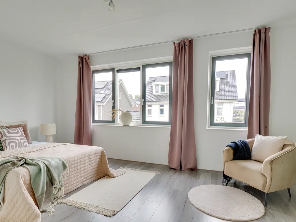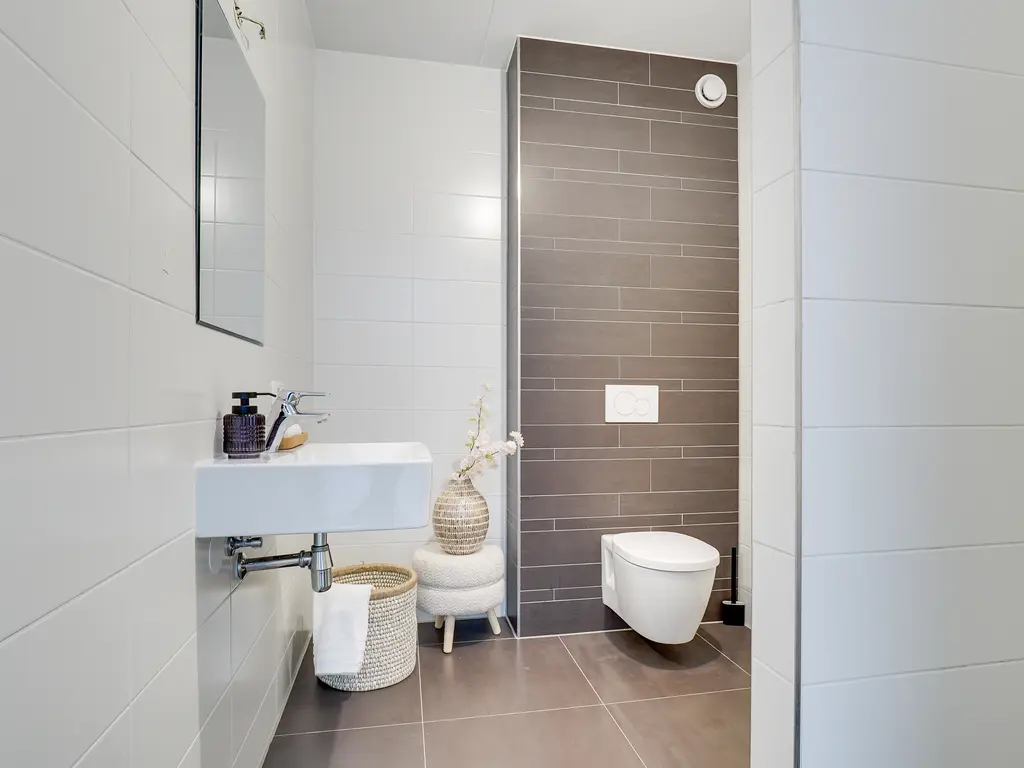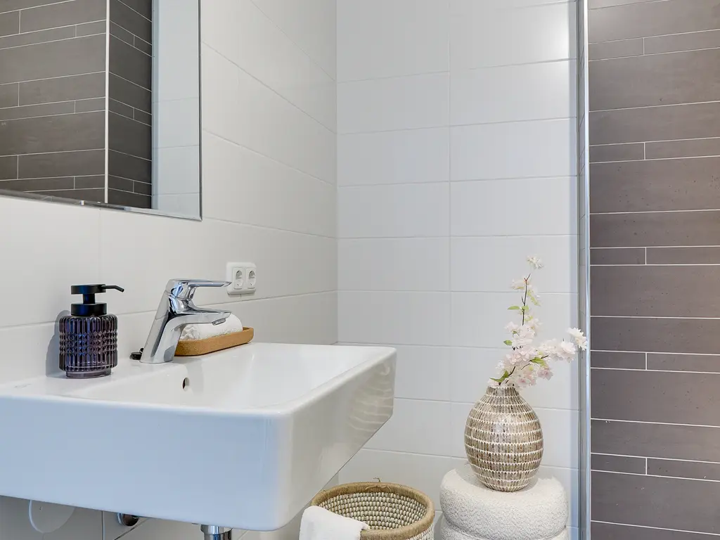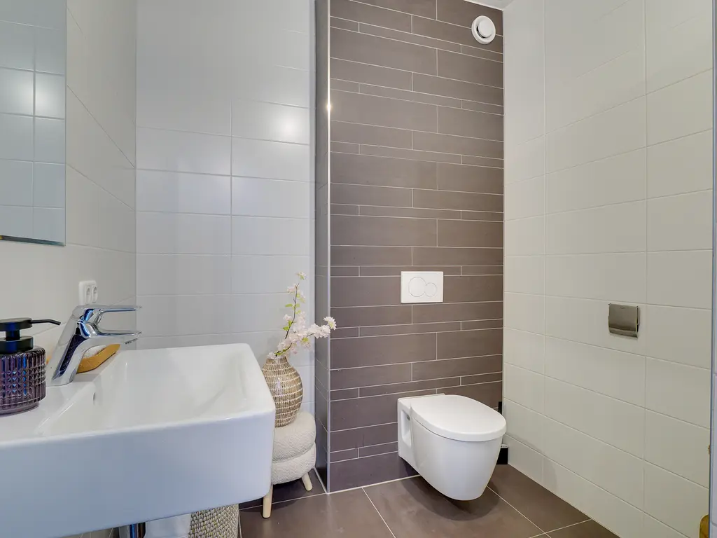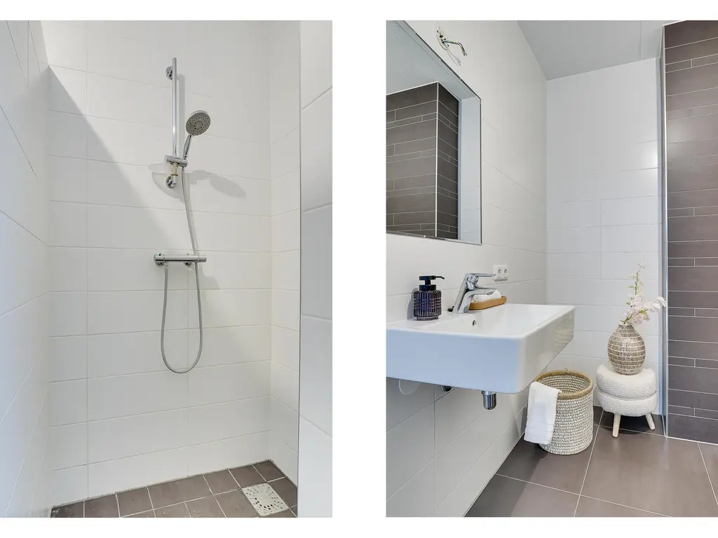 Op de eerste verdieping bevinden zich drie ruime slaapkamers en een nette badkamer. De badkamer is voorzien van een inloopdouche, een enkele wastafel en een toilet. Dankzij de vloerverwarming – net als op alle etages – geniet je hier van extra comfort.